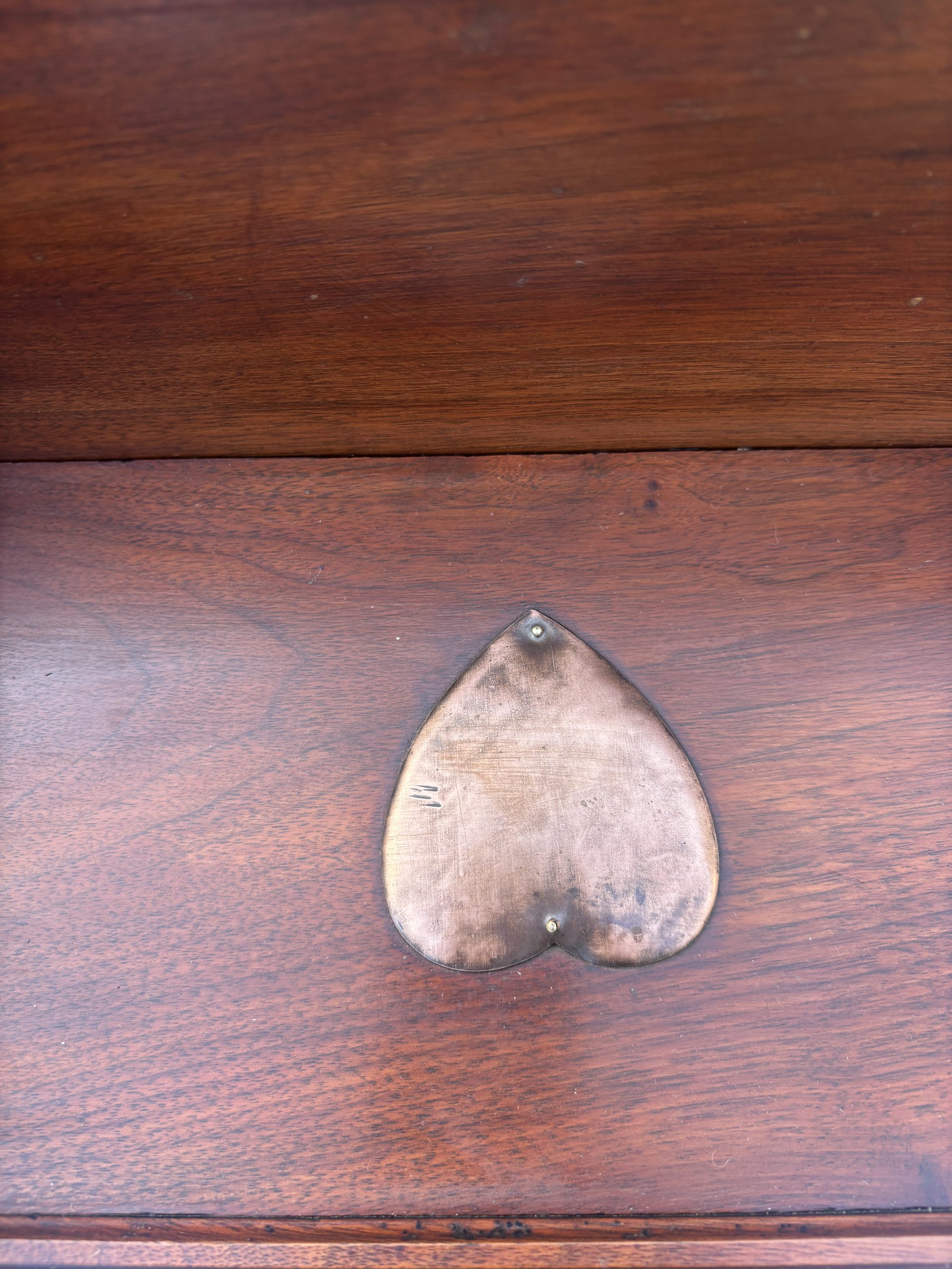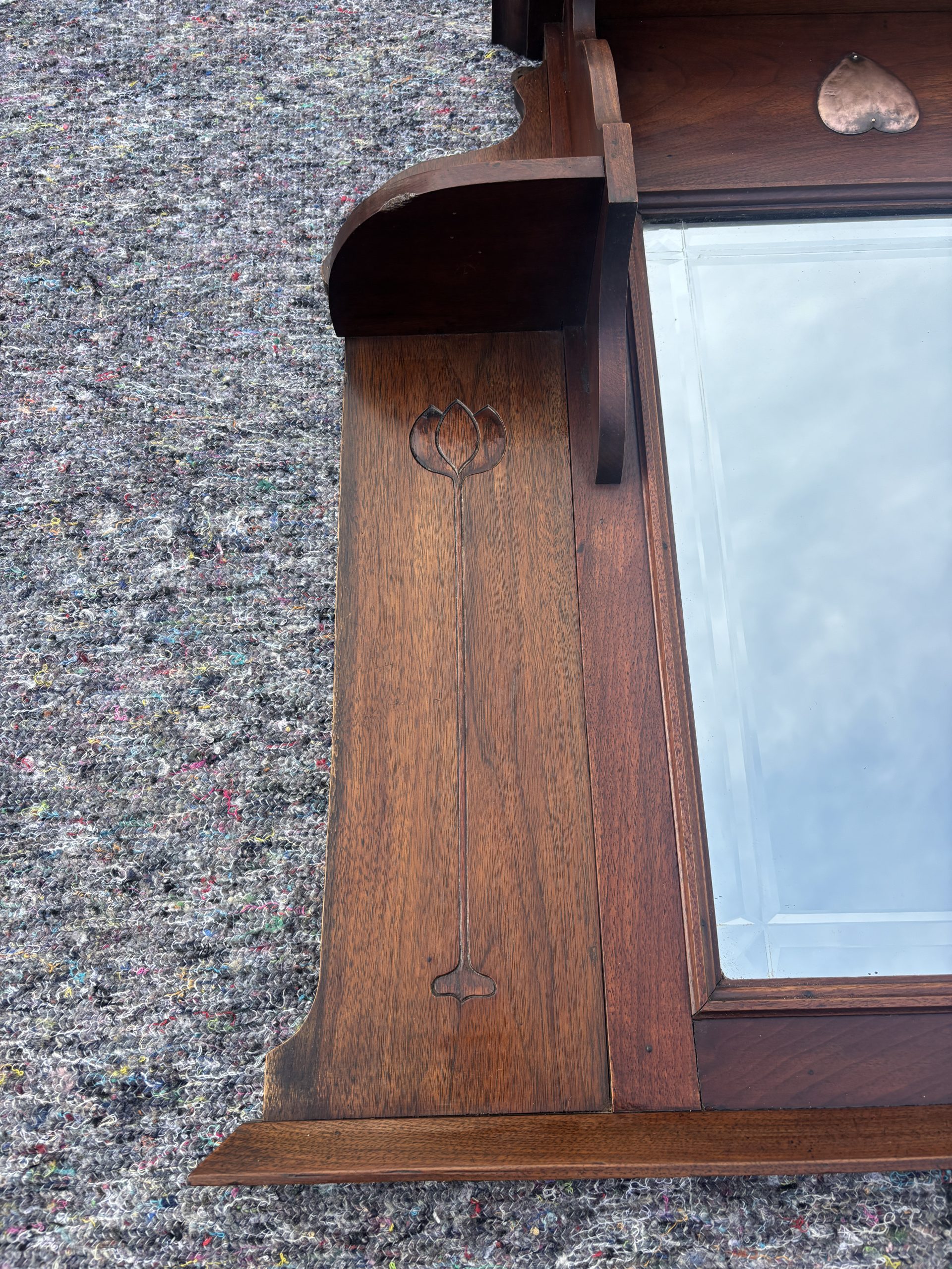 An Arts & Crafts solid mahogany overmantle mirror c1905. The mirror has a supported top shelf over copper inverted hearts, two small side shelves with tulip decoration below. The mirror plate is unusual as it has a ‘V’ grooved bevelled edge.