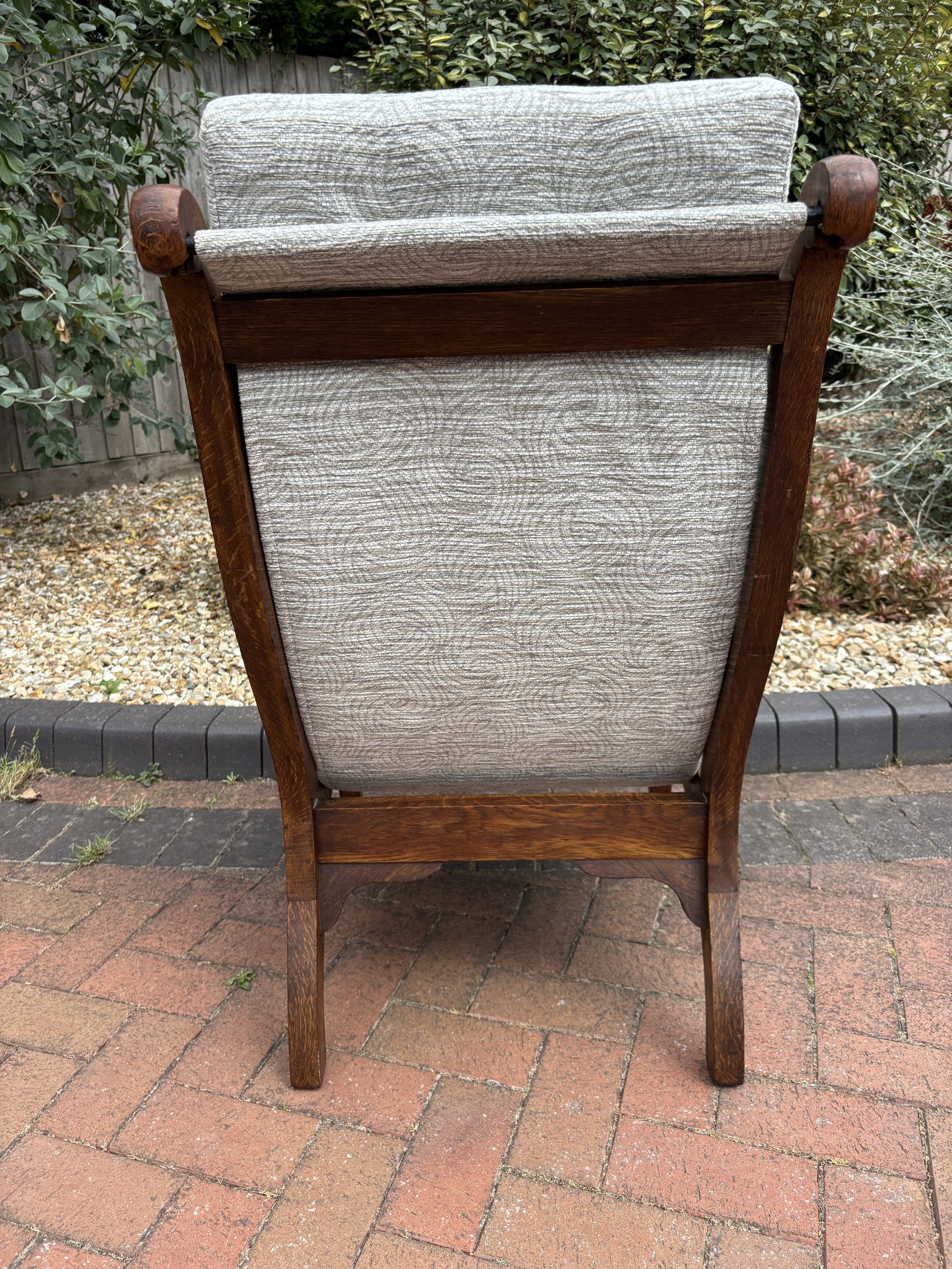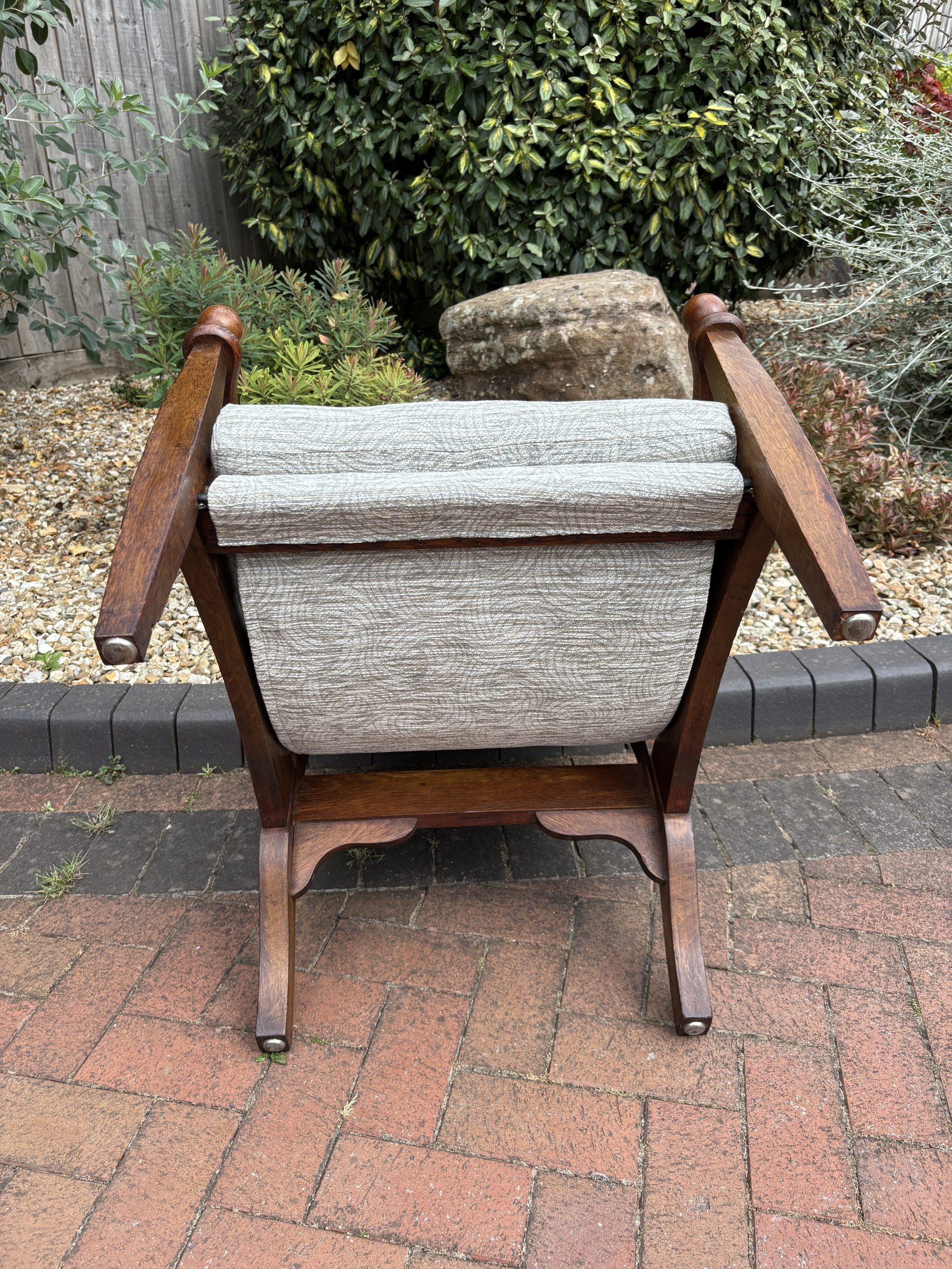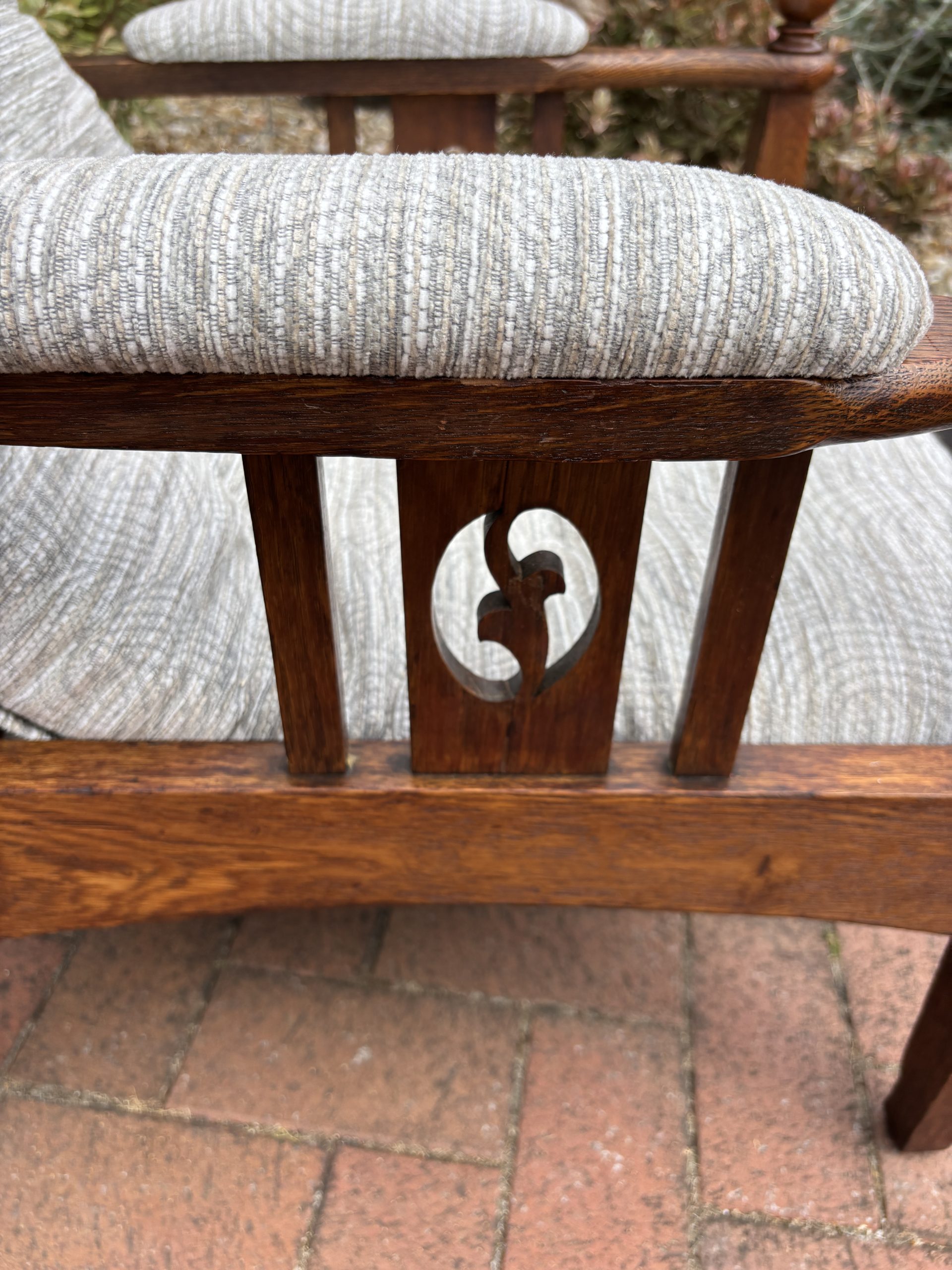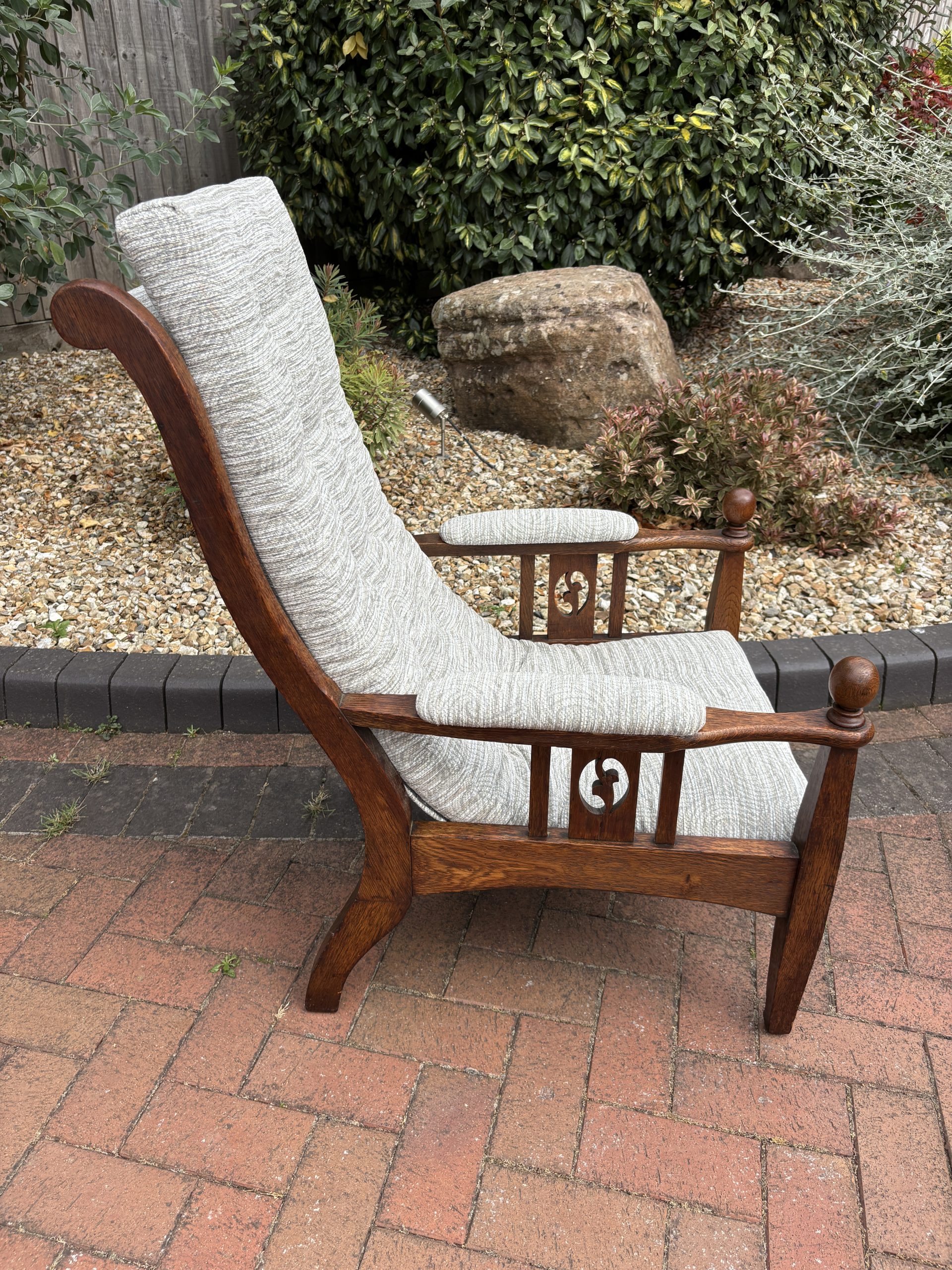 An Arts & Crafts solid oak armchair c1905. The frame has a curved backrest with pierced detail to the arm supports, outswept rear legs, square tapering front legs with finials to the top to act as raised hand rests. Complete with a newly upholstered ‘slouch’ backrest and seat along with armrest supports to meet with fire regulations.