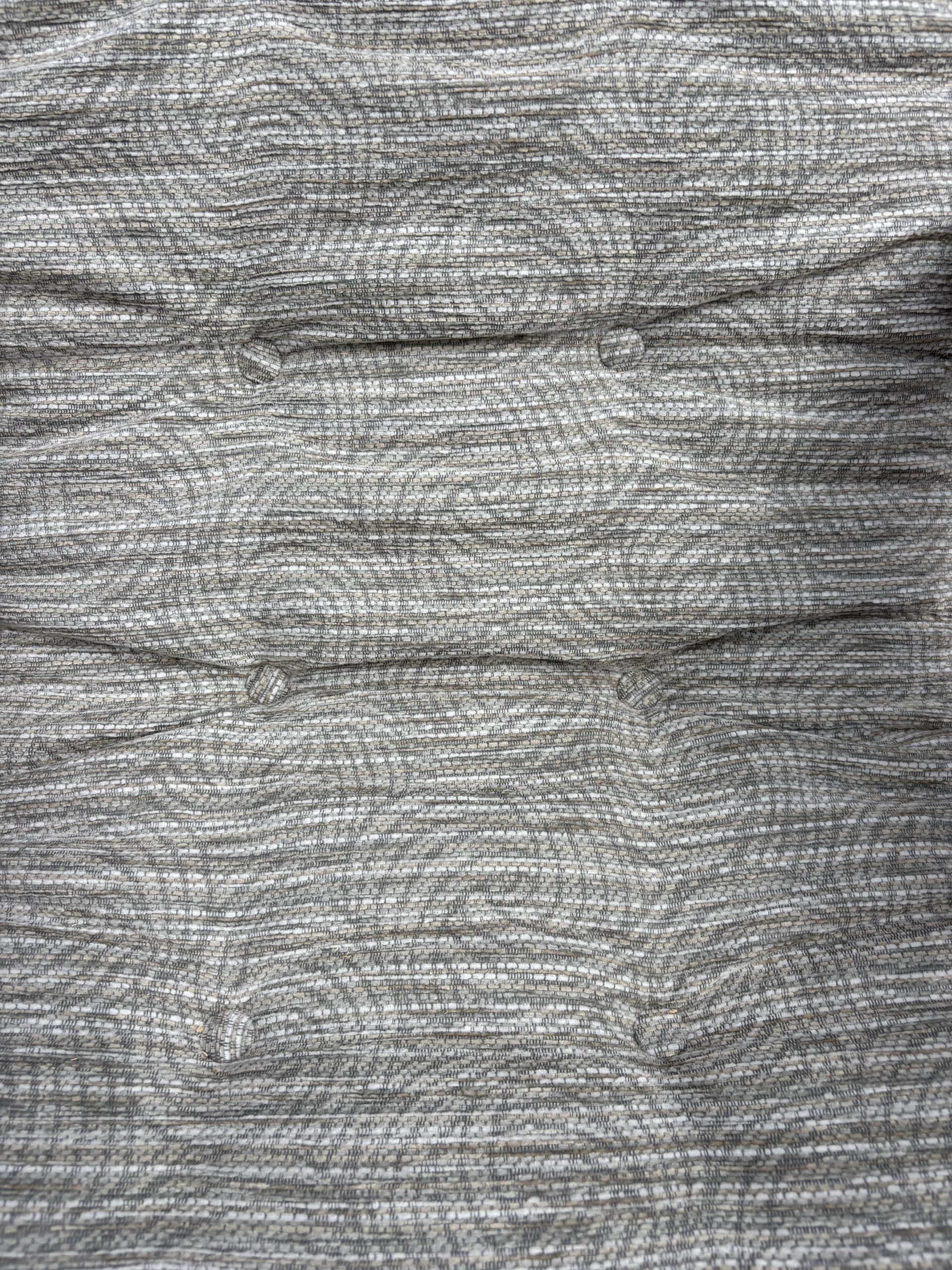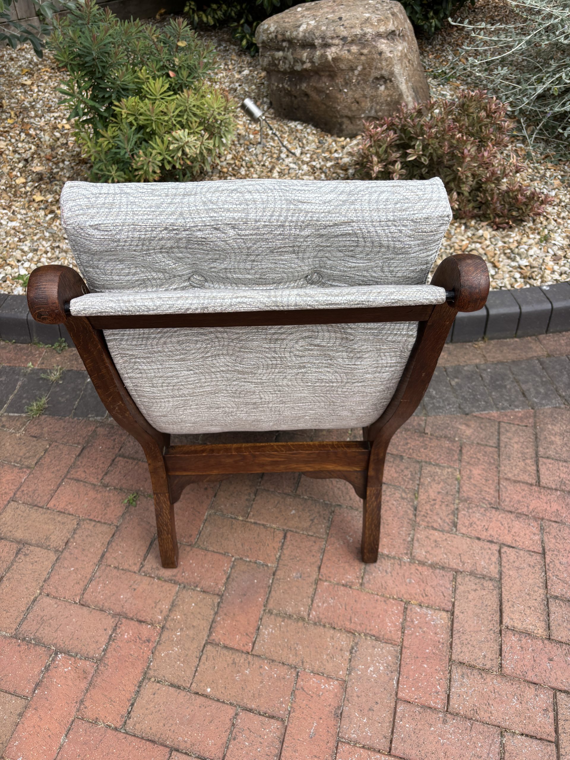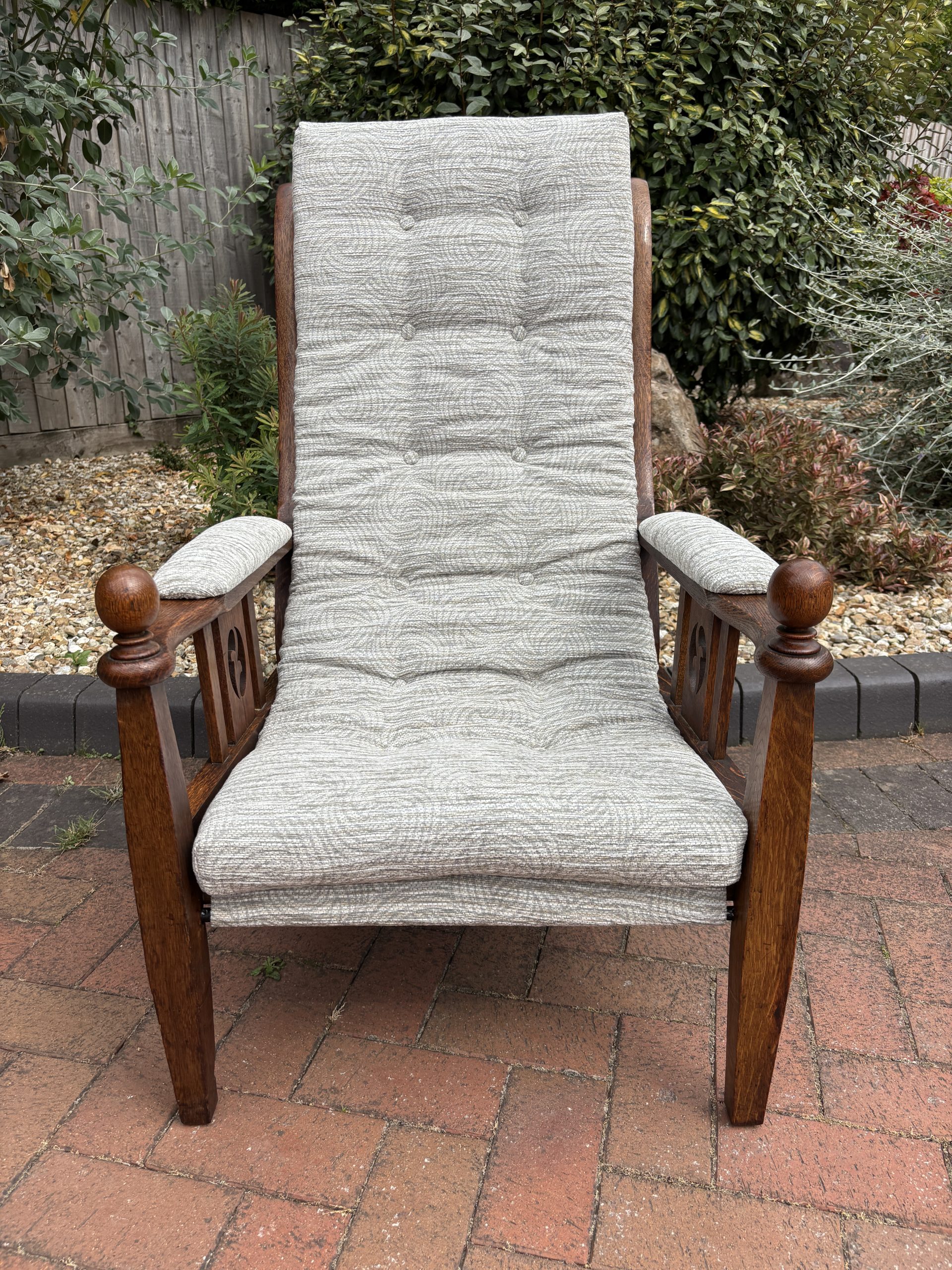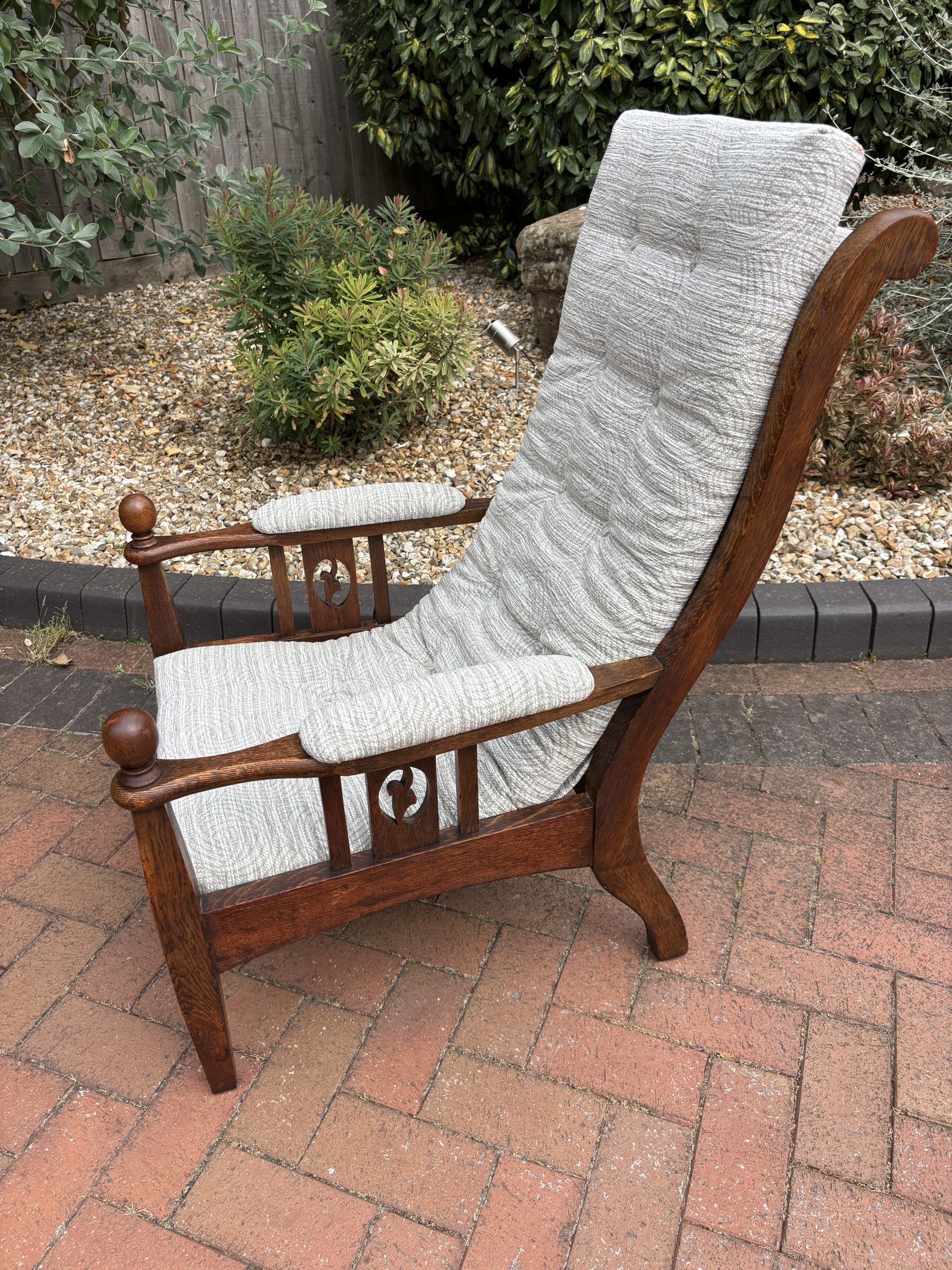 An Arts & Crafts solid oak armchair c1905. The frame has a curved backrest with pierced detail to the arm supports, outswept rear legs, square tapering front legs with finials to the top to act as raised hand rests. Complete with a newly upholstered ‘slouch’ backrest and seat along with armrest supports to meet with fire regulations.