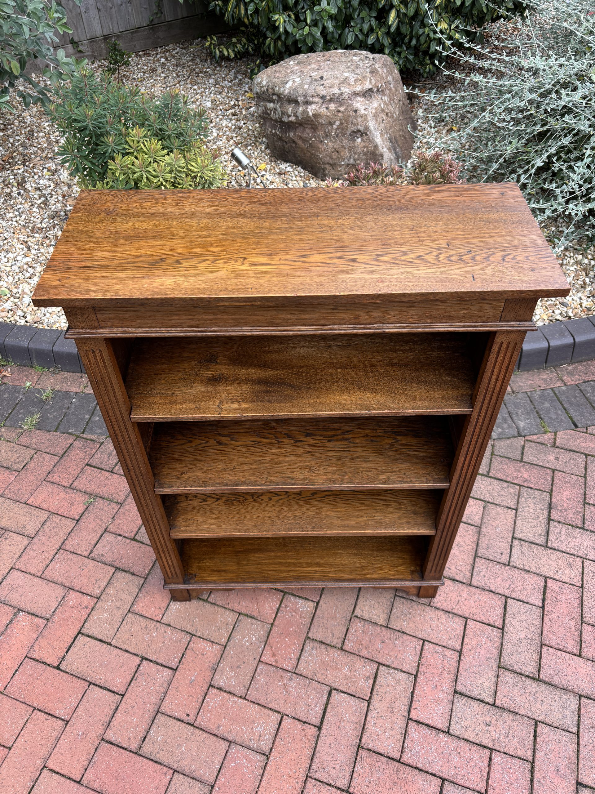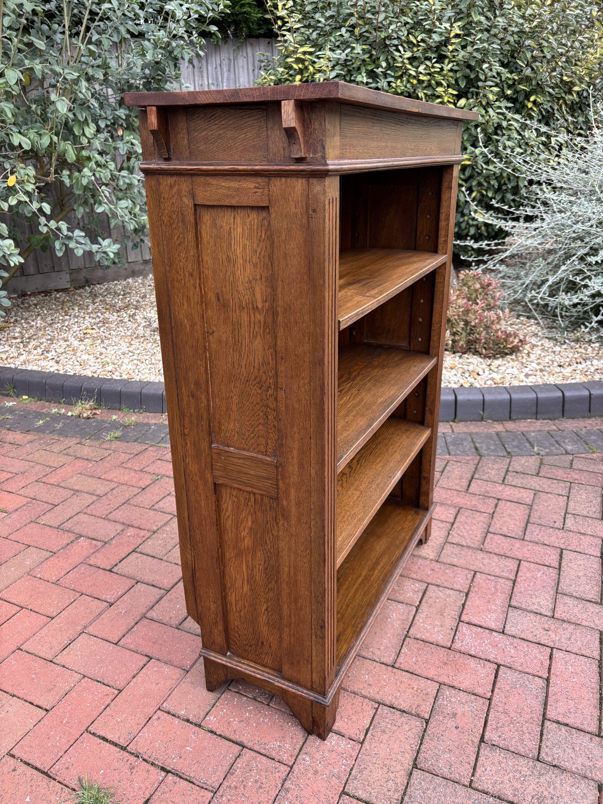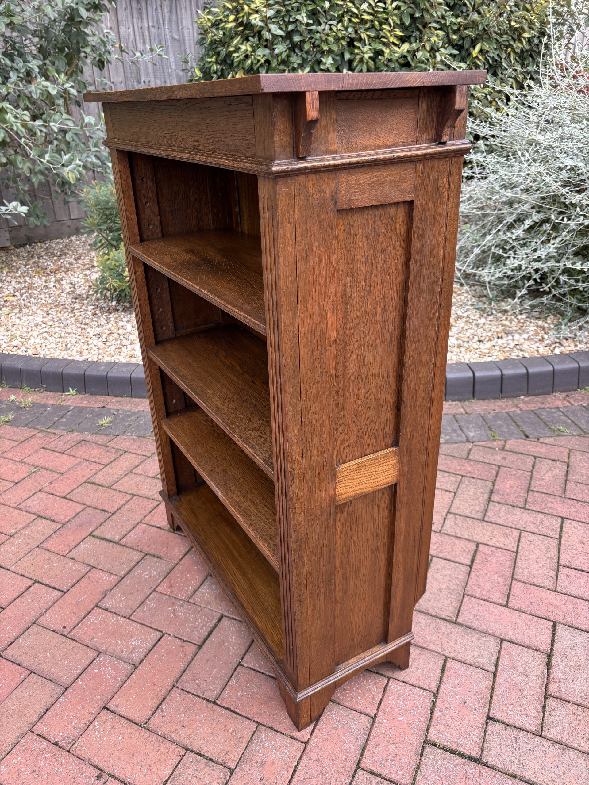 An Arts & Crafts open bookcase made of solid oak c1910. A slightly overhanging top with shaped bracket supports, three adjustable shelves, fluted front columns, panelled sides and stands on bracket feet.