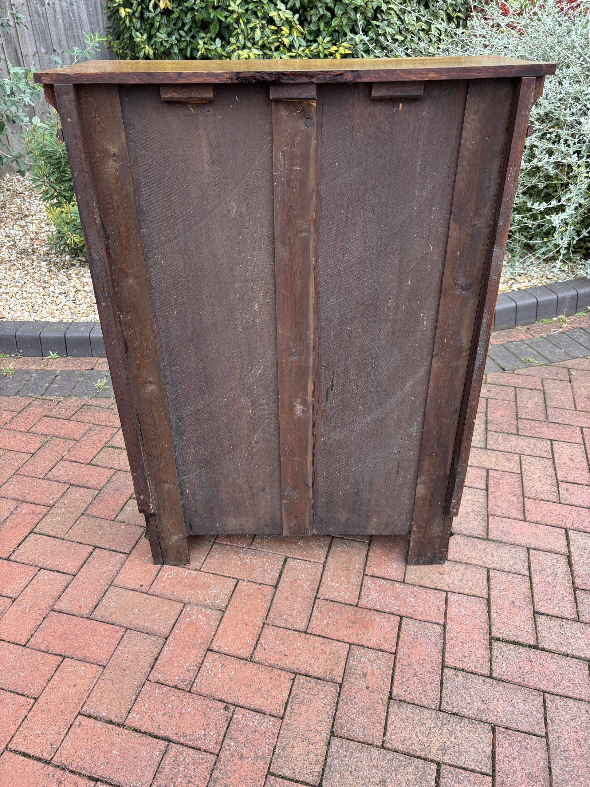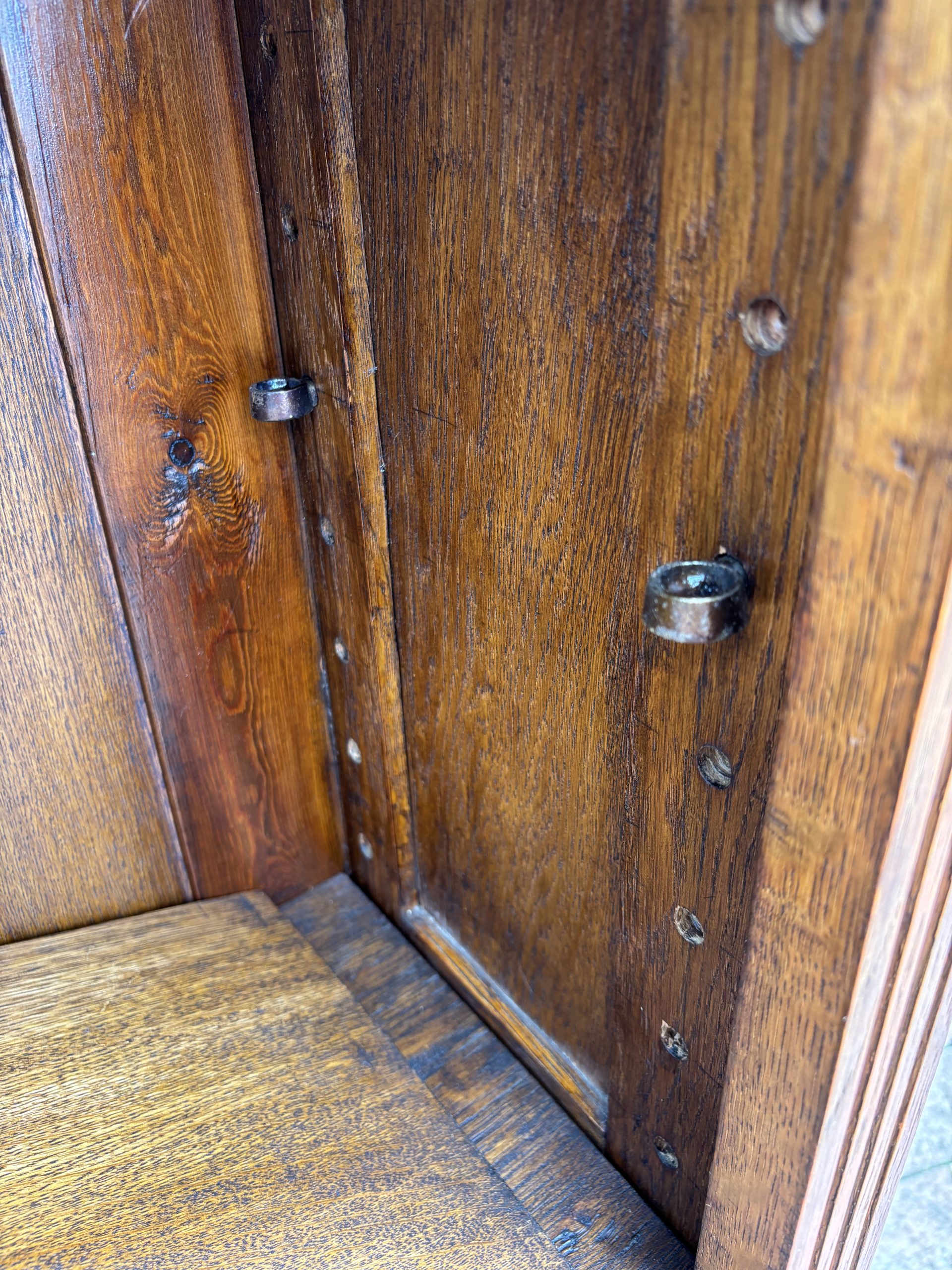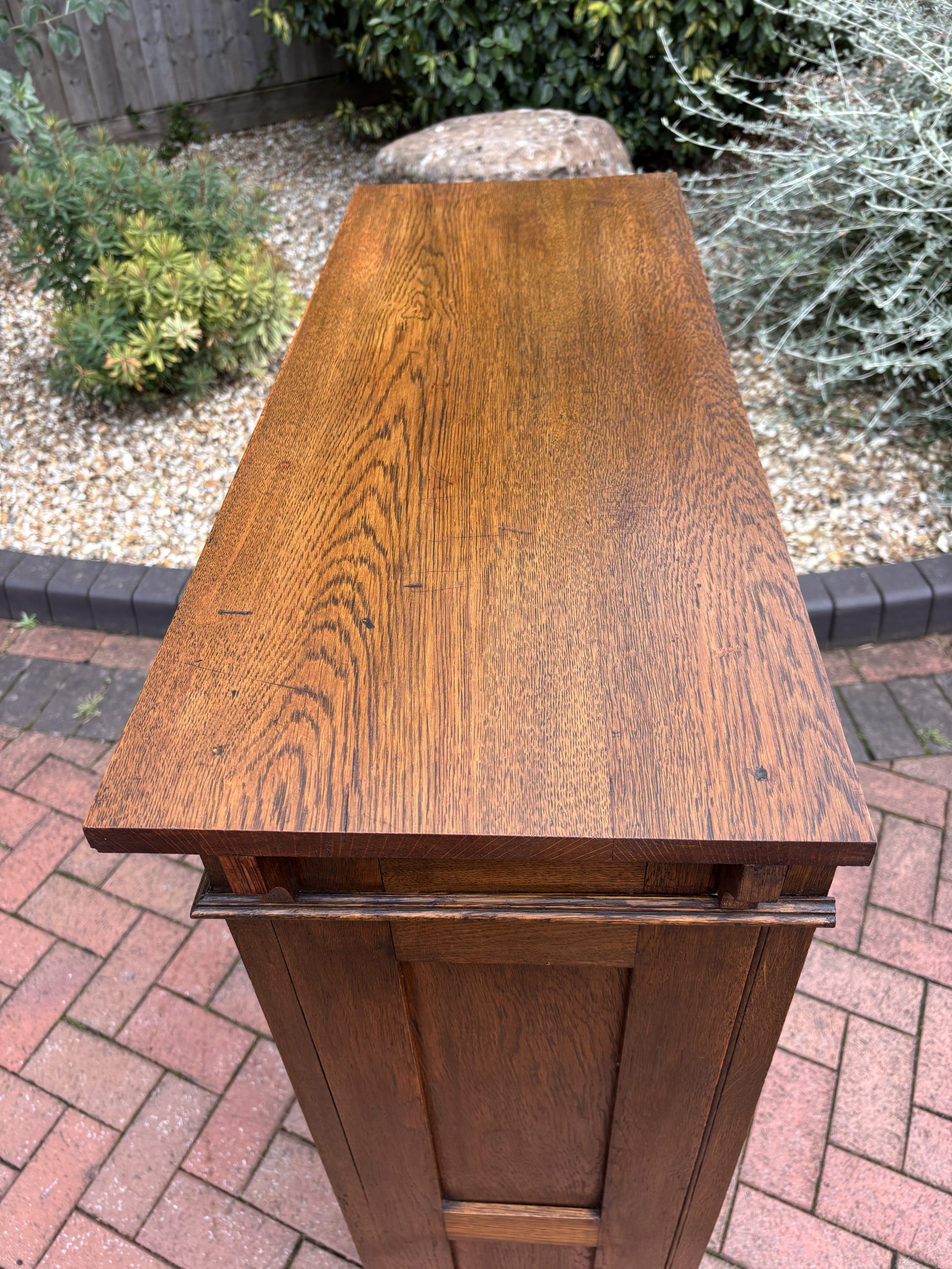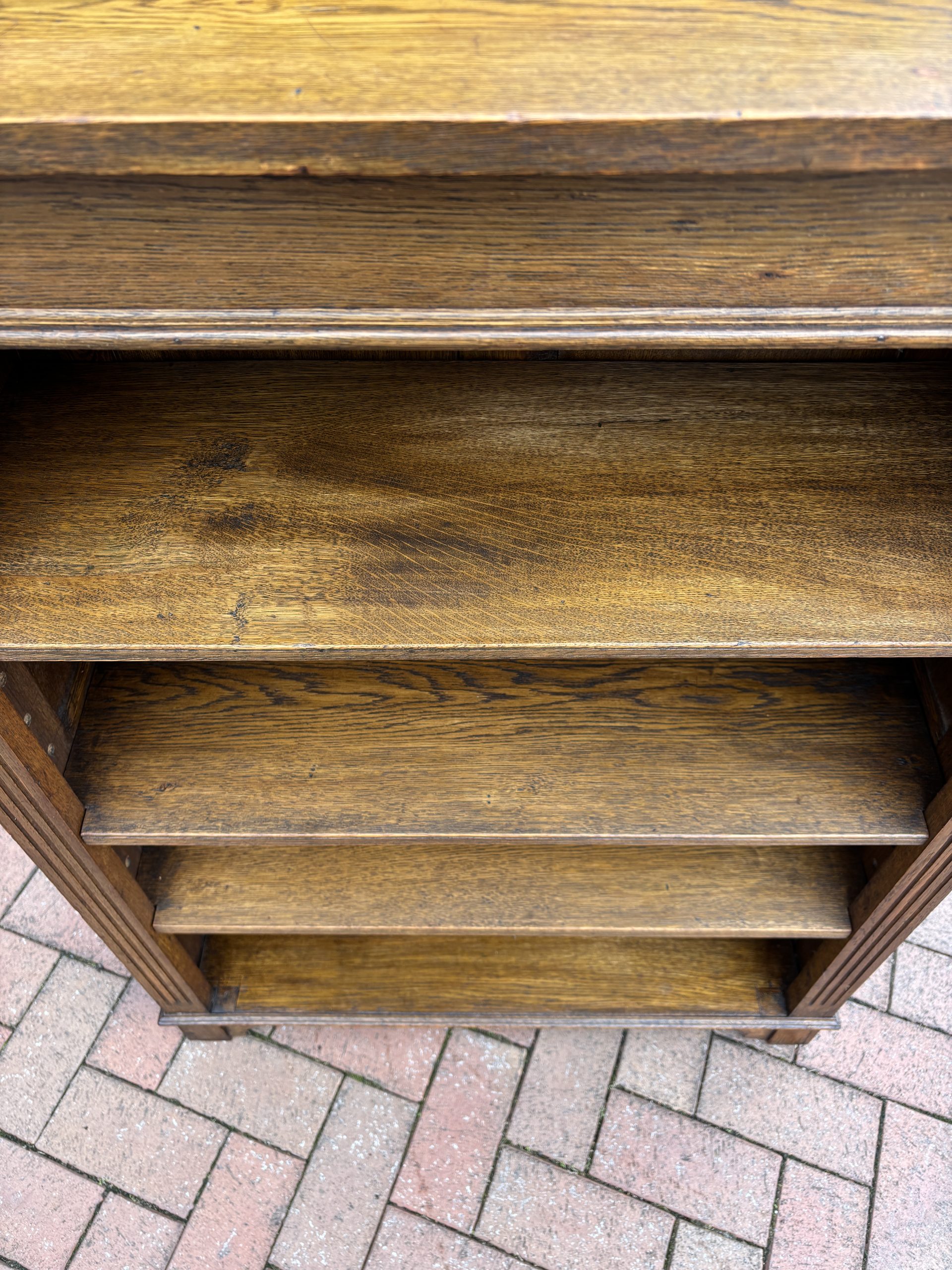 An Arts & Crafts open bookcase made of solid oak c1910. A slightly overhanging top with shaped bracket supports, three adjustable shelves, fluted front columns, panelled sides and stands on bracket feet.