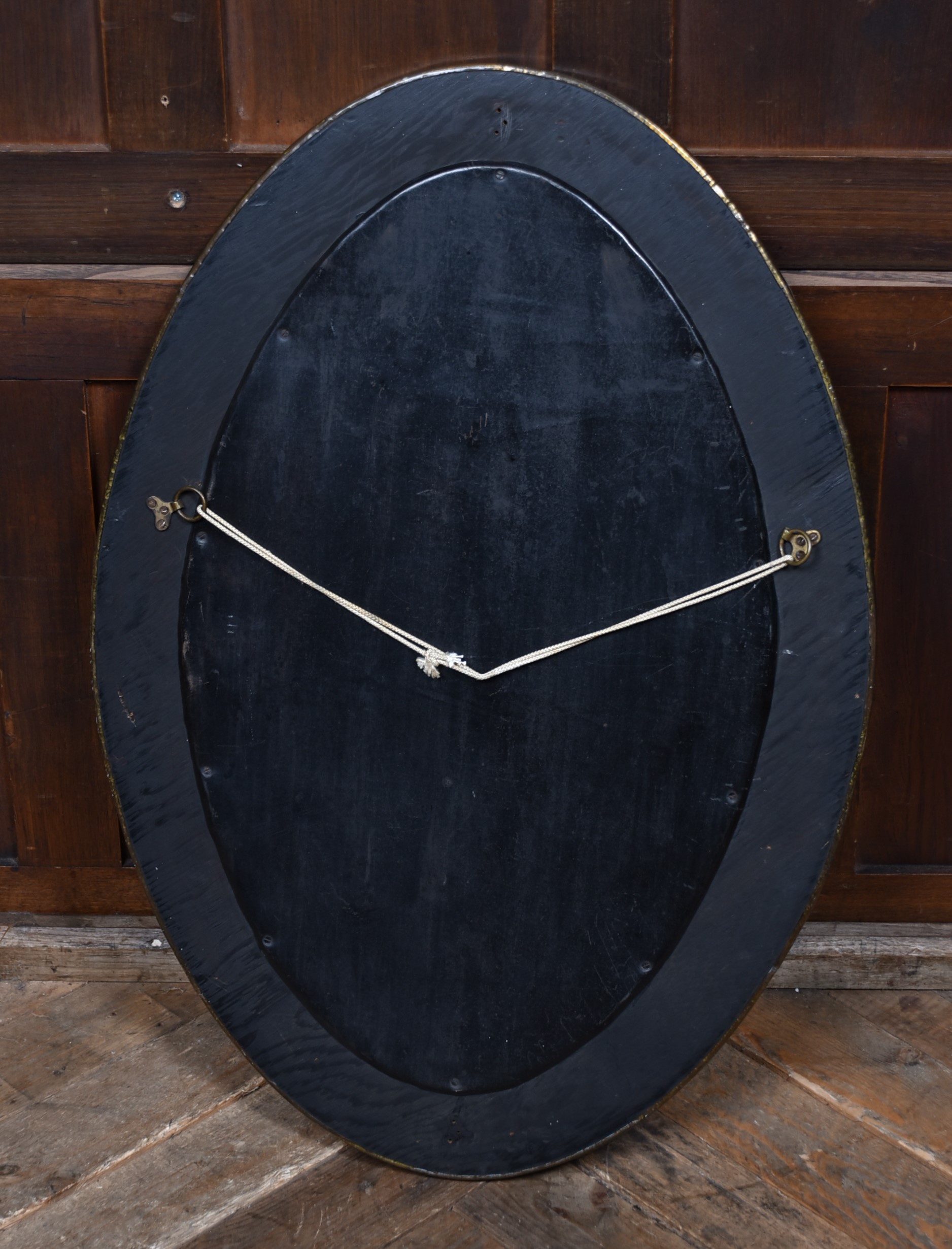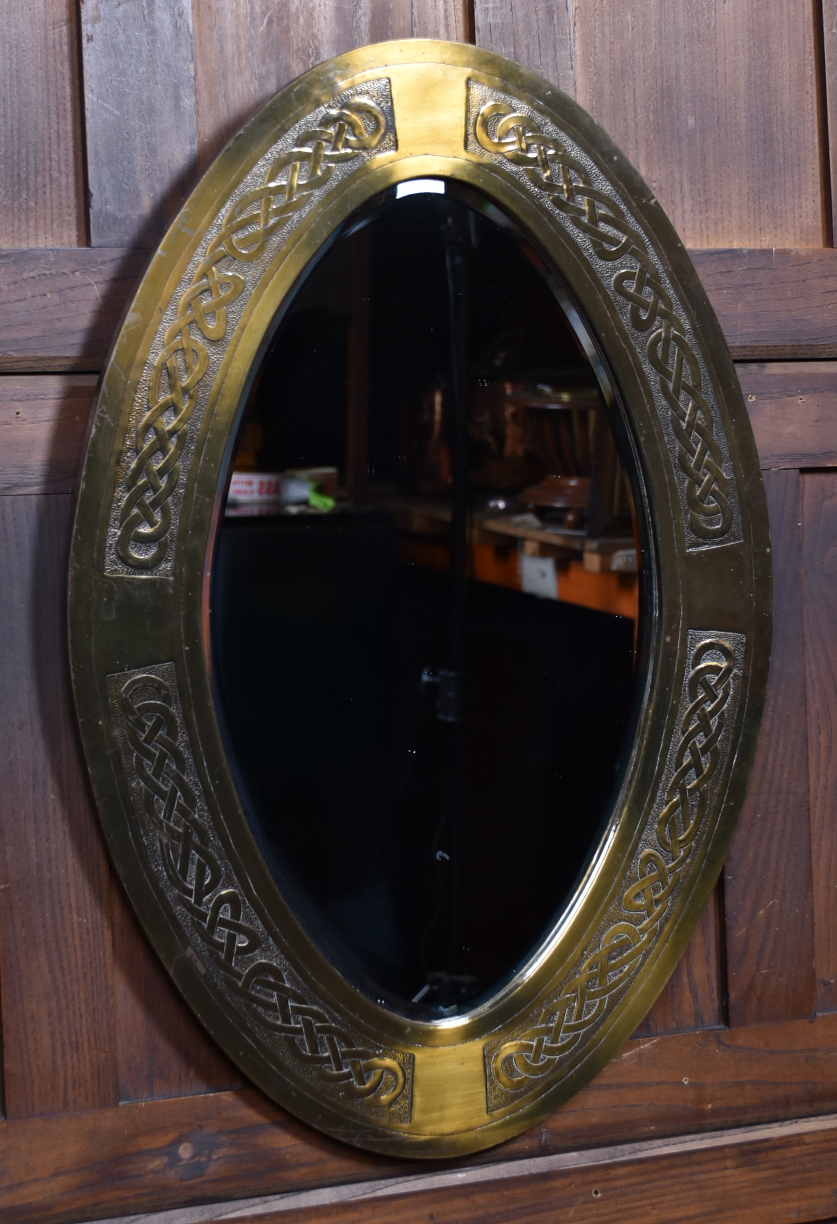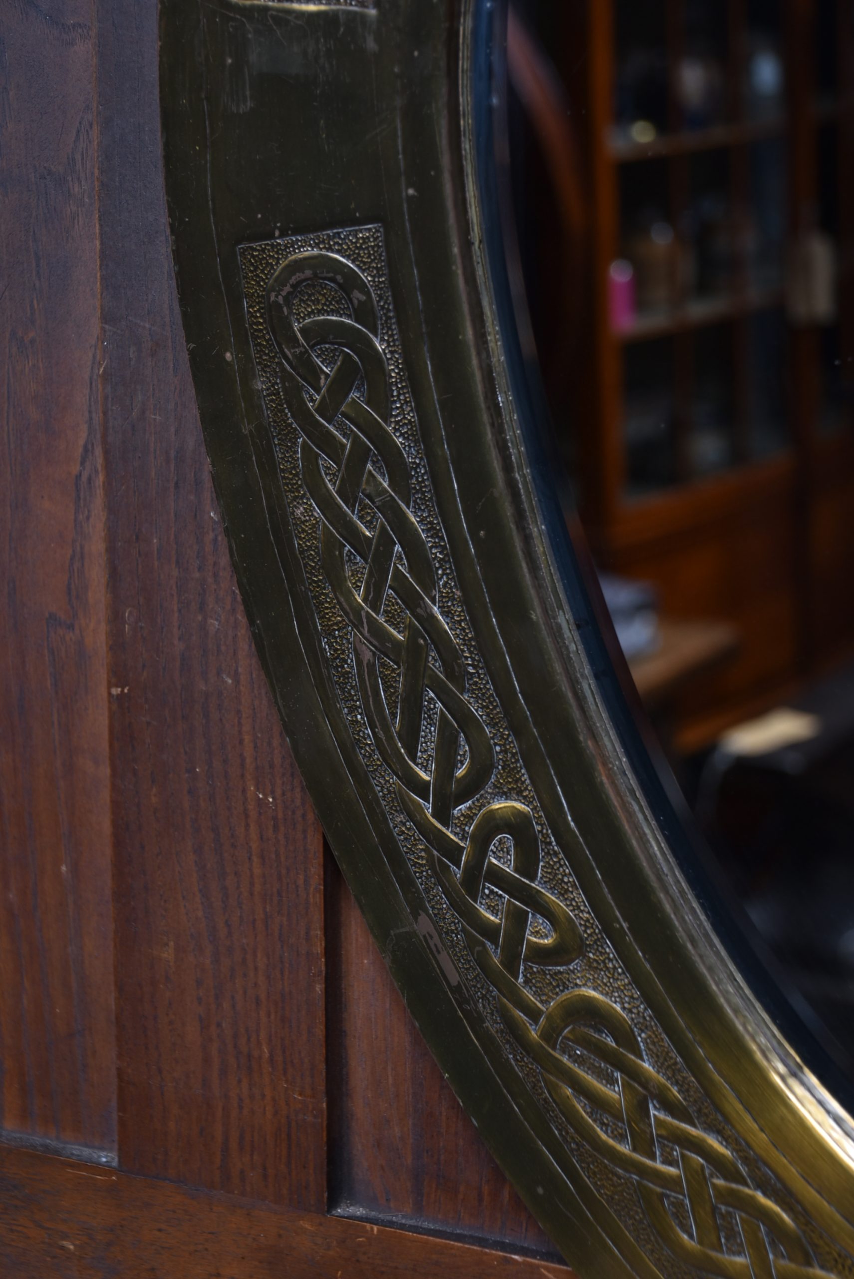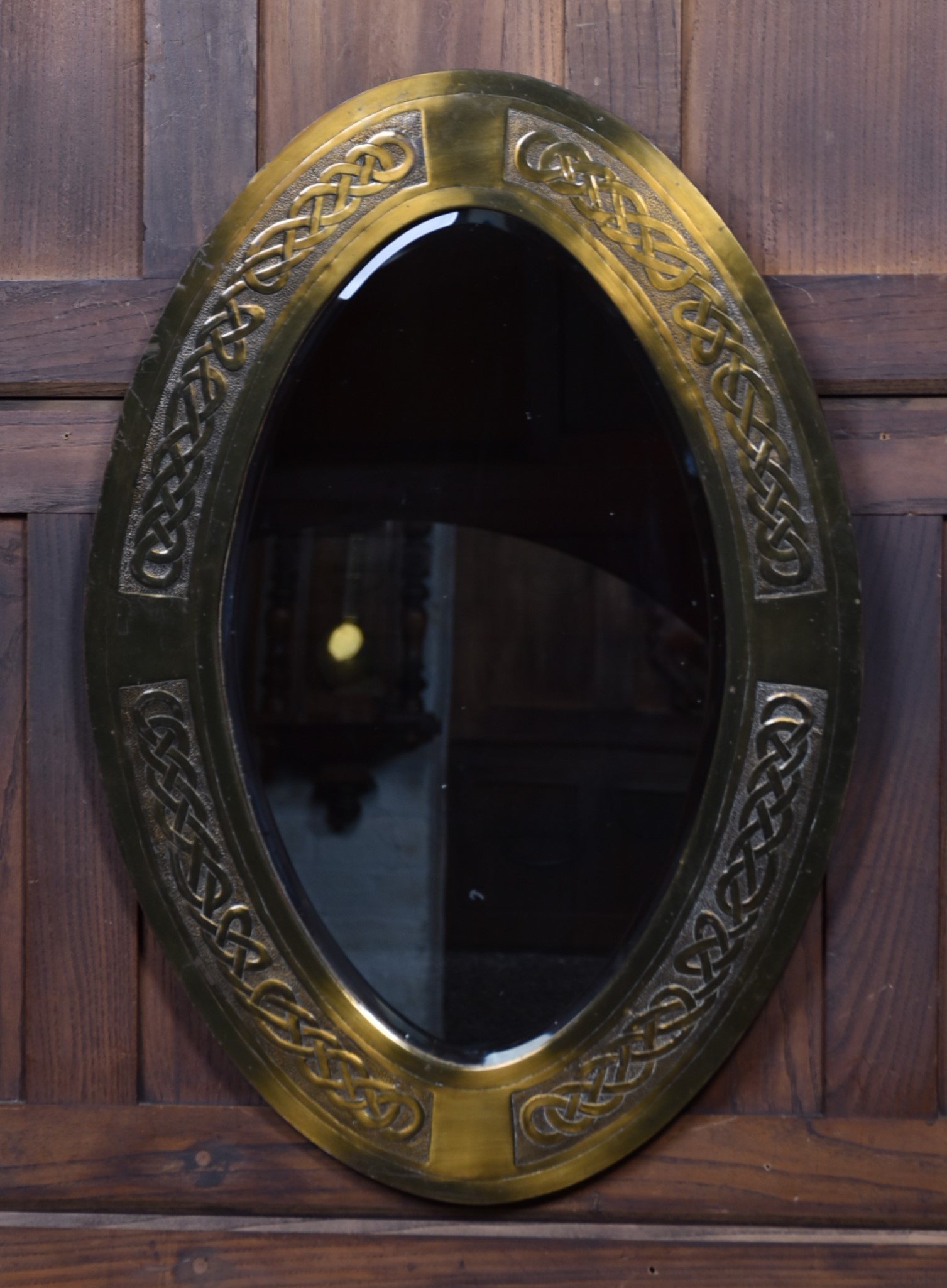 An early 20th‑century Arts & Crafts oval wall mirror, the brass frame decorated with finely executed embossed Celtic knotwork. The interlaced design is crisp and well‑defined, characteristic of the movement’s fascination with handcrafted detail and historic motifs. The mirror plate is set within a deep, gently bevelled surround, and the reverse retains its original hanging cord. A striking decorative piece with strong Arts & Crafts presence.