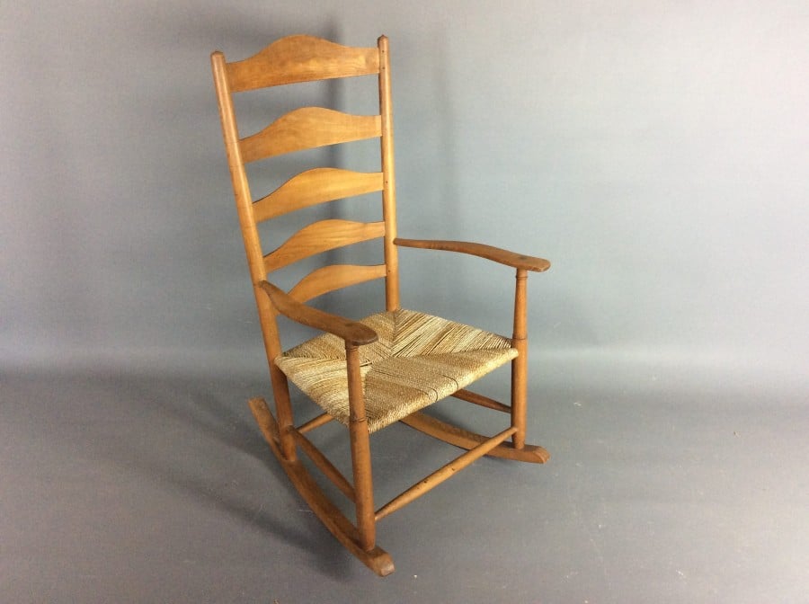 A rare Arts & Crafts ladder back rocking chair c1950’s by Dicon Nance of St. Ives (1909-2002). Made of Ash with a woven seagrass seat. Dicon and his brother Robin set up a cabinet making workshop in St. Ives, with their furniture influenced by the Arts & Crafts movement to embrace a modern aesthetic, always underpinned by fine materials and traditional craftsmanship. Ladder back chairs first developed by Ernest Gimson and the Cotswold group of Arts & Crafts furniture makers were manufactured by Dicon in St. Ives playing an important part in establishing the workshop. Dicon went on to work with designer and sculptor Dame Barbara Hepworth.