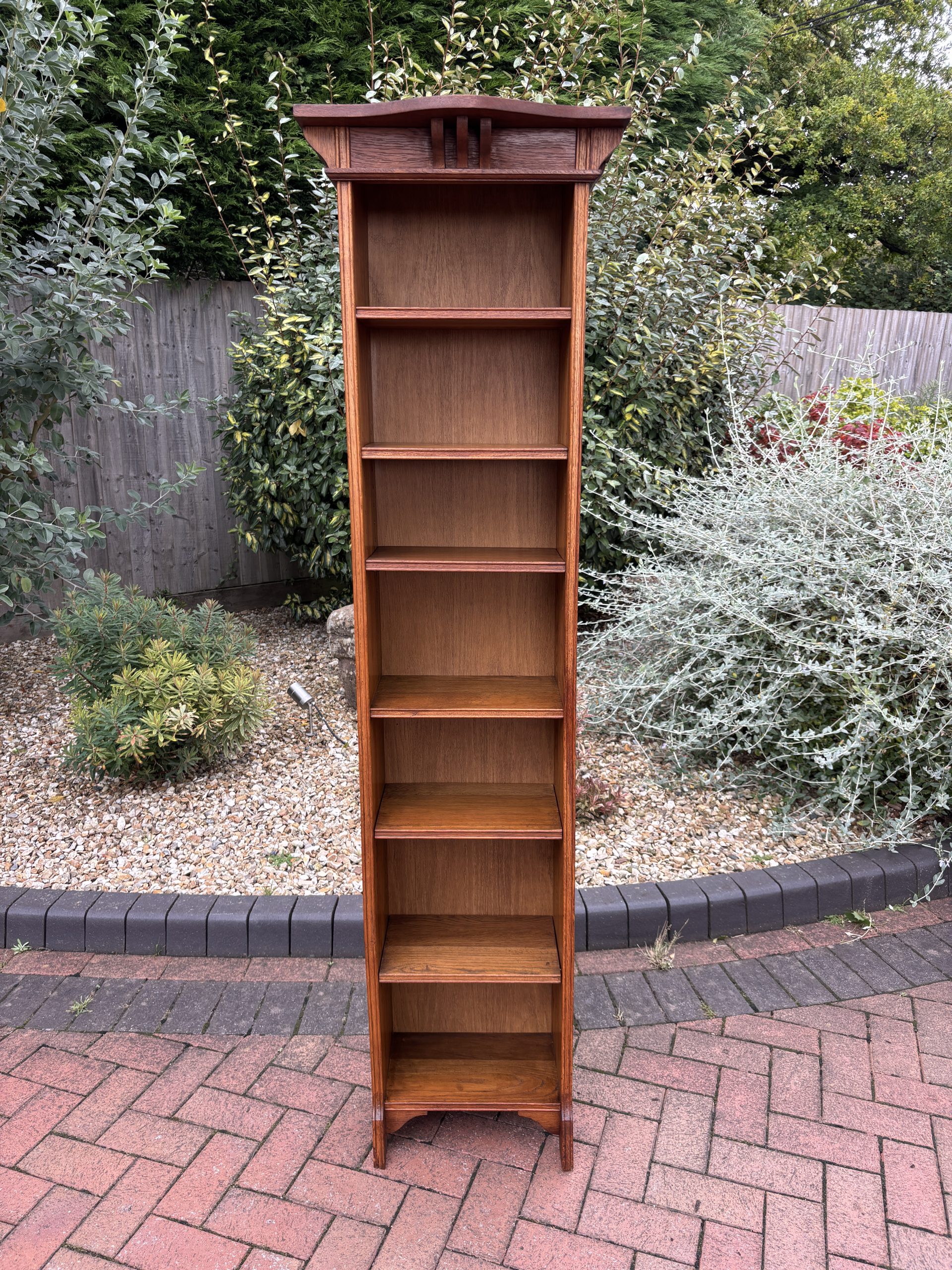 An Arts & Crafts tall narrow open bookcase made of solid oak c1900 made of solid oak with two fixed and four adjustable shelves. The bookcase has an overhanging cornice with shaped supports, with the side supports and shelves having moulded fronts, and is raised on bracket feet.