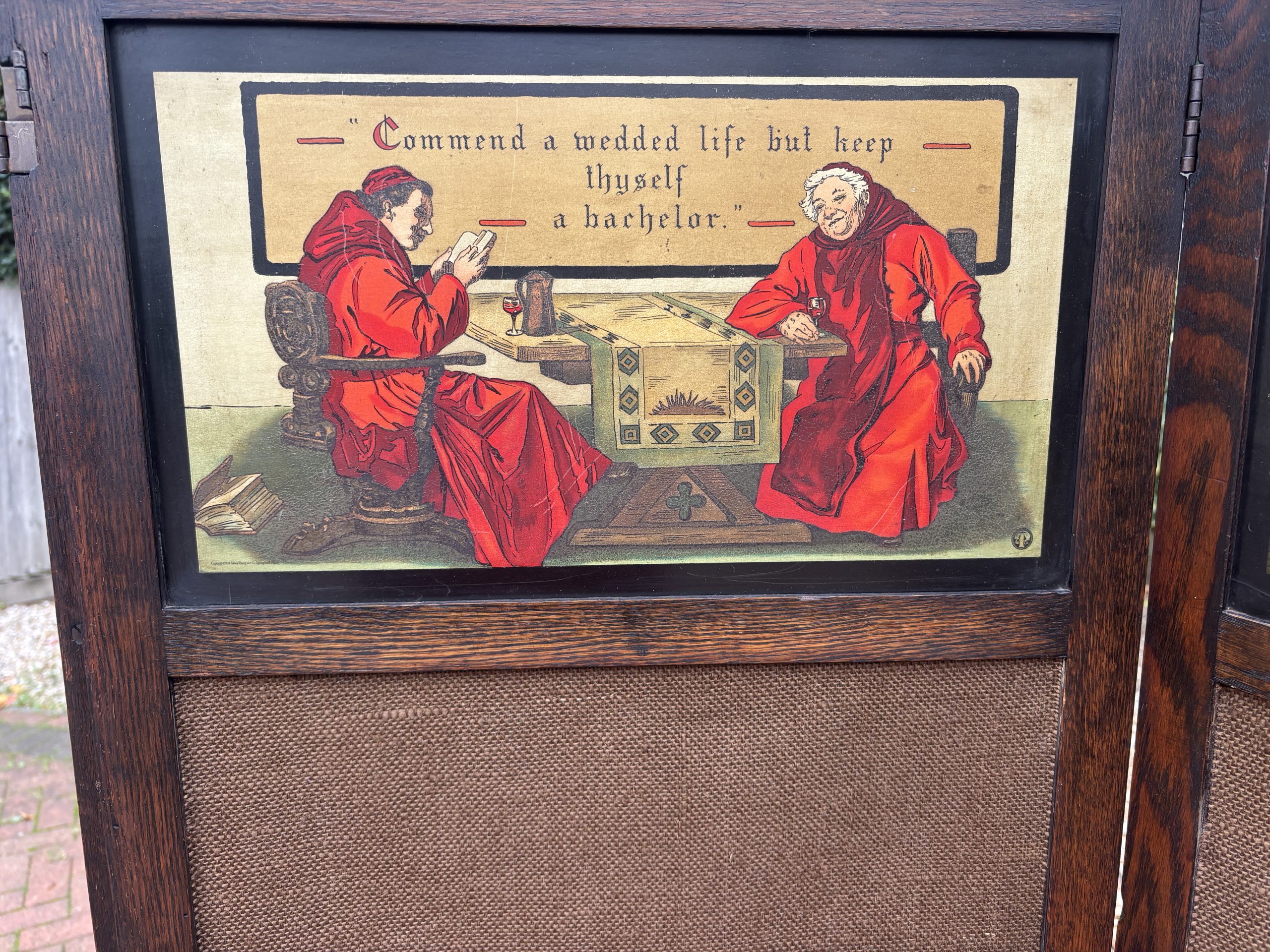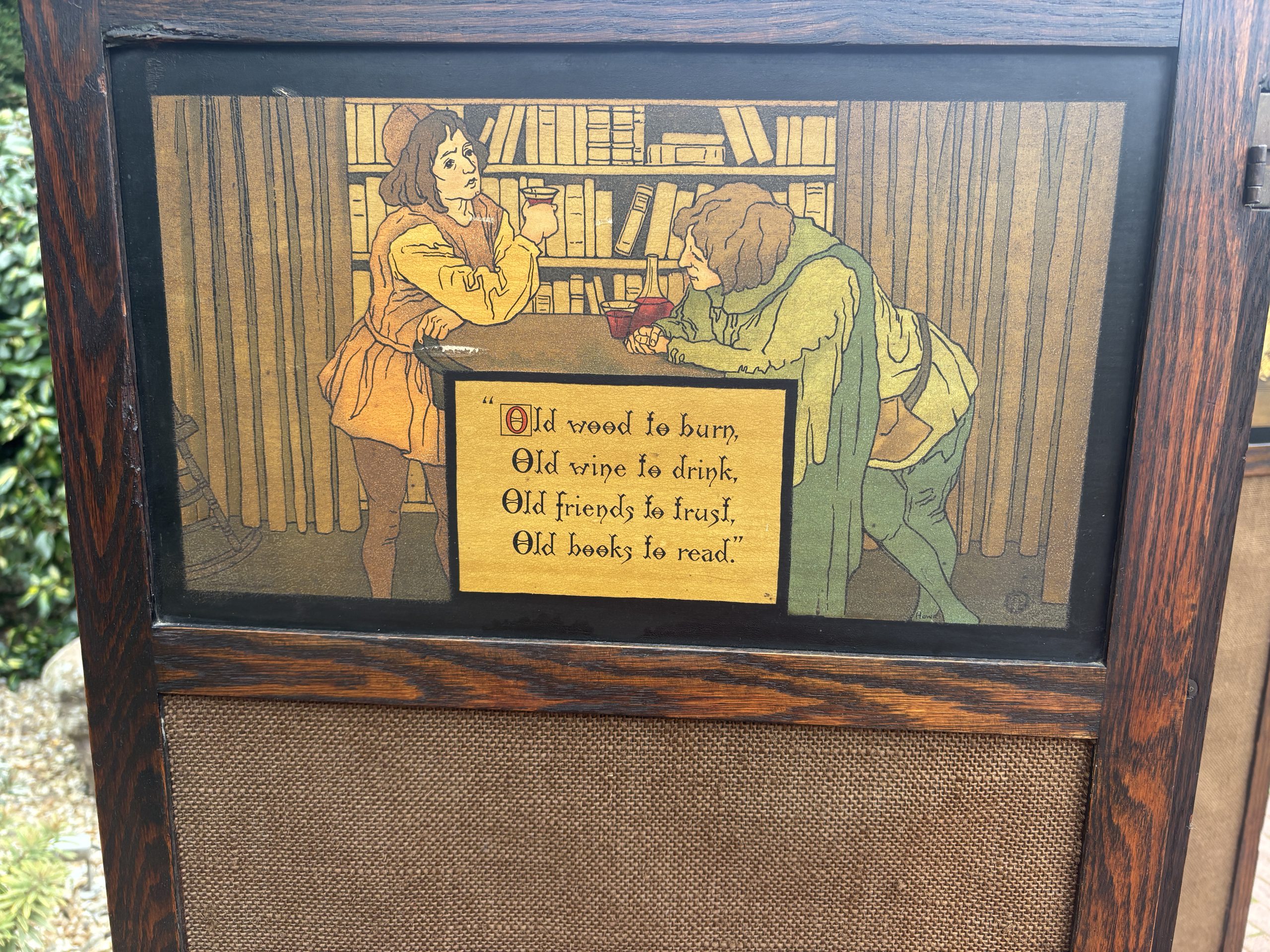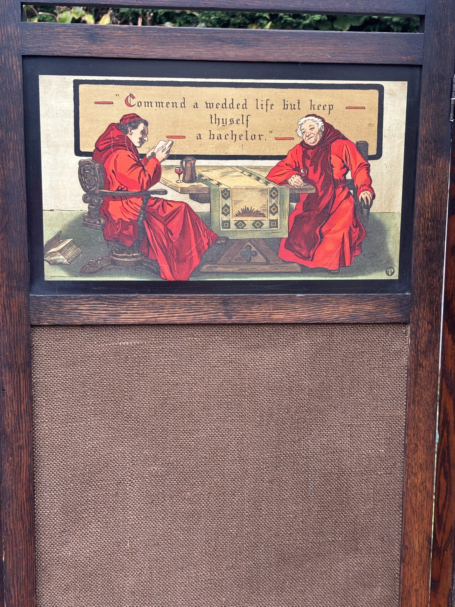 An American Taber-Pring Art Company Arts & Crafts mission three fold screen. The frame is oak with hessian burlap panels, with the top of each panel having a motto chromolithograph.