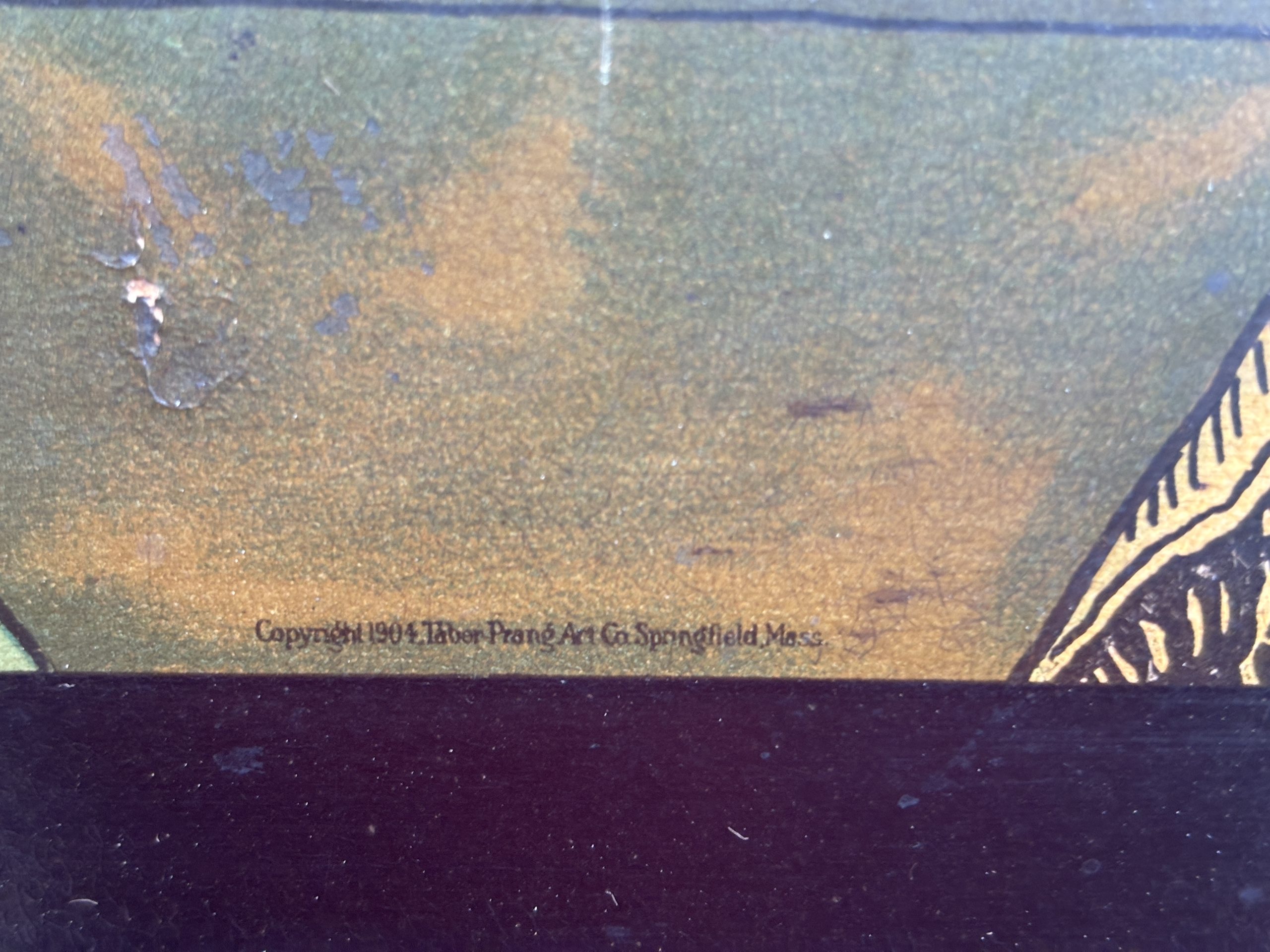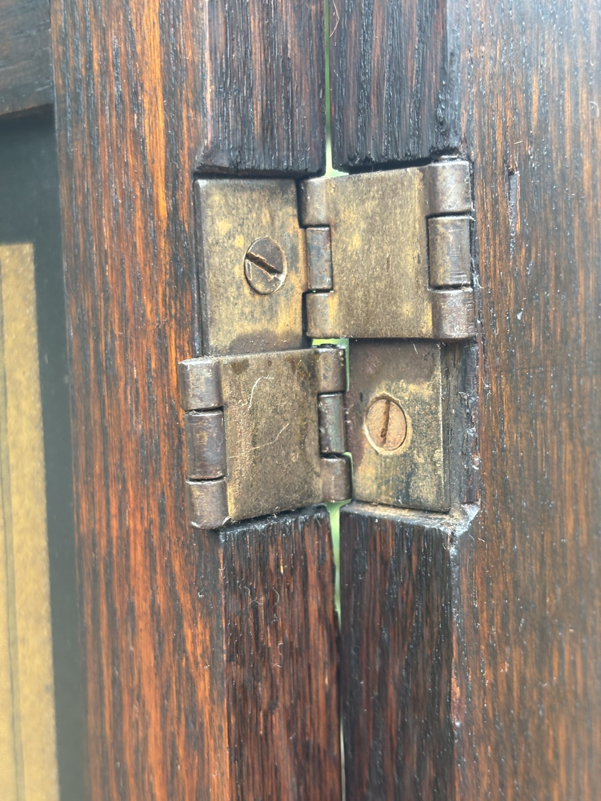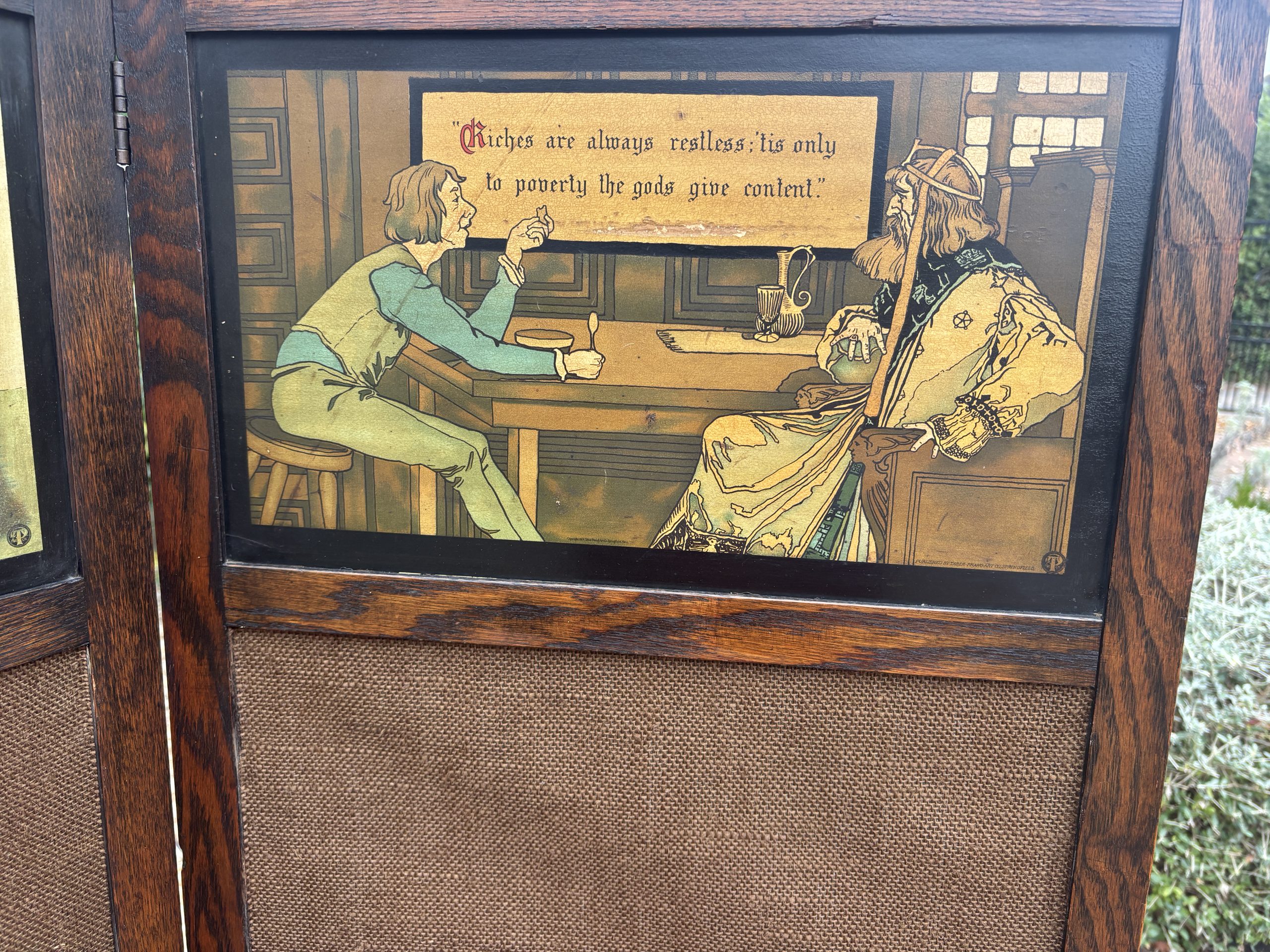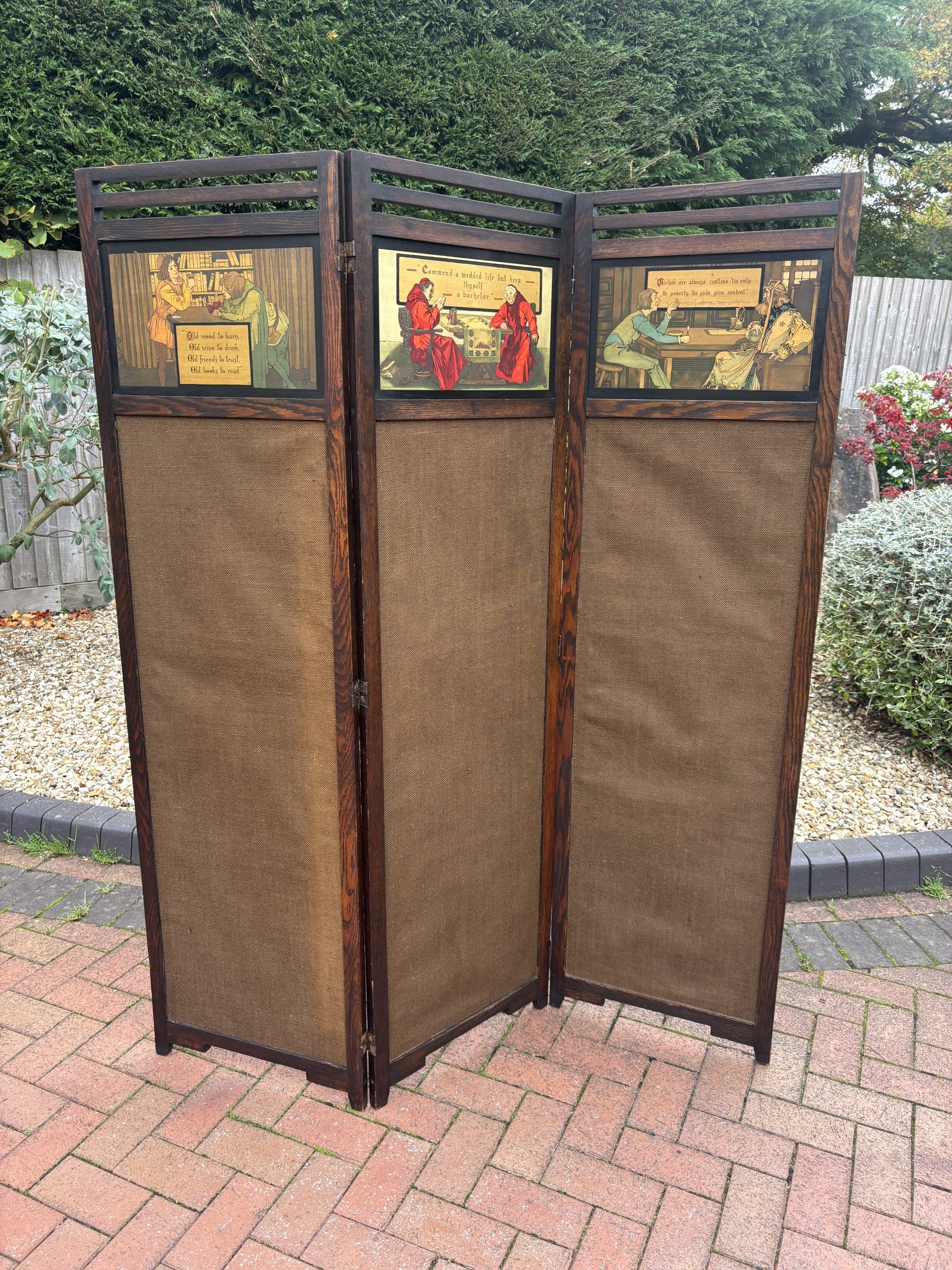 An American Taber-Pring Art Company Arts & Crafts mission three fold screen. The frame is oak with hessian burlap panels, with the top of each panel having a motto chromolithograph.