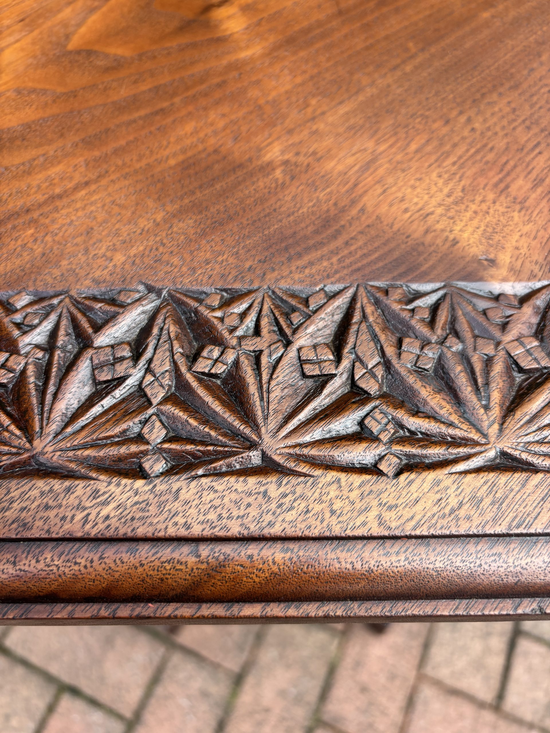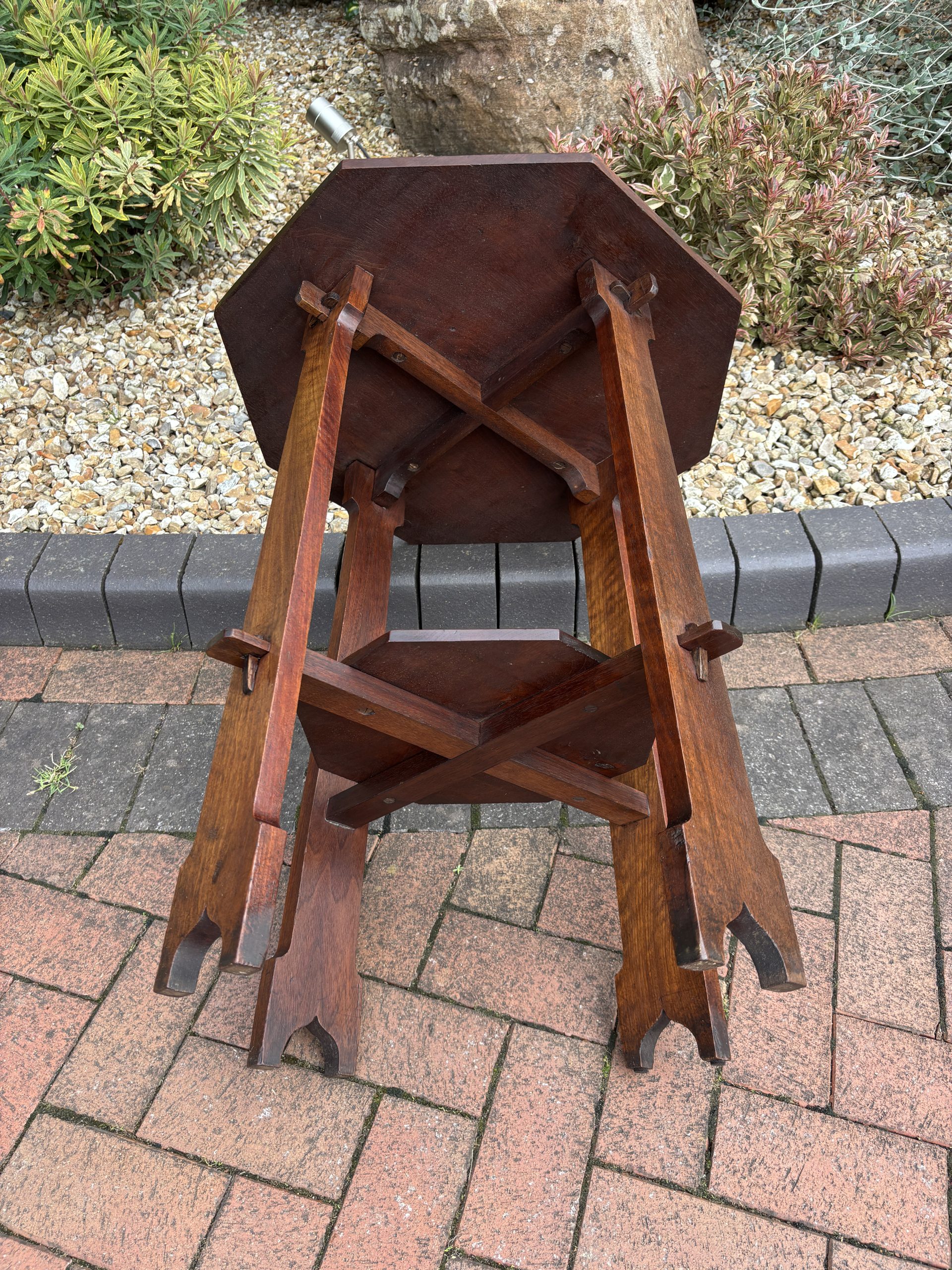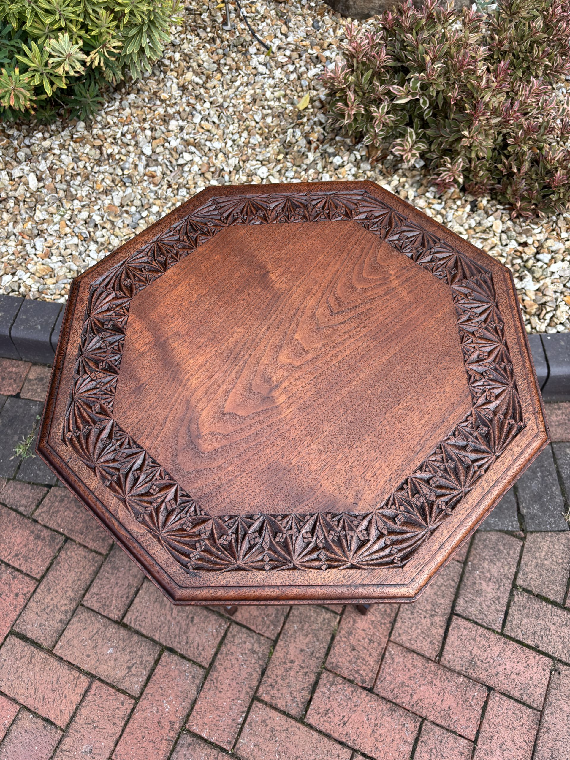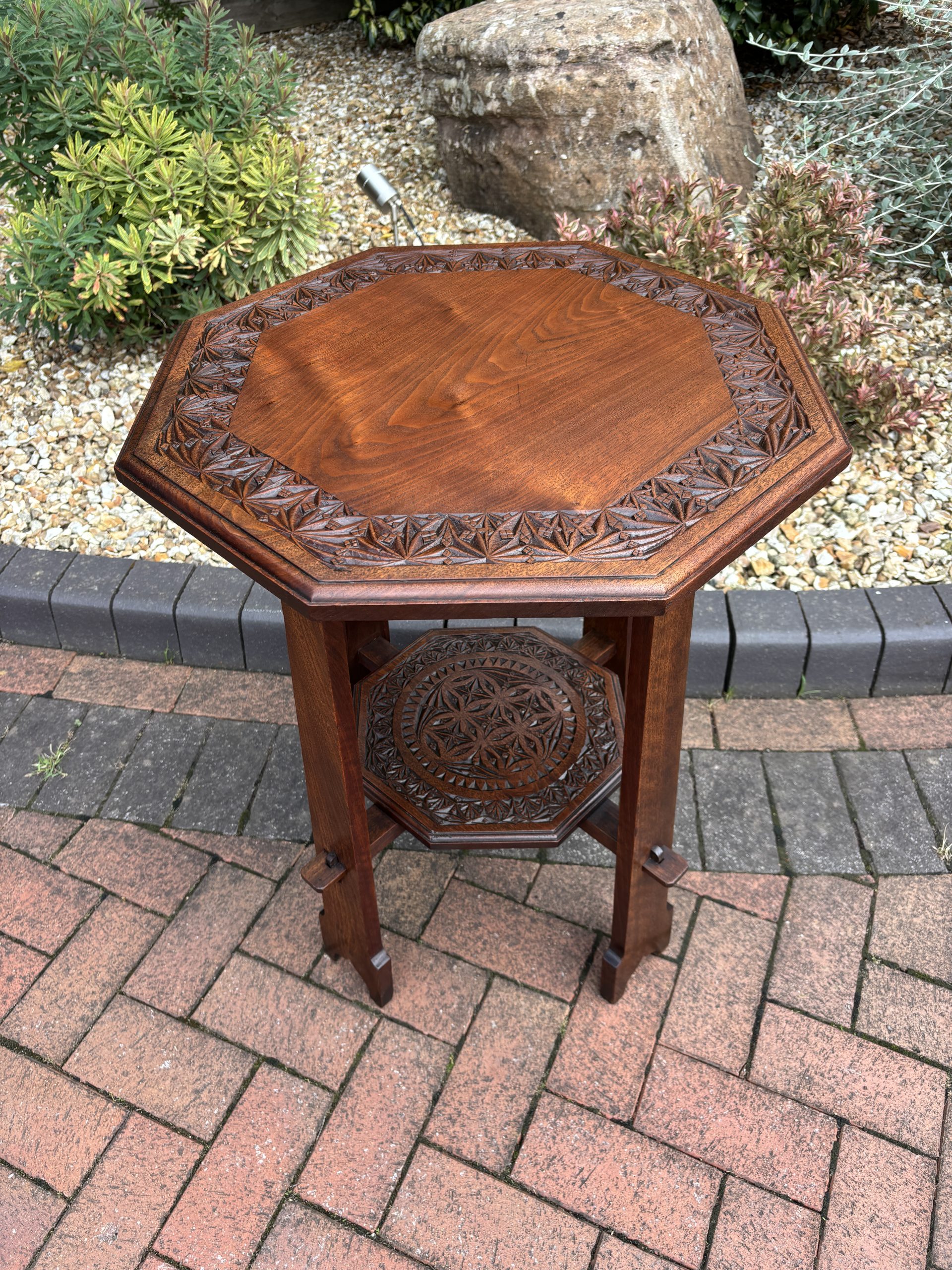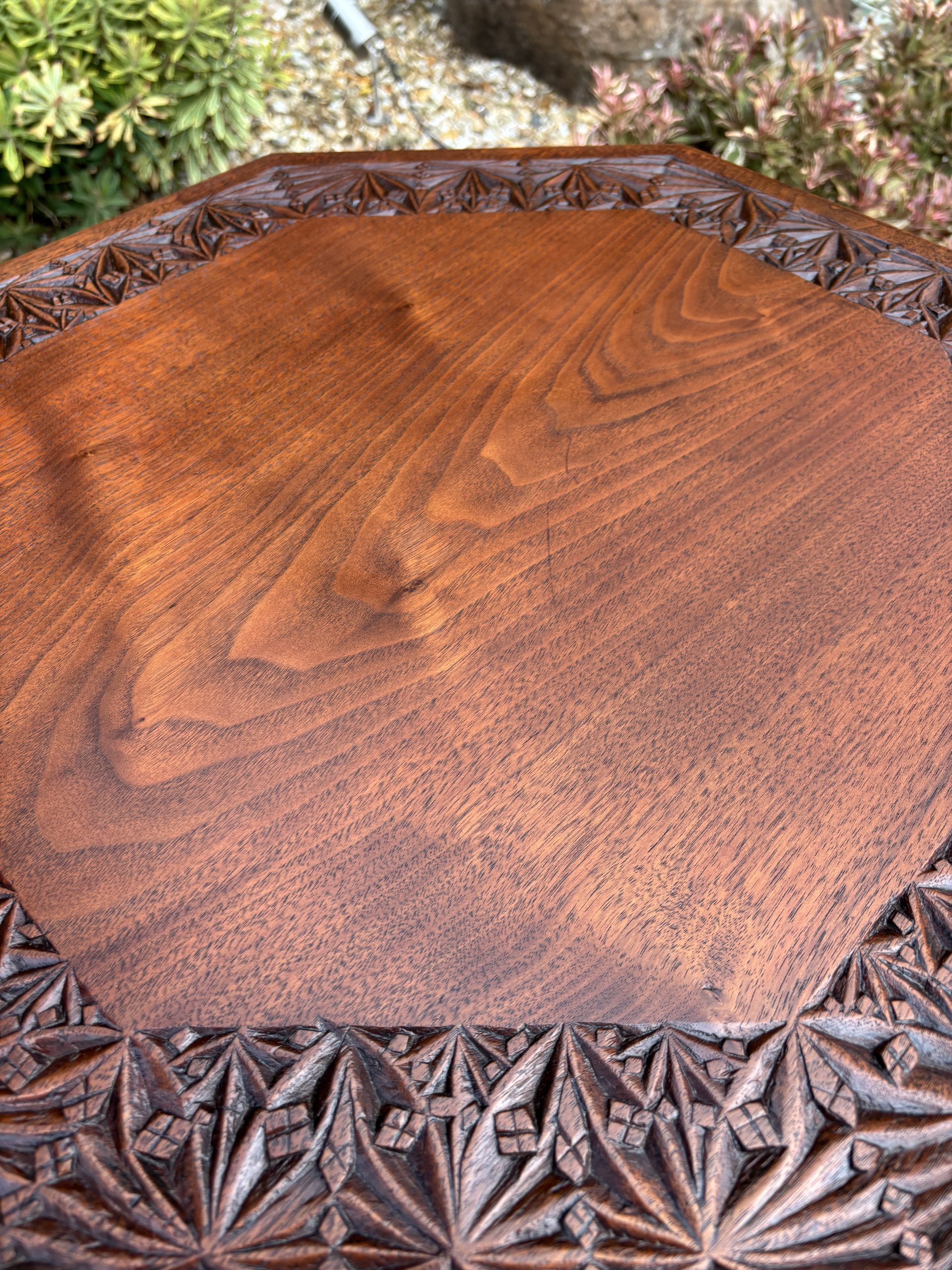 Very well carved Arts & Crafts side table made of solid walnut with a pegged construction. The table top is octagonal in shape with intricate carving to the top and under-shelf.