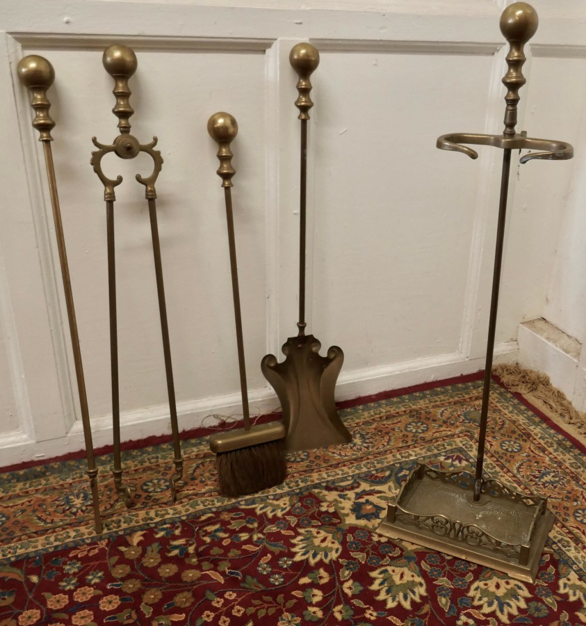 Attractive Brass Fireside Companion Set, Fireside Tools This is a long handled set on its own stand, shovel, tongs and poker The stand 30” tall, 11” wide and 7” deep AC69. Manufacture Date : 1880 Materials : Brass