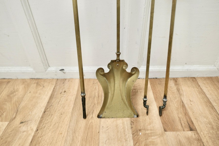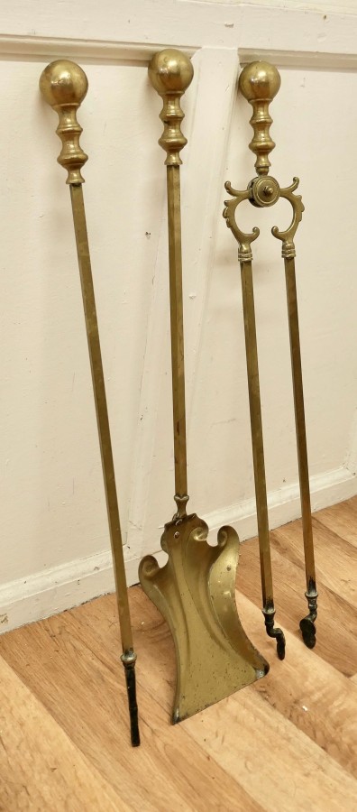 Attractive Brass Fireside Companion Set, Fireside tools A great trio, tongs, shovel and poker, with a large ball handles made in Brass and in good used condition The tools are 28” long THM151. Manufacture Date : 19th Century Materials : Brass