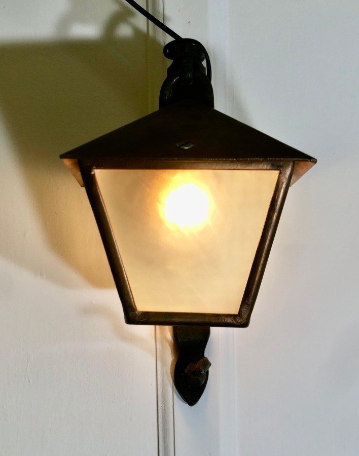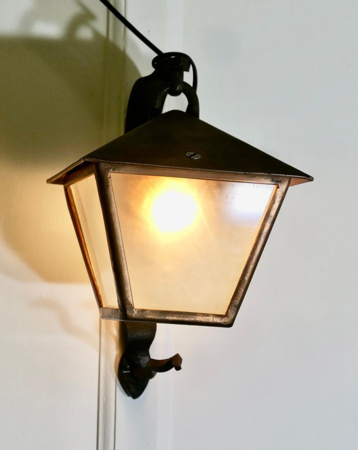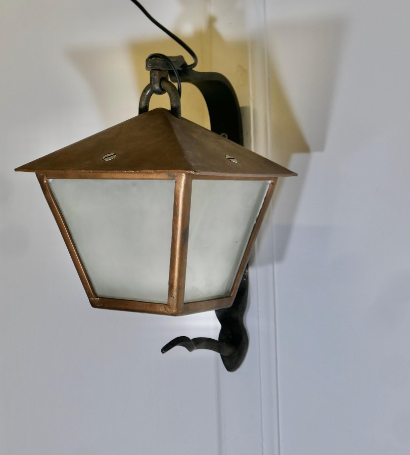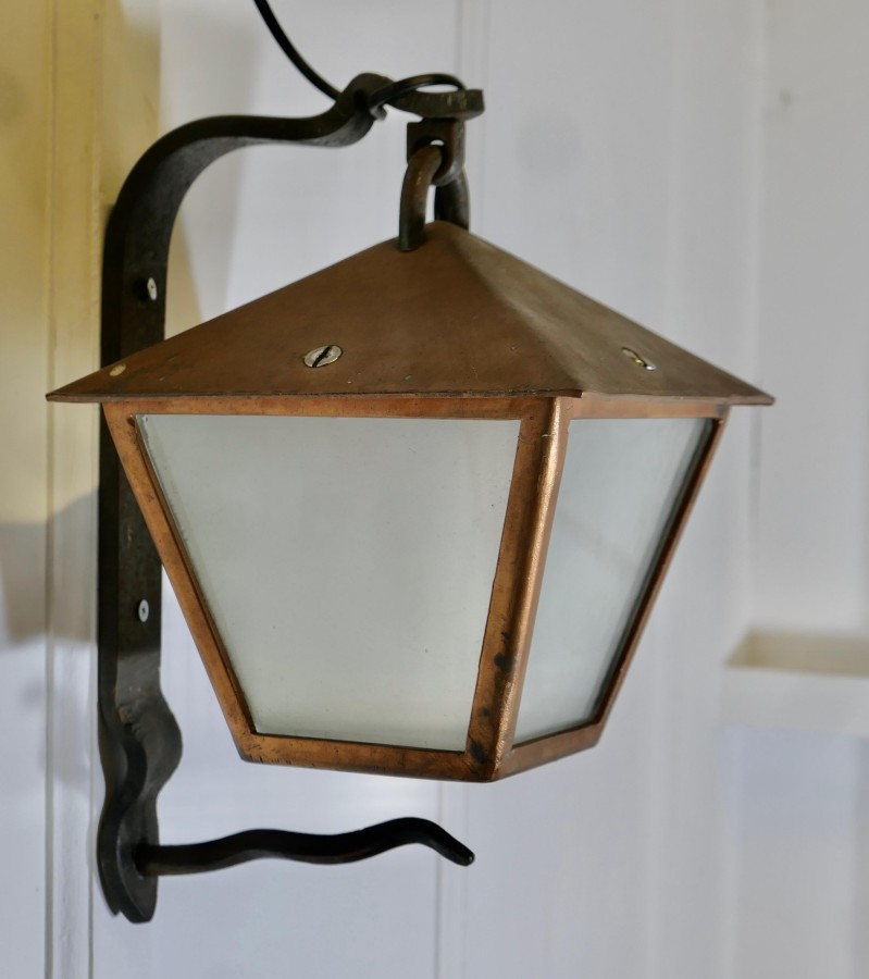 Attractive Iron and Copper Wall Lantern This is a good size Copper Wall Lantern it has4 sides and is hung out from the wall on an iron bracket The lamp is wired for electricity and will need to be connected to an supply The metal work is heavy and has a great look This is a superb piece of 19th century metal work there are no cracks in the glass The Lantern is 9” square and 14” high NG187 Manufacture Date : 19th Century Materials : Copper