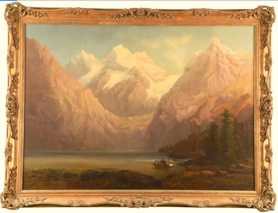 19th Century Austrian Alpine Mountainous Landscape Oil Painting Depicting Lake & Boat