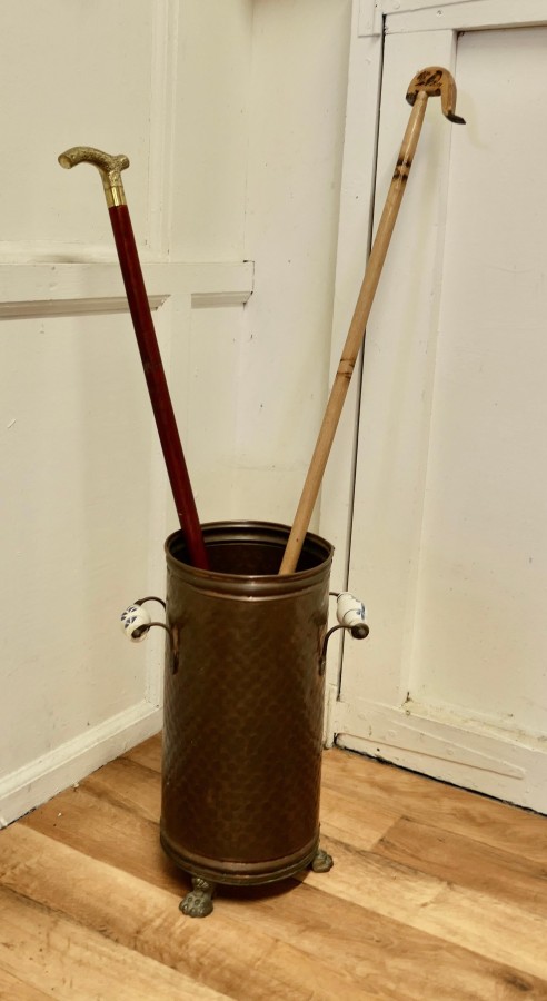 Beaten Copper Stick Stand, Umbrella Stand This good looking piece is round in shape with Delft style handles The Stick stand is in good used condition, it is 19” high and 18” in diameter THM32 Manufacture Date : 1960 Materials : Copper