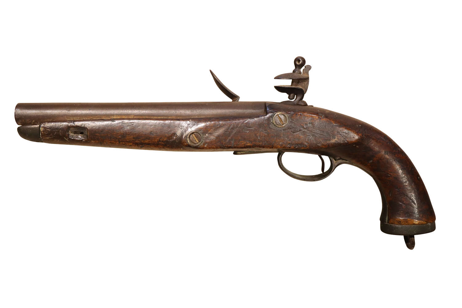 A genuine Belgian flintlock sea service pistol, dating to around 1800 and presented in wonderfully untouched, as-found condition. This robust naval pattern features the characteristic heavy walnut stock, full brass furniture and large plain steel lock typical of Continental maritime issue.