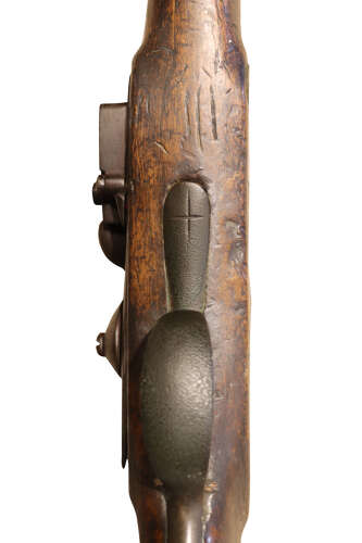The lock is currently frozen, with all components present but seized through age and long-term storage. The stock shows honest wear, numerous surface marks and the deep patination expected of an uncleaned example. Barrel and metalwork retain a dry, untouched surface throughout.