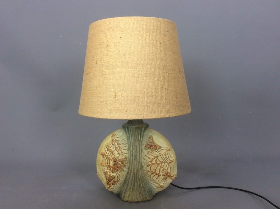 Mid Century studio pottery table lamp by Bernard Rooke c1960’s, having a decoration of moths and spider’s web from his nature series. Signed with his initials BR. Complete with a hessian shade which has been made to a similar design of what the lamp would have had originally. In good condition. Rewired & PAT tested.