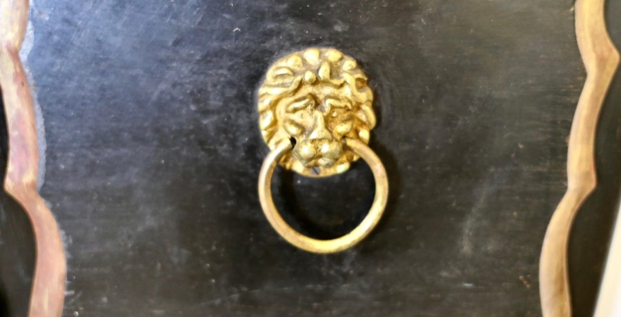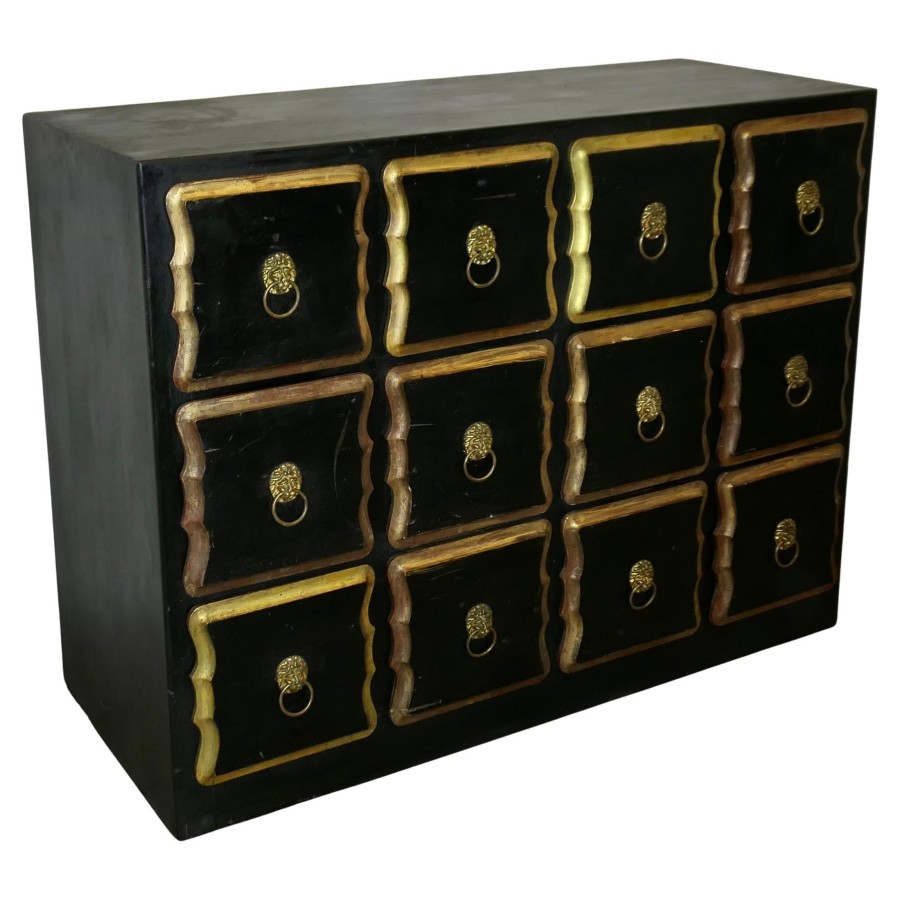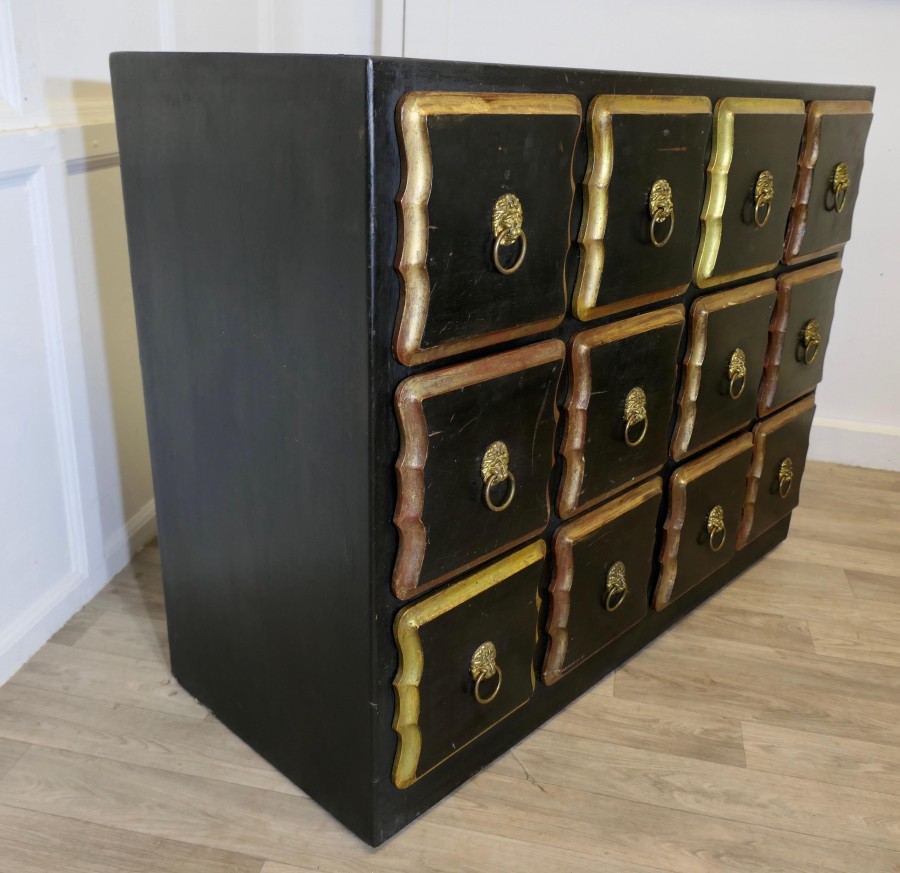 Black and Gold Haberdashery Draper Shop Cabinet This is a Large Chest of Drawers, it has an unusual combination of 12 long square drawers, the drawers have original brass Lions Mask ring handles The Chest is very solid and heavy, in black lacquer and gold, this is a very heavy piece of shop display furniture The chest is in good vintage condition and offers a great amount of storage inside The Chest stands 34” high, it is 44” wide and 18” deep ZX218 Manufacture Date : 1930 Materials : Walnut