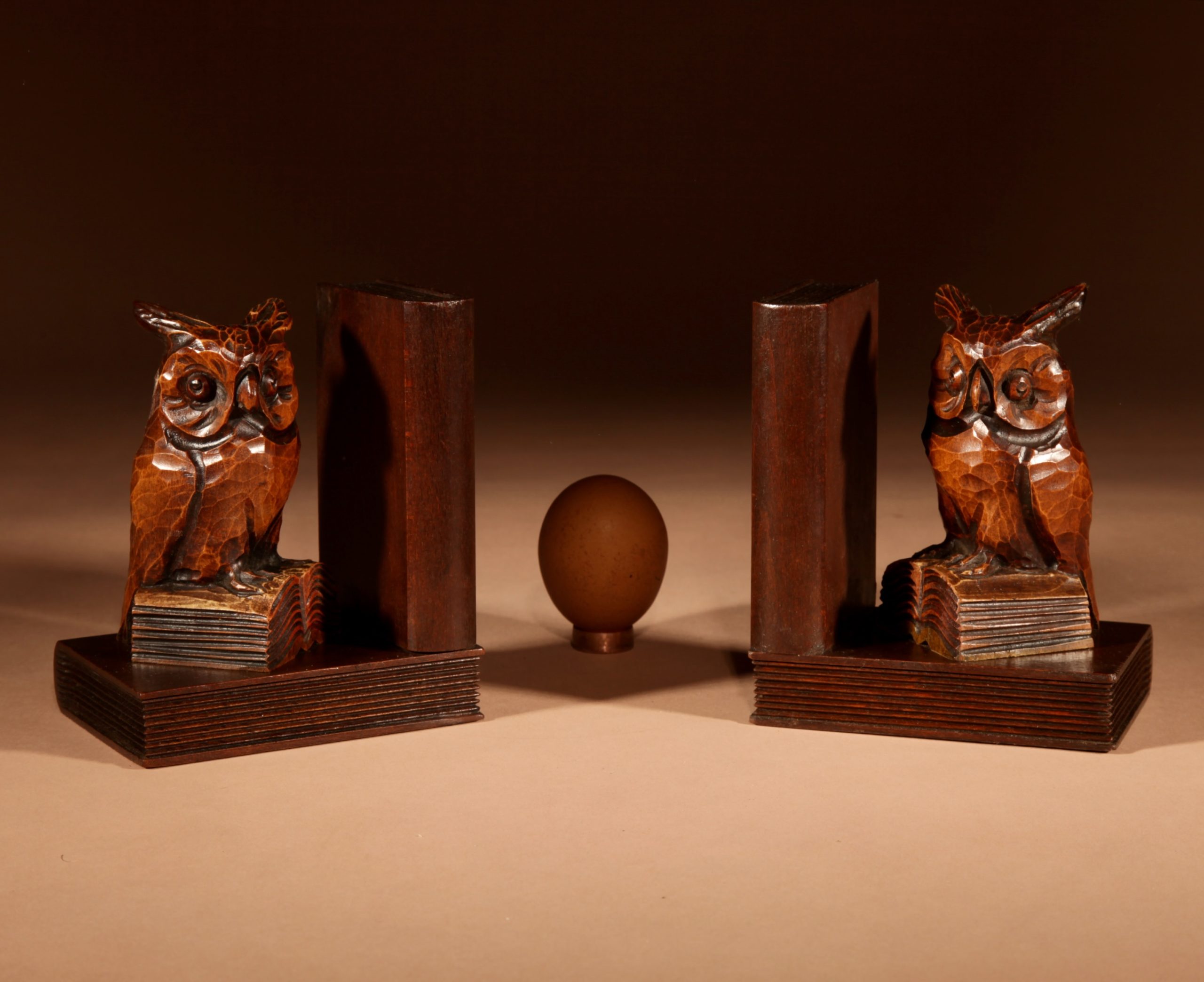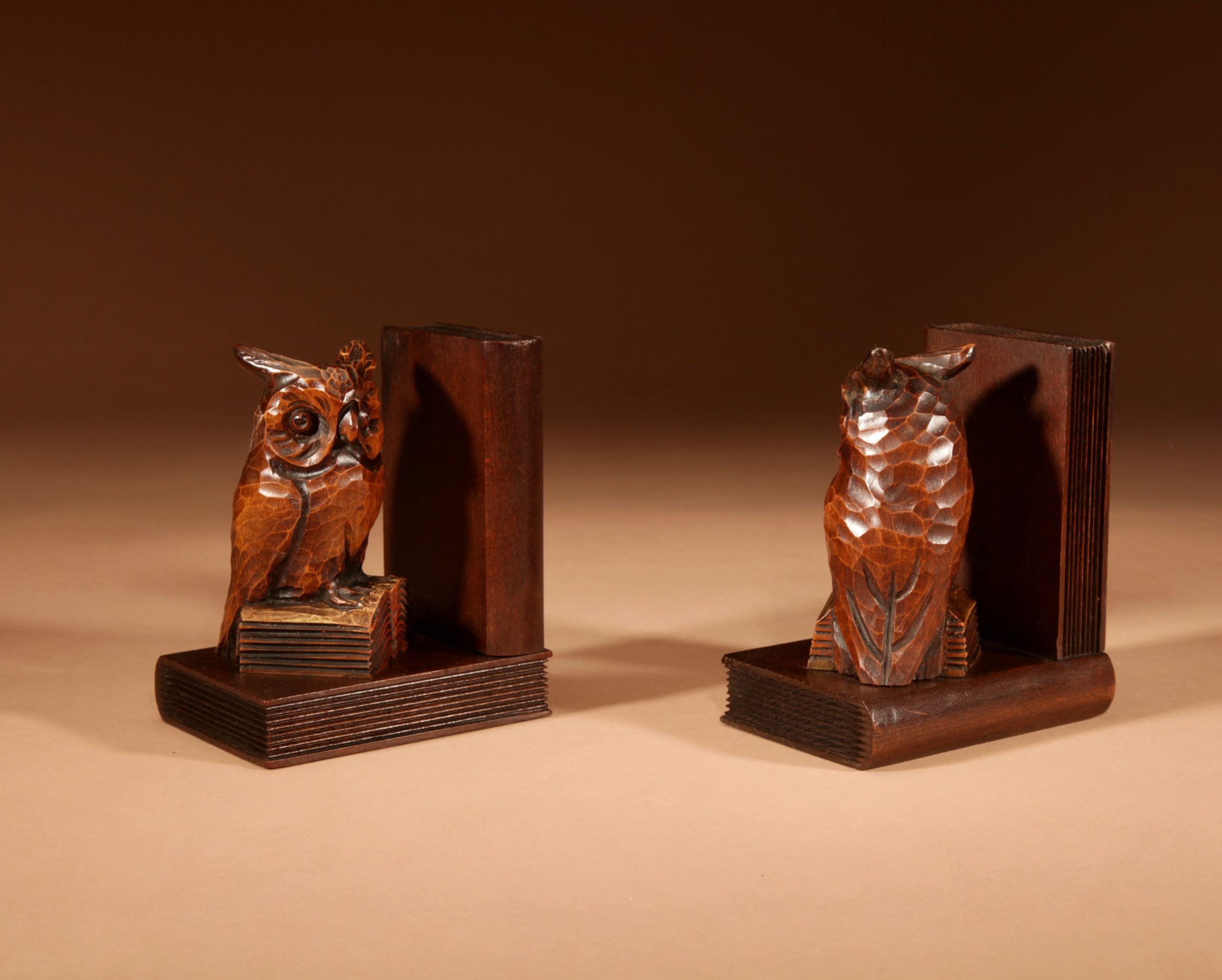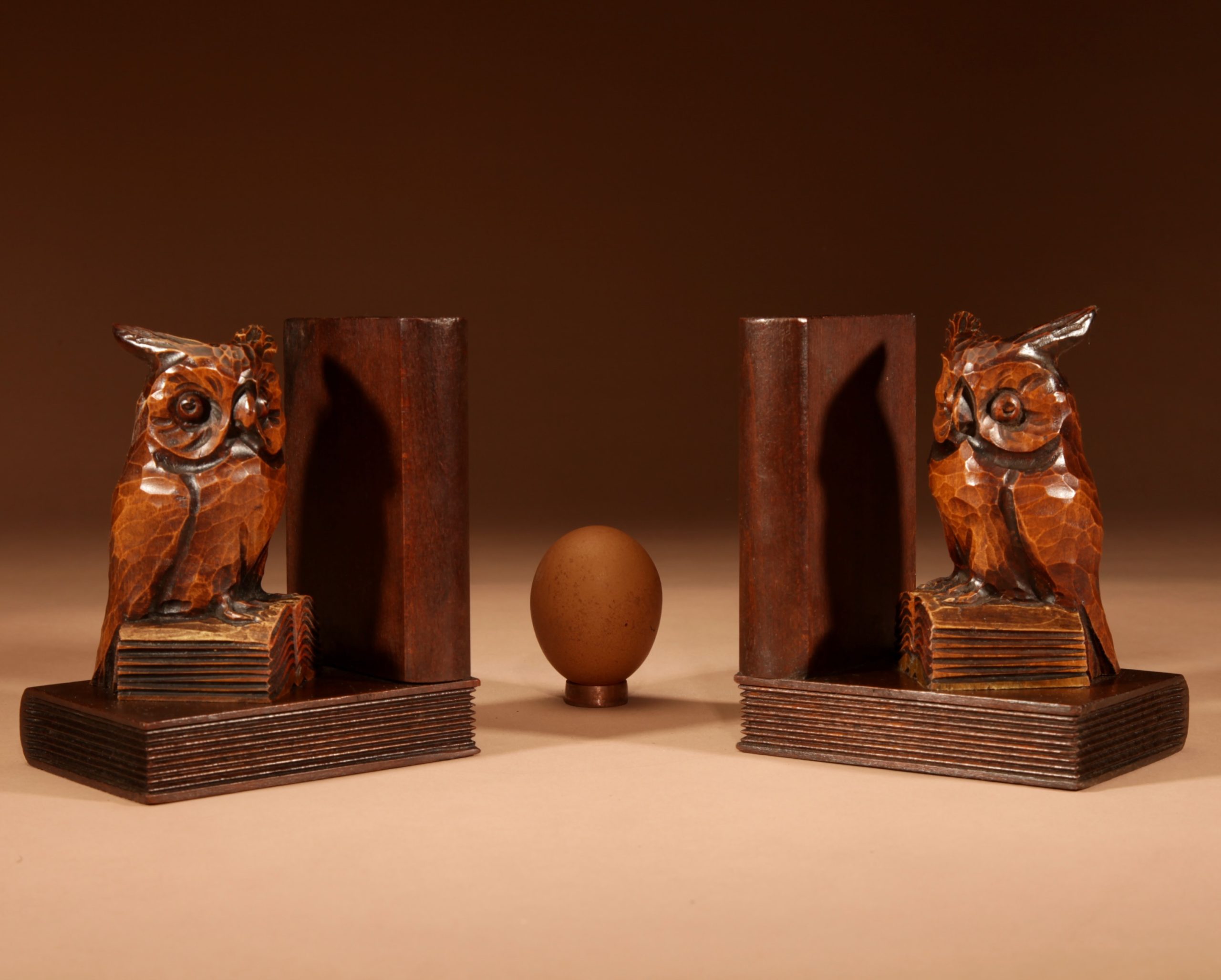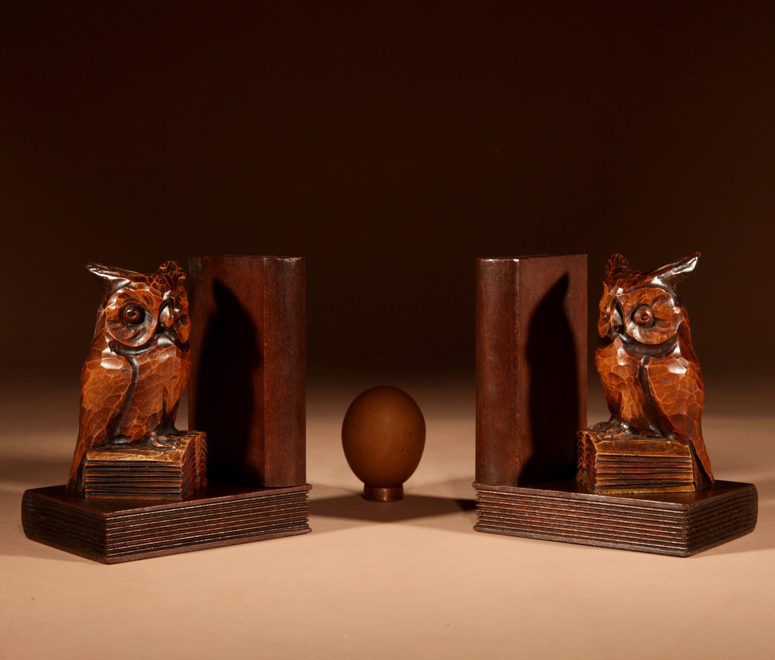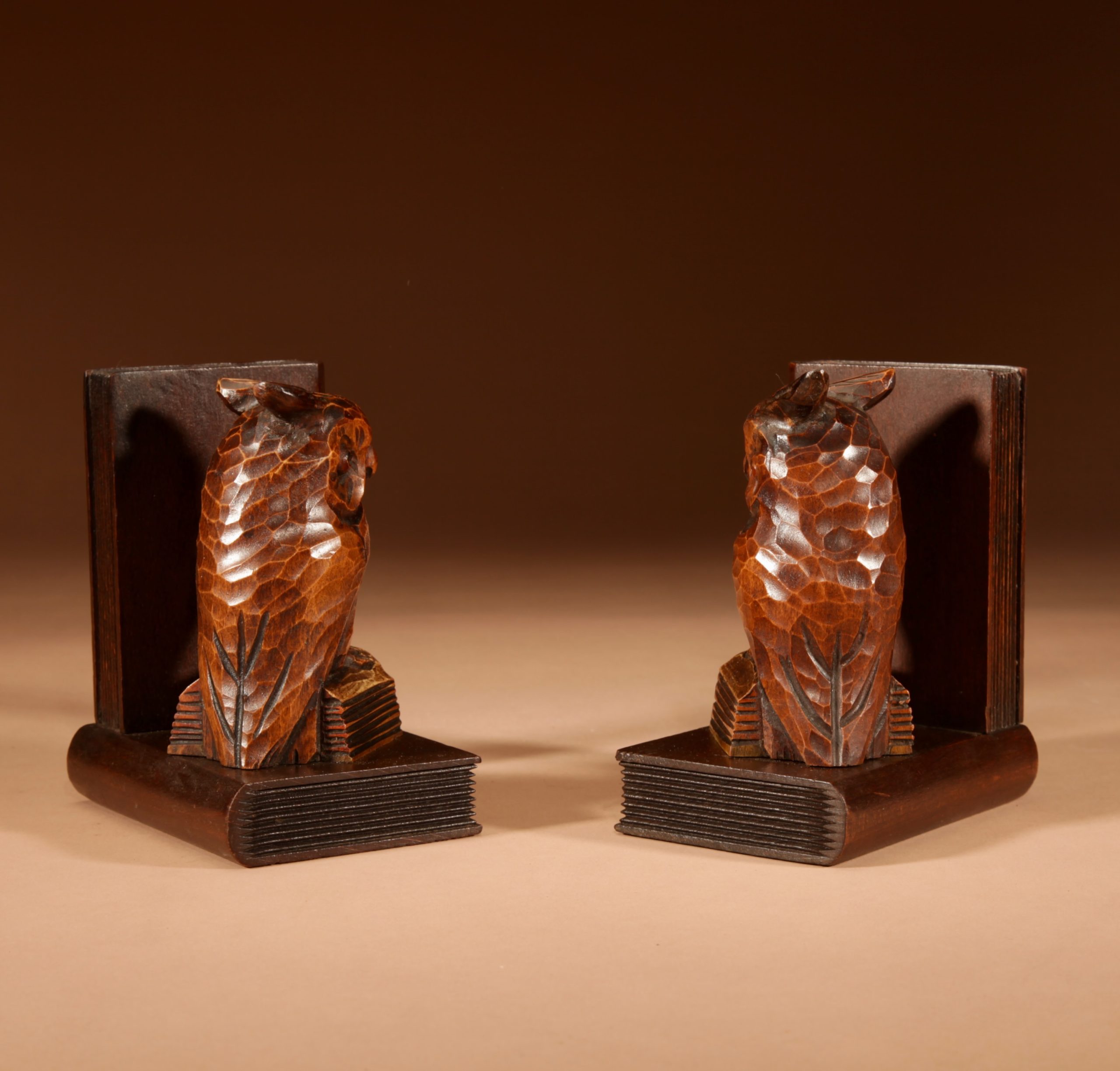 Black Forest Amusing Pair Of Owl Carved Bookends Circa 1900-20.