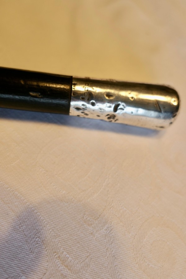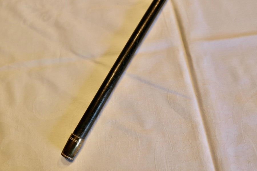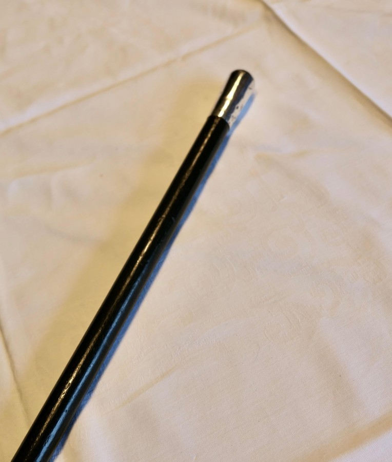 Black Walking Stick With Silver Hall Marked Handle. The Cane dates from 1900 is in good antique condition a few dents to the Silver and general wear consistent with age. The cane is 36” long GF87 Manufacture Date : 19th century Materials : Silver