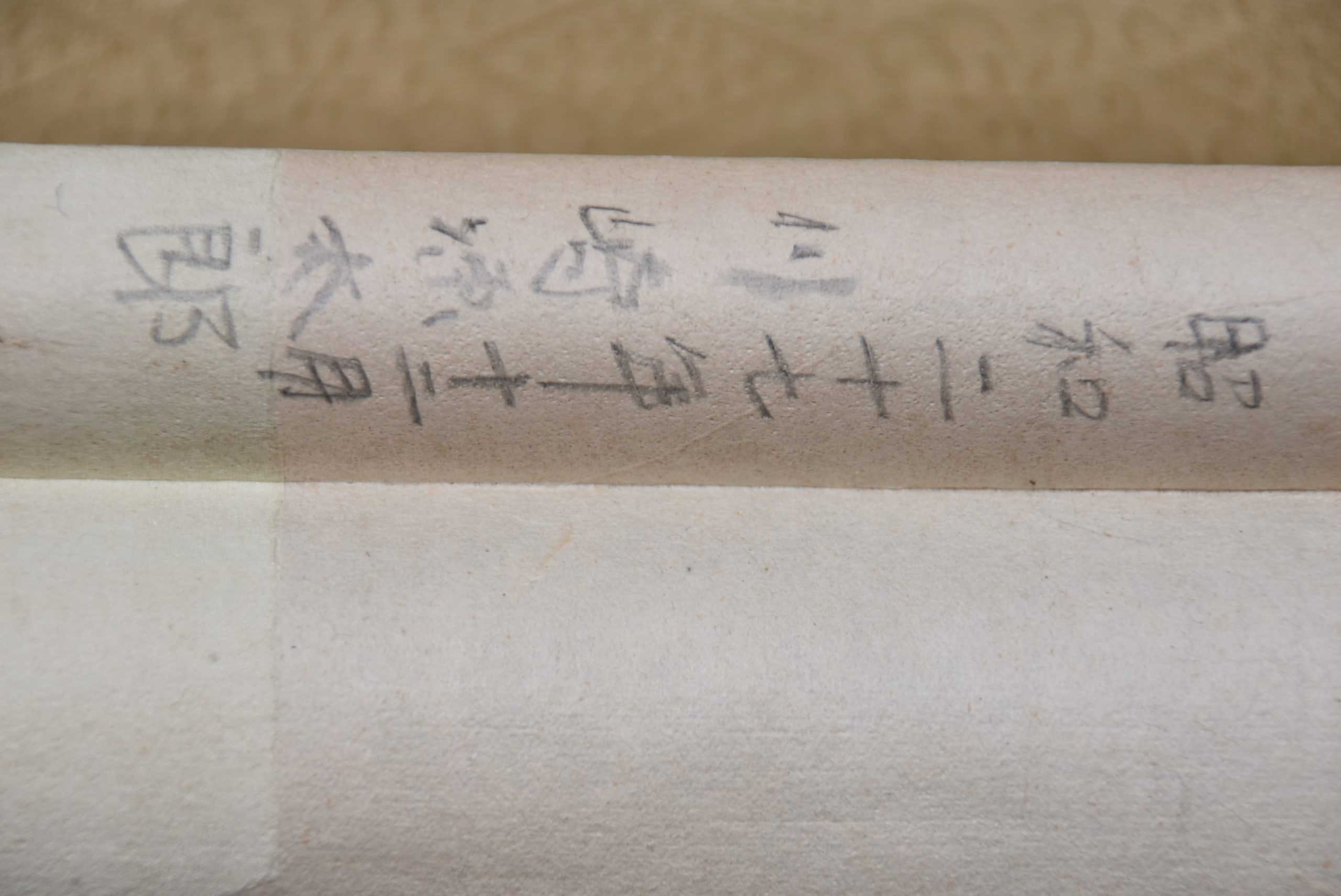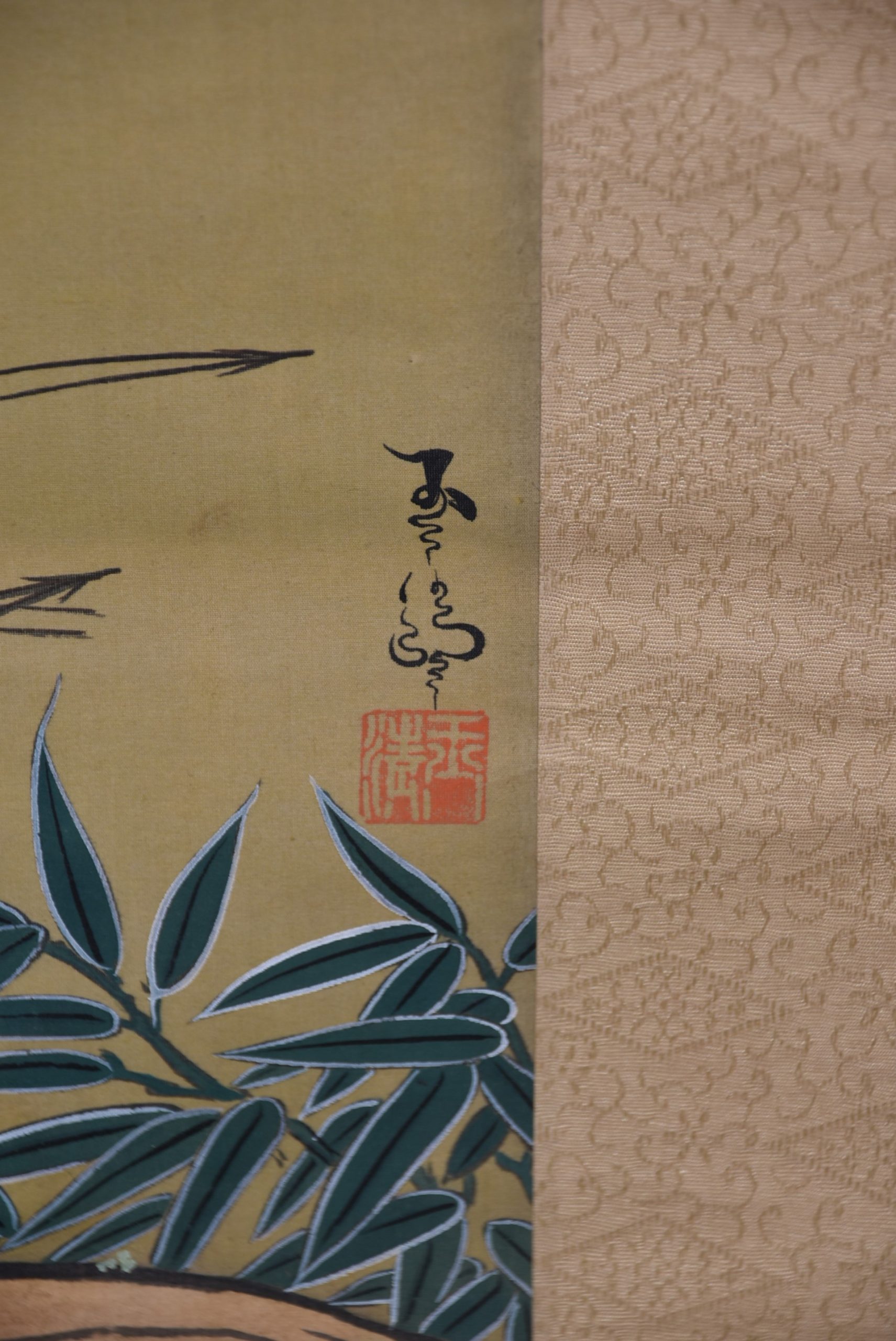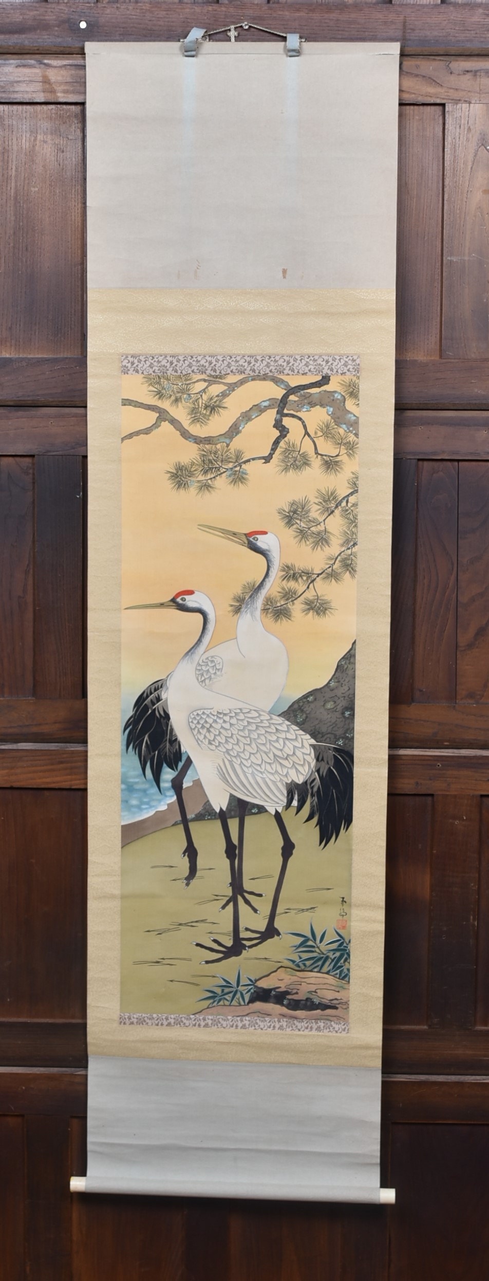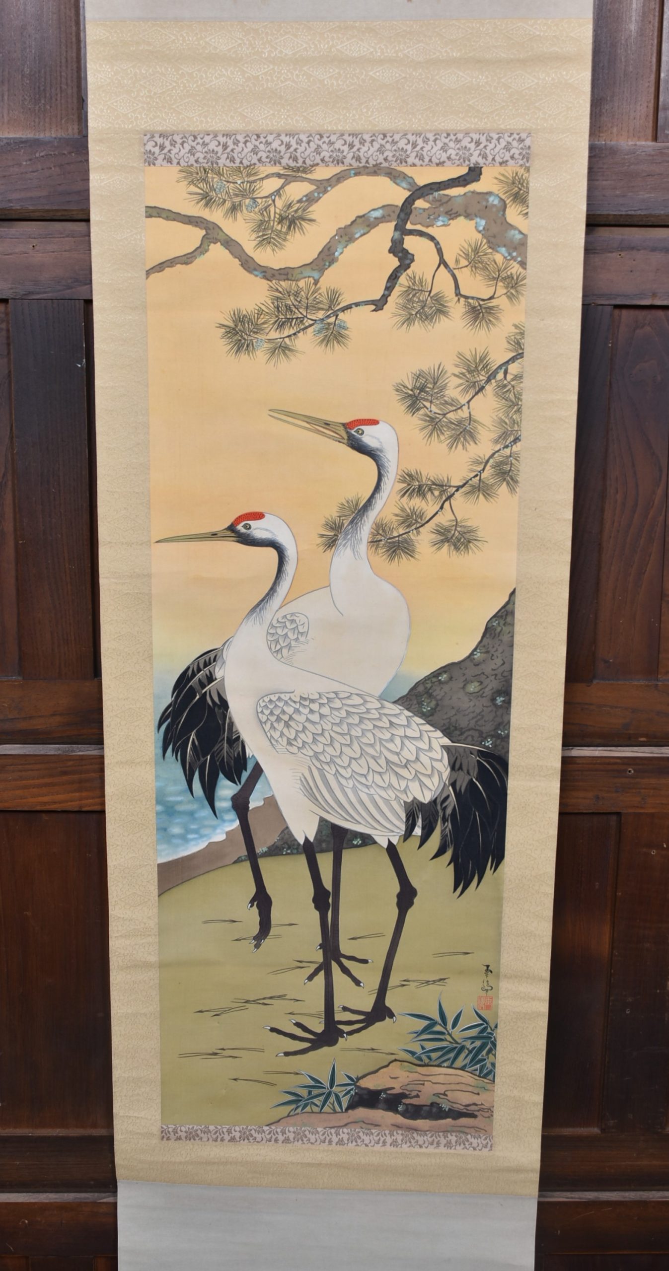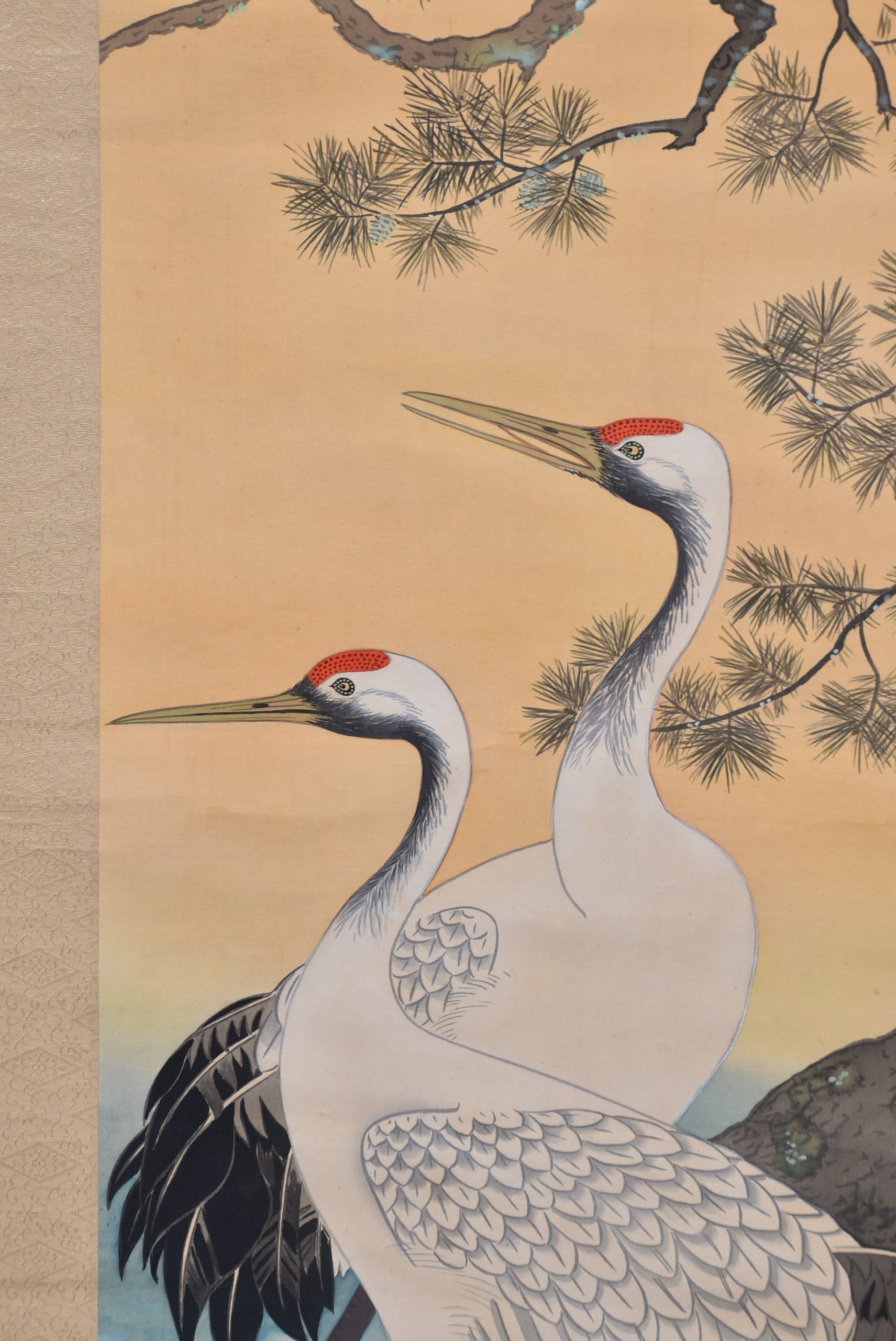 A finely painted Japanese hanging scroll (kakejiku) depicting a pair of white cranes standing beneath the sweeping branches of an ancient pine. The scene is set against a softly graded sky, shifting from warm tones to pale blue, creating a gentle sense of dawn or dusk. The subtle palette lend the painting a quiet elegance, allowing the cranes to take centre stage. Mounted on an ornate brocade border with plain silk sections above and below, the scroll hangs beautifully and remains in very good condition. A timeless and uplifting work, ideal for adding a touch of Japanese refinement and symbolism to any interior. A storage case accompanies the piece.