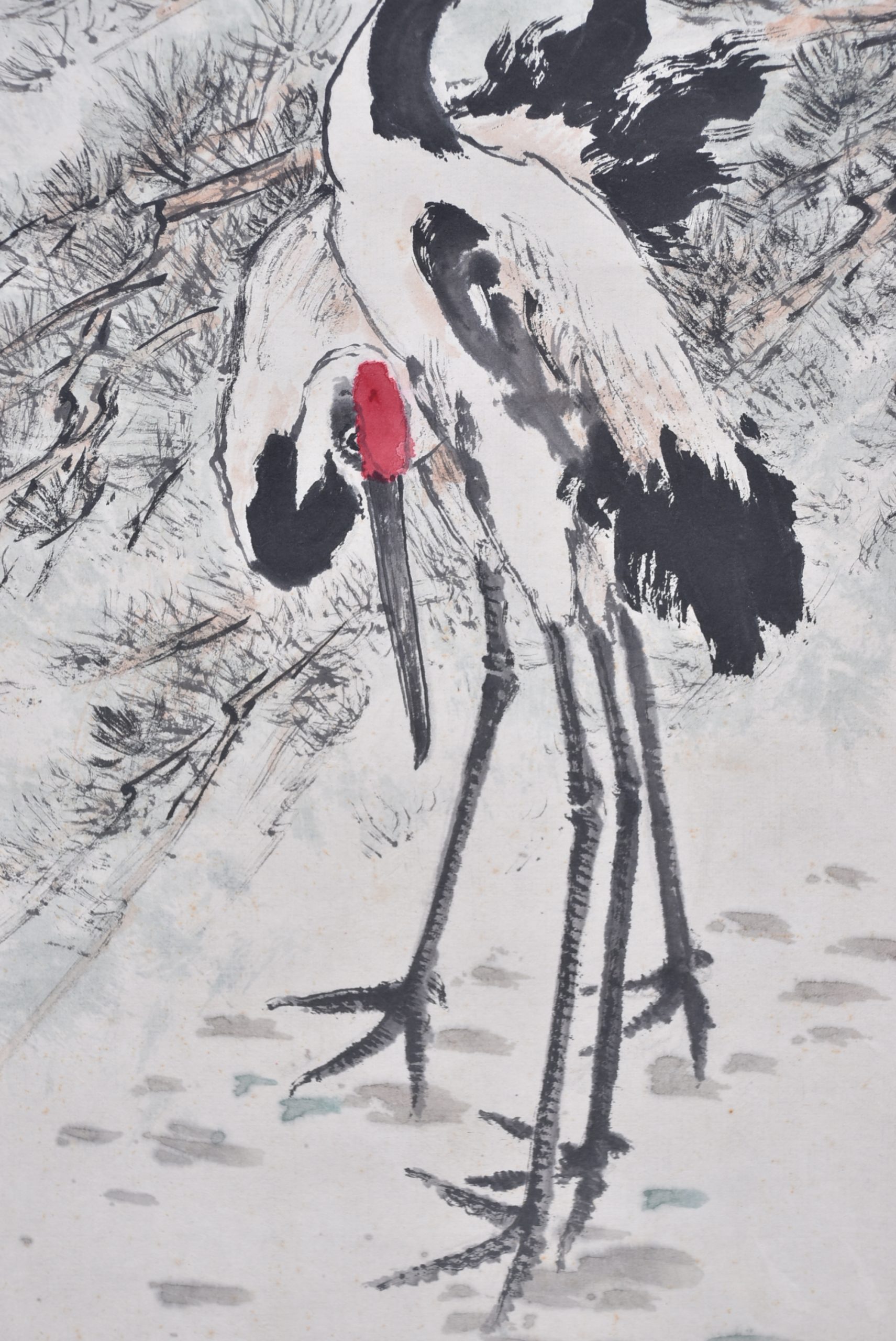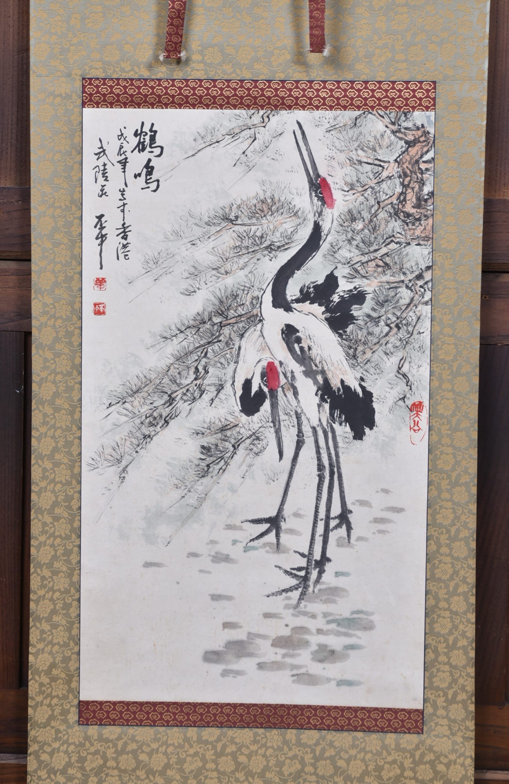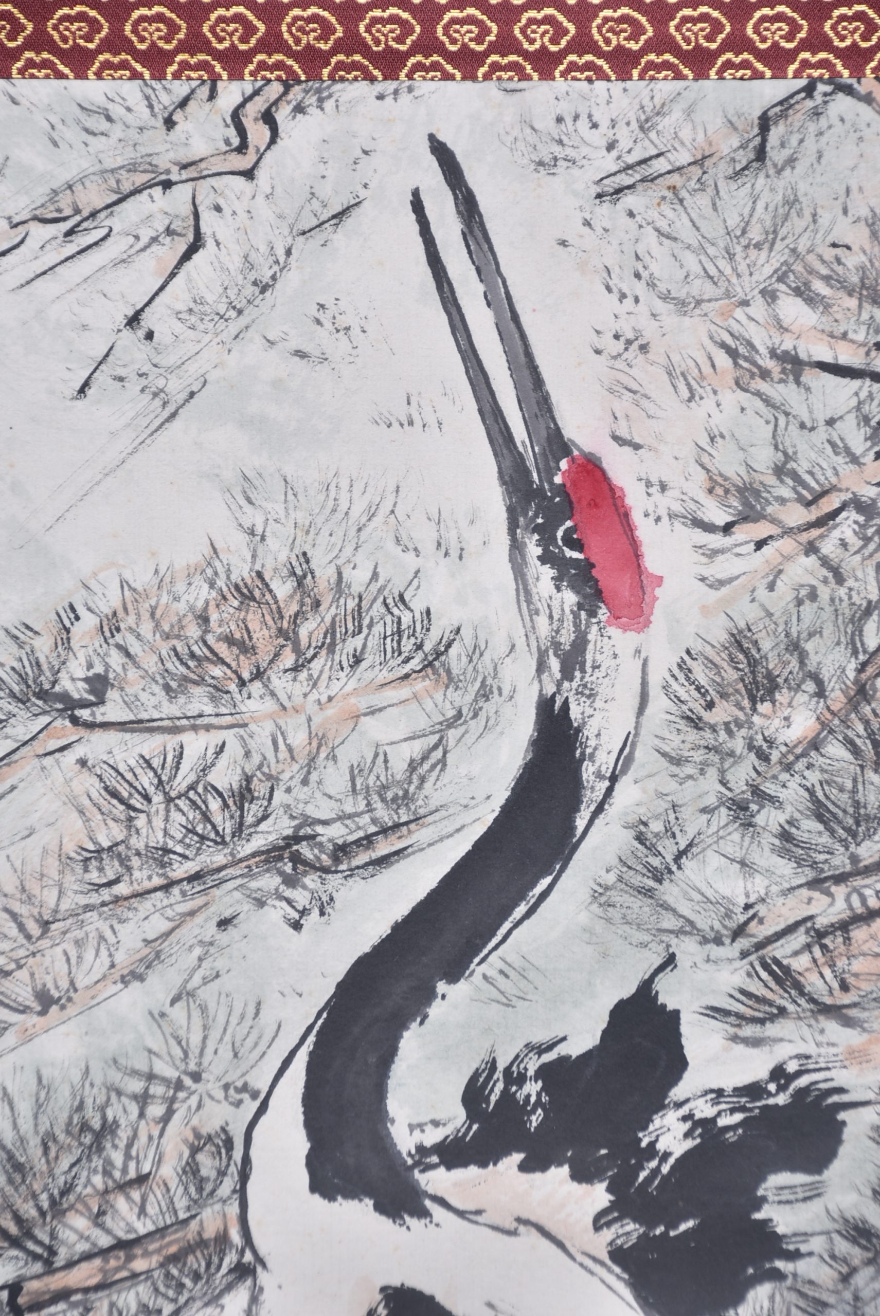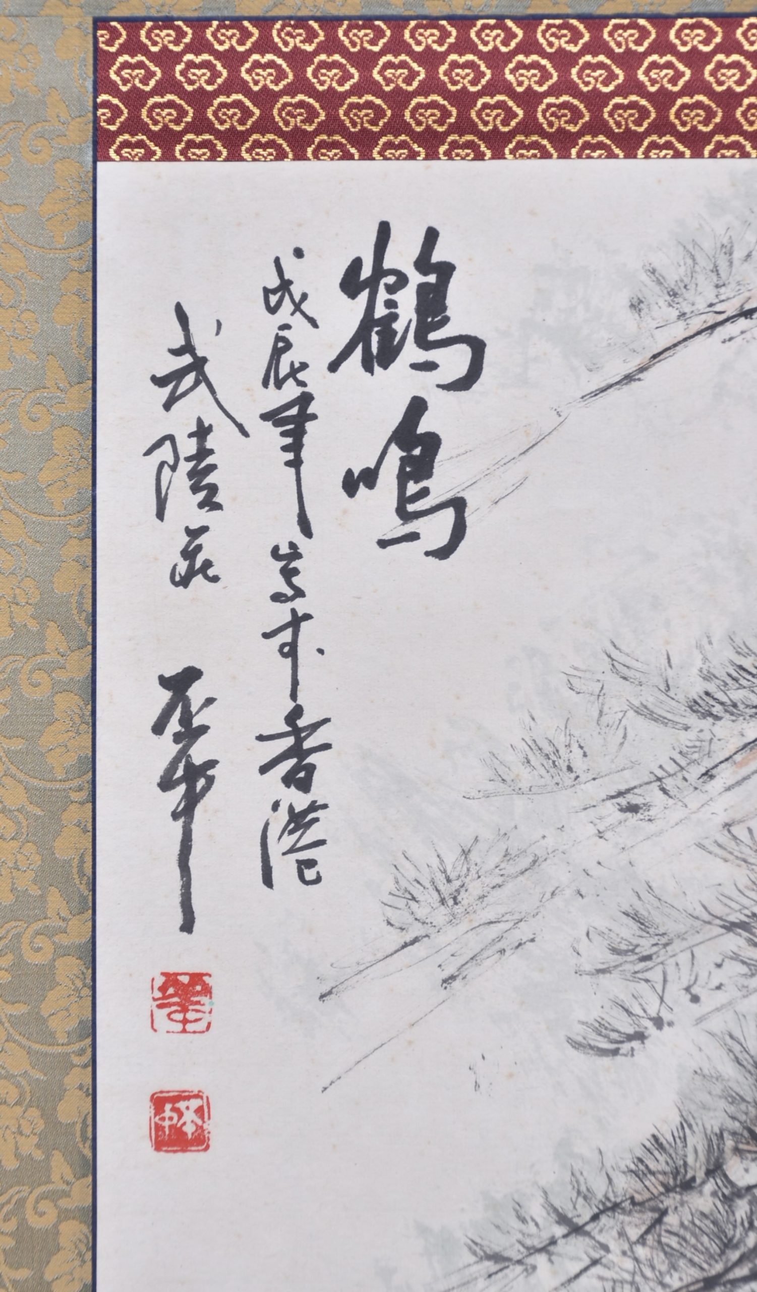 A beautifully composed Japanese hanging scroll depicting red‑crowned cranes among ancient pine — a classic motif symbolising longevity, steadfastness and auspicious fortune. A vertical inscription with the artist’s seal sits to the upper right, adding balance and authenticity. Mounted on richly patterned brocade in warm gold and russet tones and ready to hang. A storage case accompanies the piece.