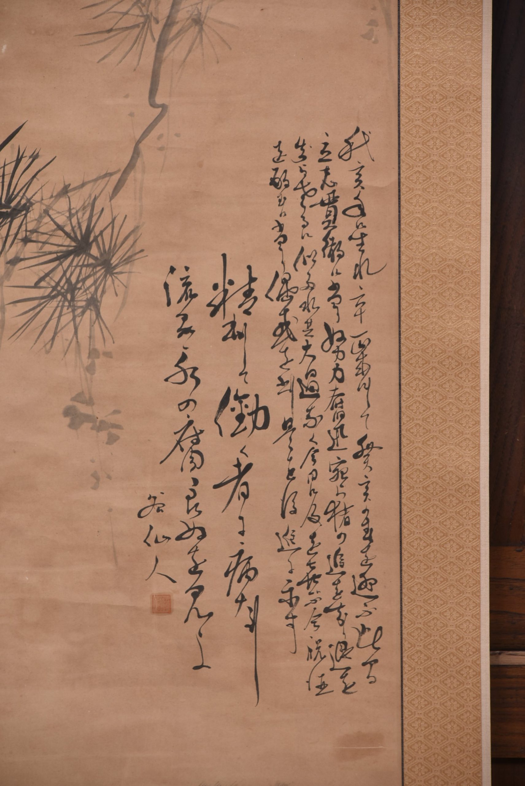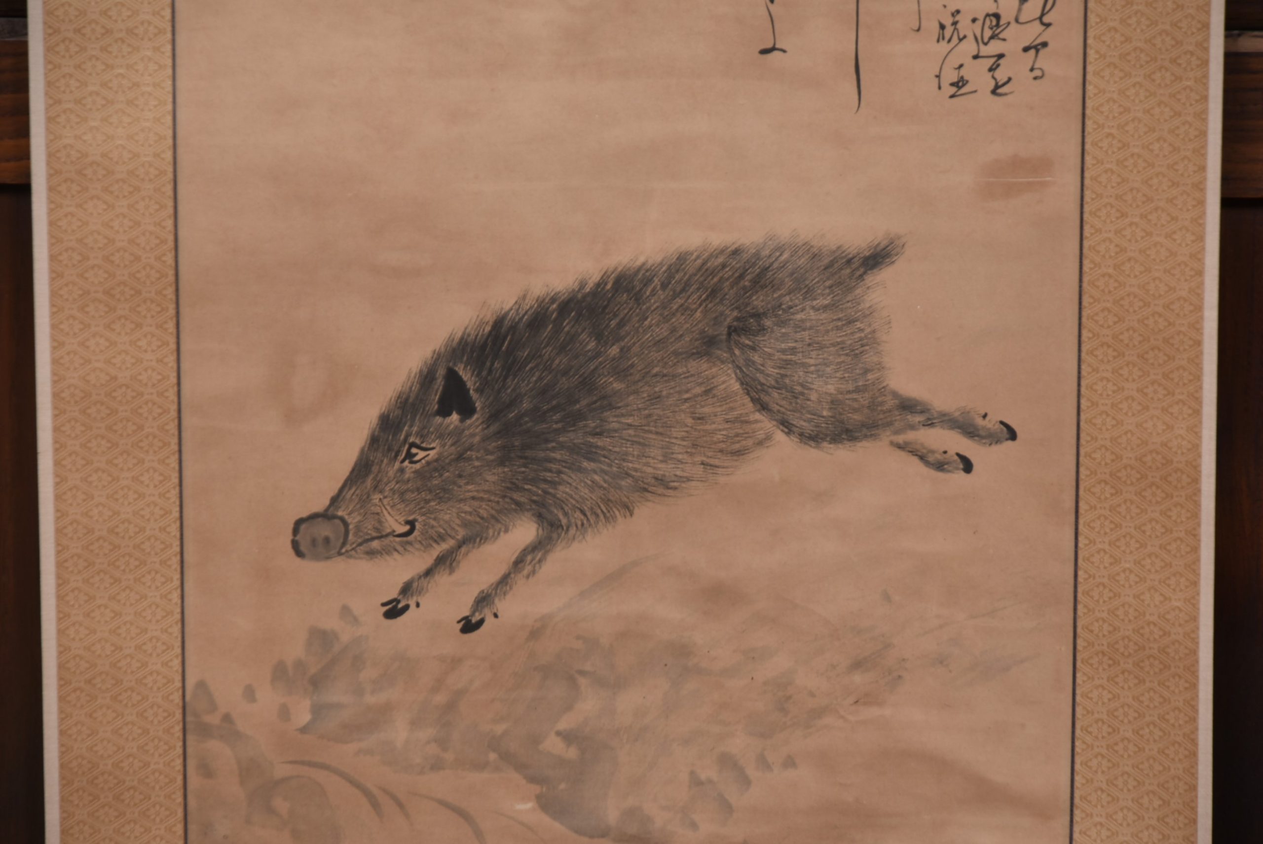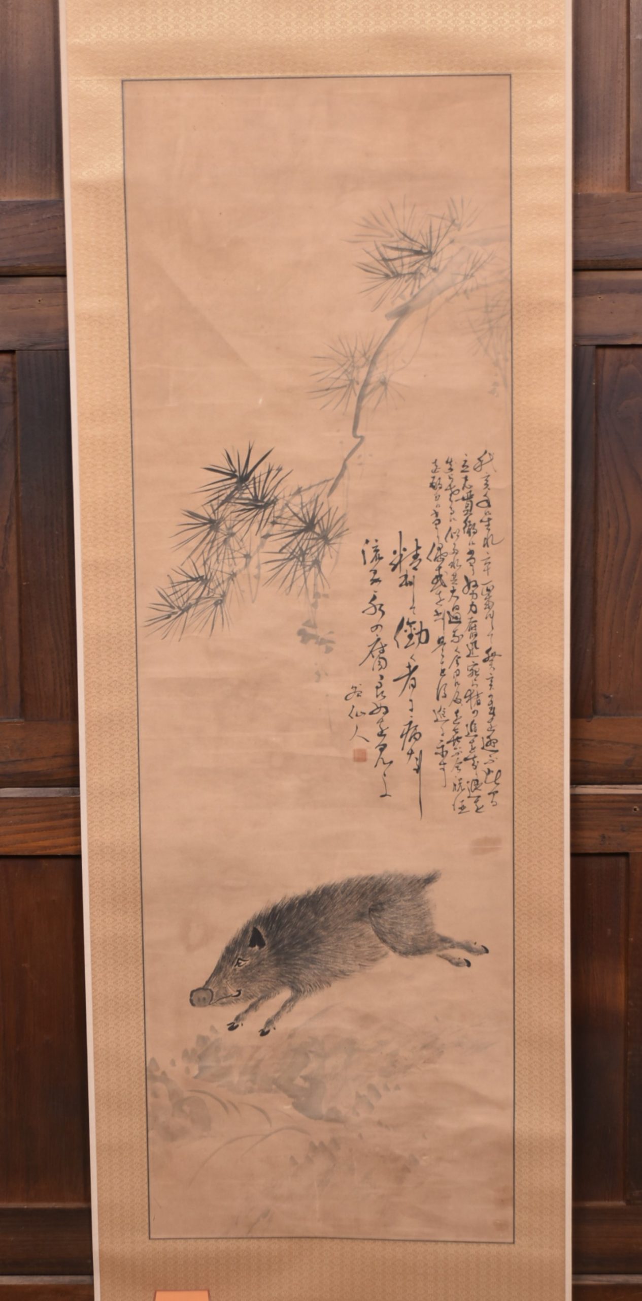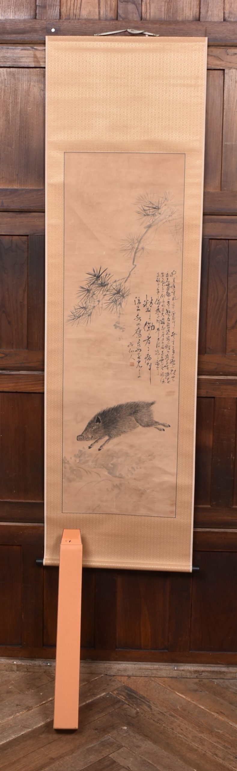 A hand painted Japanese hanging scroll depicting a wild boar captured mid‑stride beneath the sweeping branch of a pine. The pairing of pine and boar is a classic auspicious motif, combining strength, determination and good fortune. To the right, a vertical inscription in flowing calligraphy , adding balance and credibility to the painting. A storage case accompanies the piece. A storage case accompanies the piece.