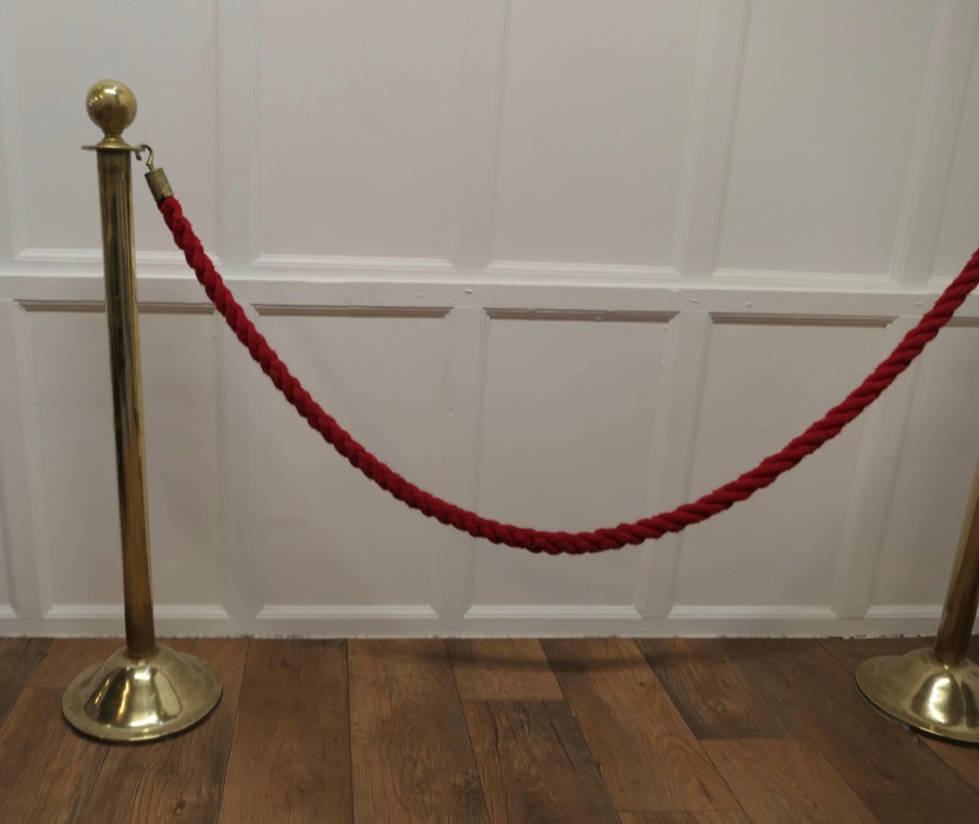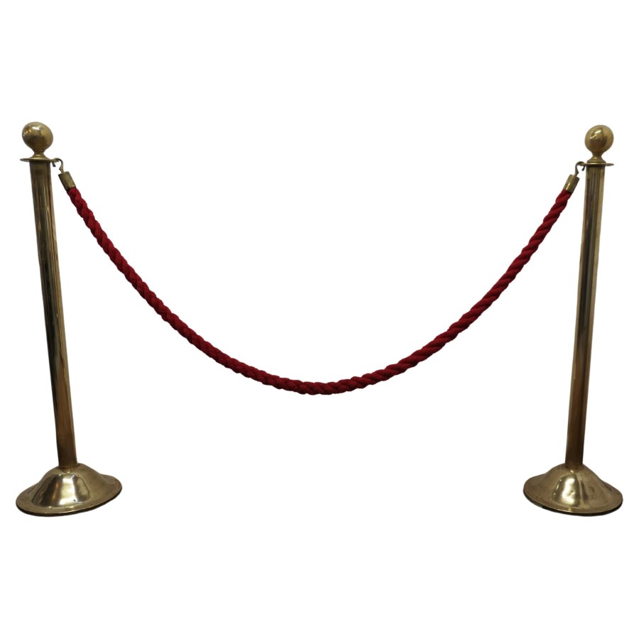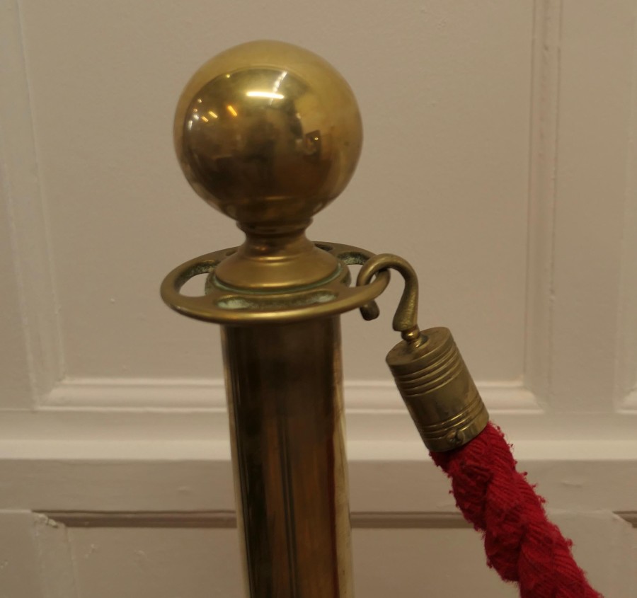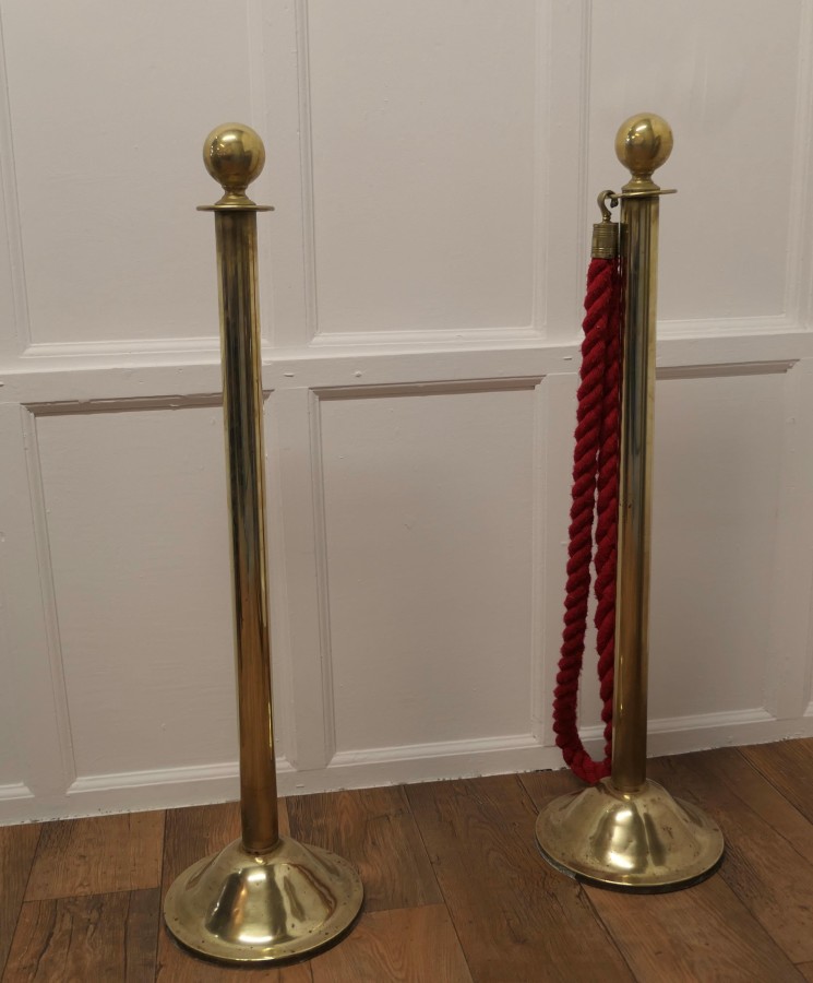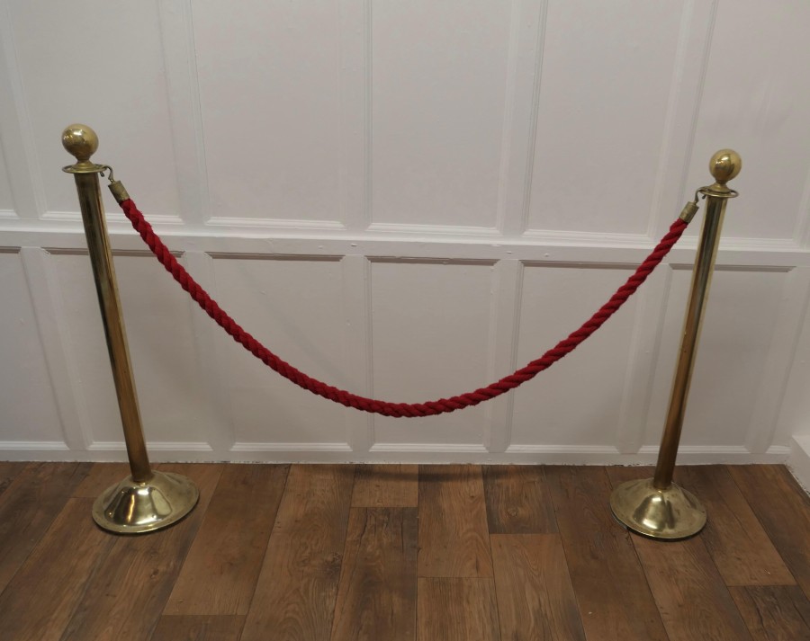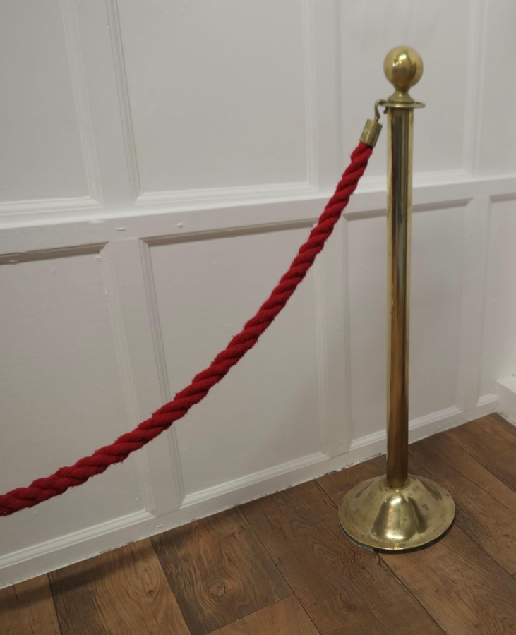 Brass and Red Rope Barrier A useful piece from an Old Theatre, the barrier is 2 brass columns with a red rope to joining them The posts are 42” high and 11” in diameter at the bottom, the rope is 80” long overall TMS35. Manufacture Date : 1930 Materials : Brass