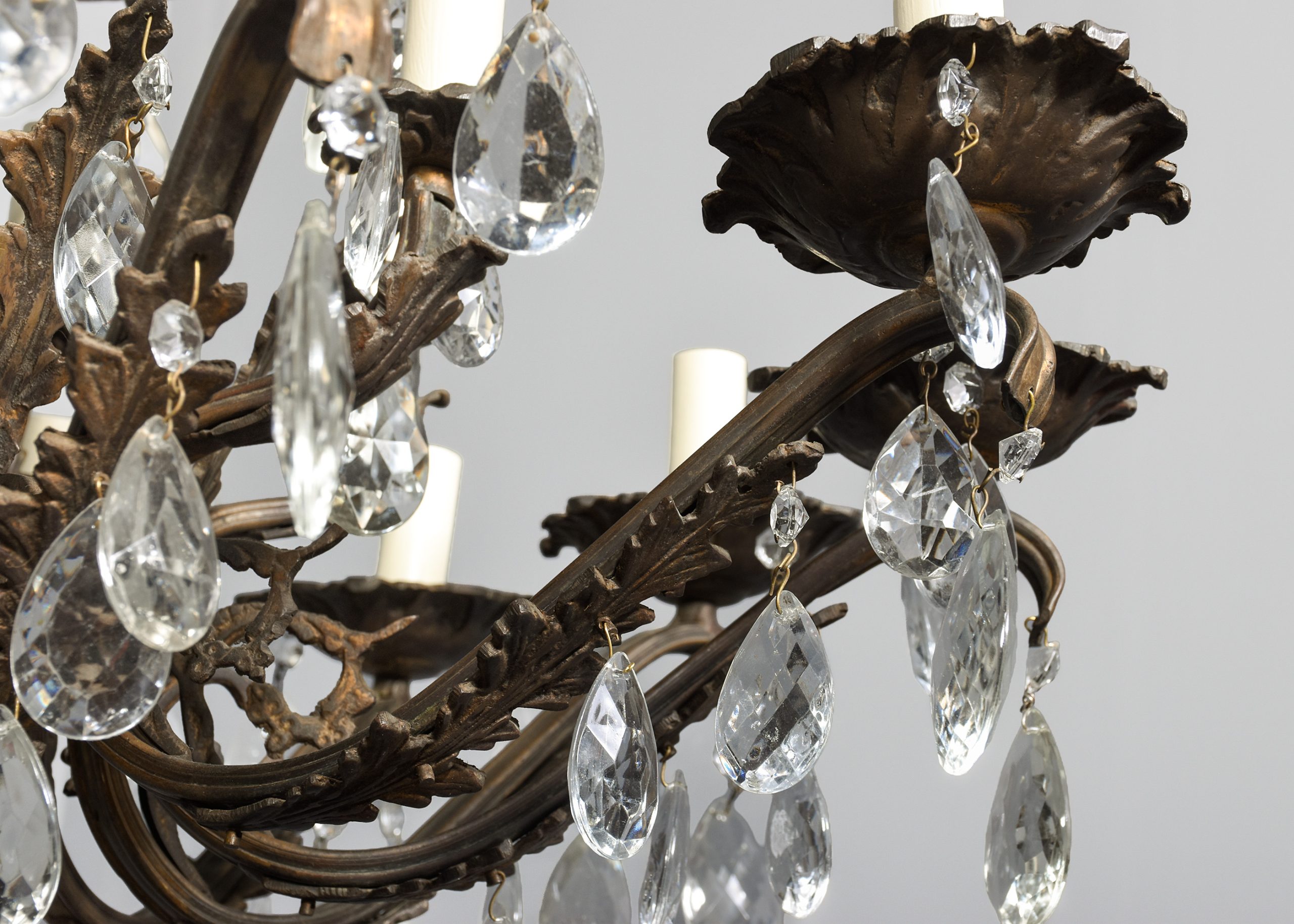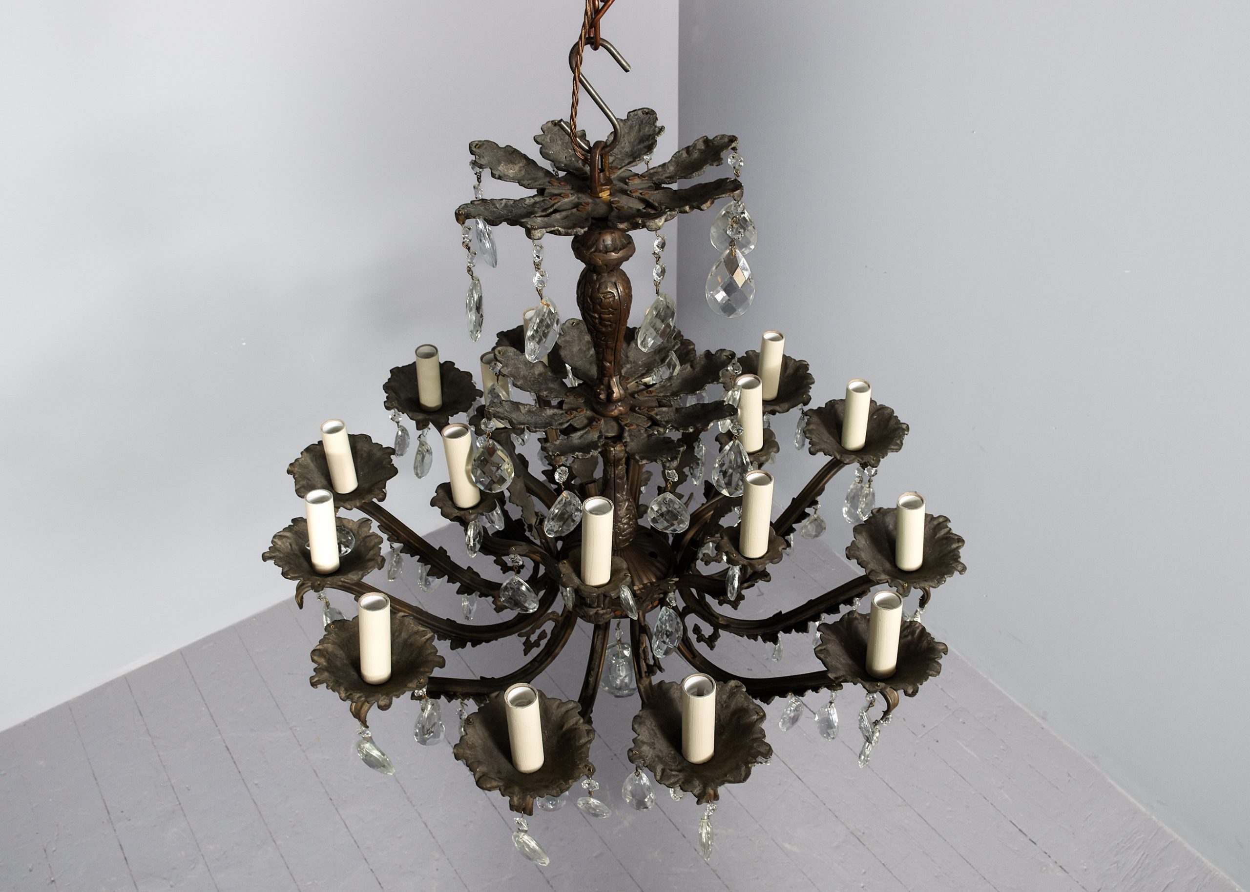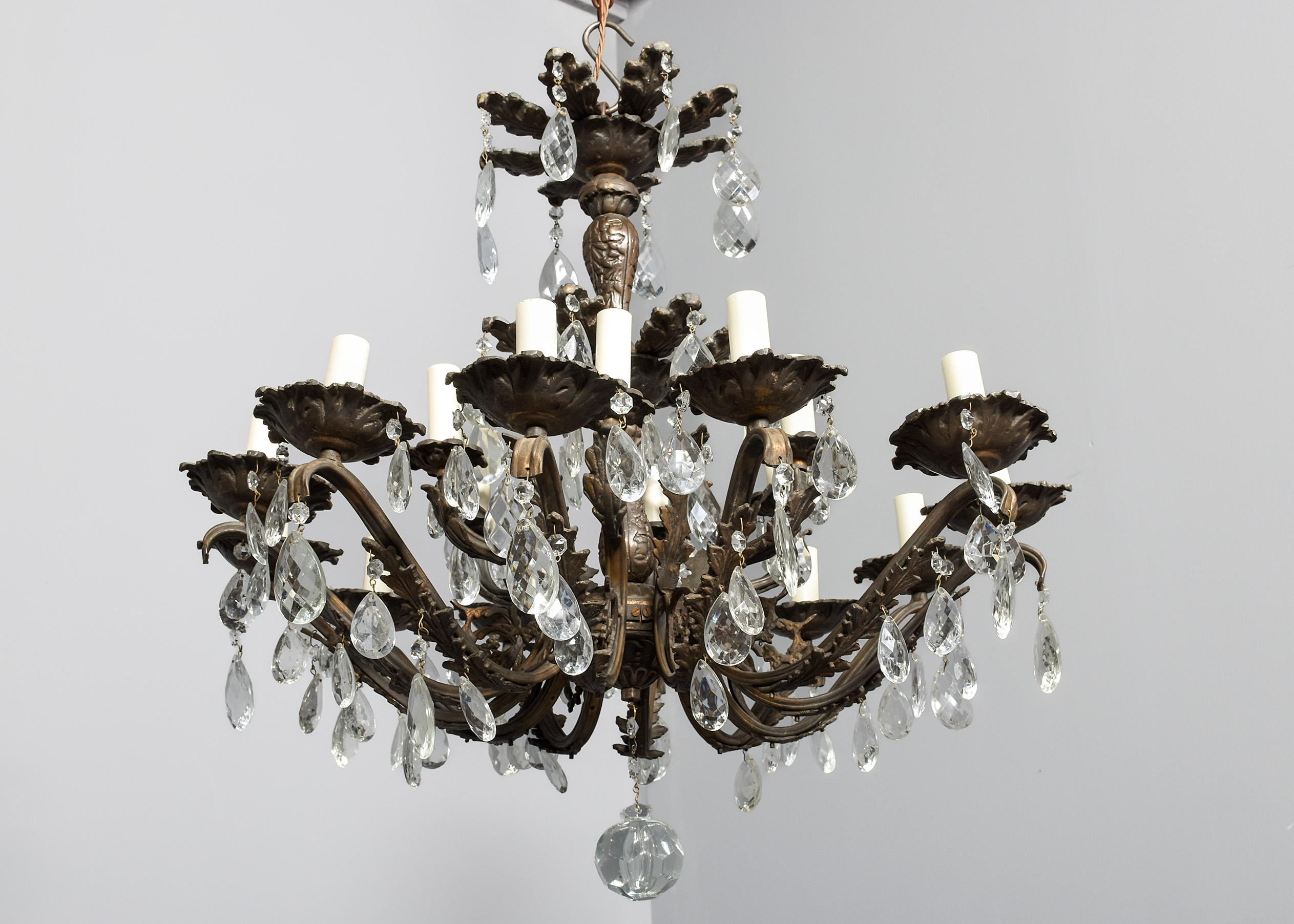 Circa 1920s. A large circular bronze and crystal light fitting, the petal shaped top, with each of the 6 petals with crystals hanging, with a similar tier beneath, the central stem in two sections one issuing 6 small shaped arms surmounted by 6 faux candles with simple drops to the sides, the other with 12 elaborate arms with foliate casting on the inside and on the facing with drops, and elaborate drip trays with faux candles, giving a total of 18 lamp holders. The base of the central stem has a conical-shaped downward-facing section with a large facetted crystal ball beneath.