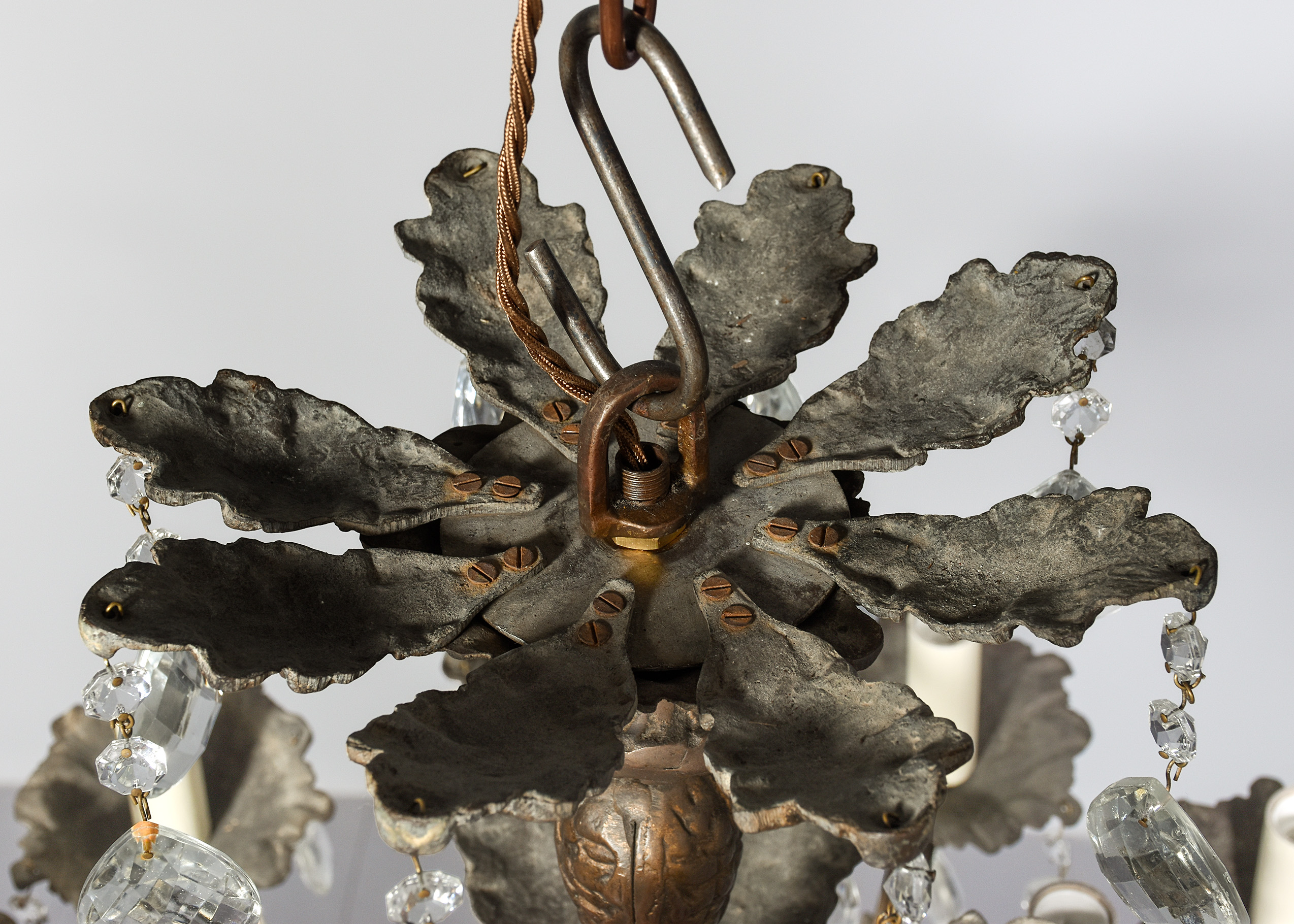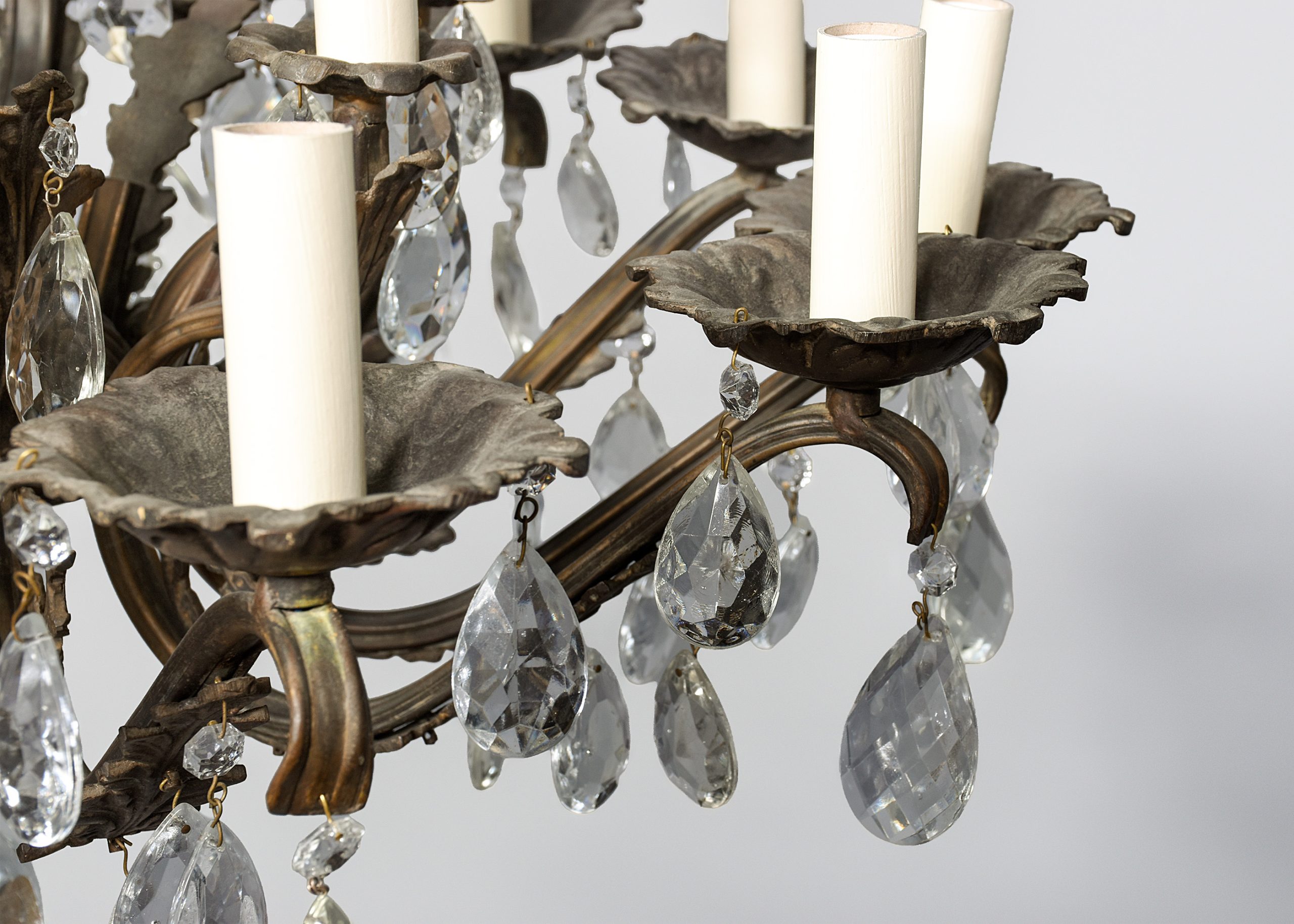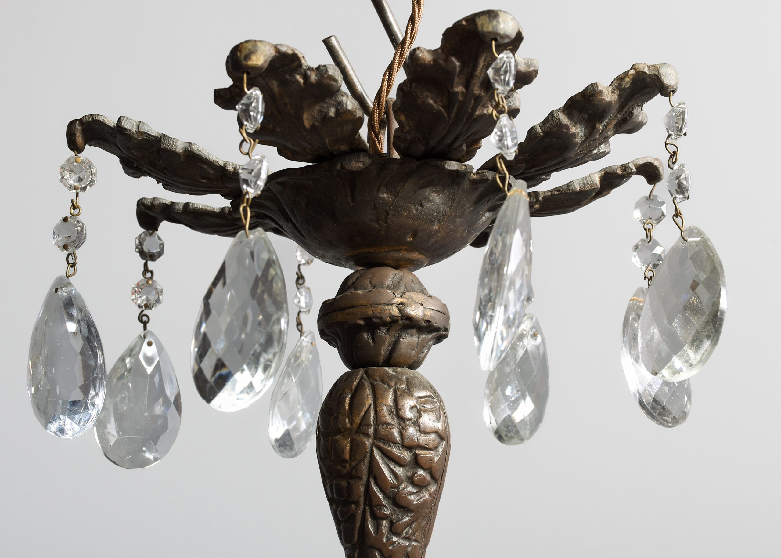 Circa 1920s. A large circular bronze and crystal light fitting, the petal shaped top, with each of the 6 petals with crystals hanging, with a similar tier beneath, the central stem in two sections one issuing 6 small shaped arms surmounted by 6 faux candles with simple drops to the sides, the other with 12 elaborate arms with foliate casting on the inside and on the facing with drops, and elaborate drip trays with faux candles, giving a total of 18 lamp holders. The base of the central stem has a conical-shaped downward-facing section with a large facetted crystal ball beneath.