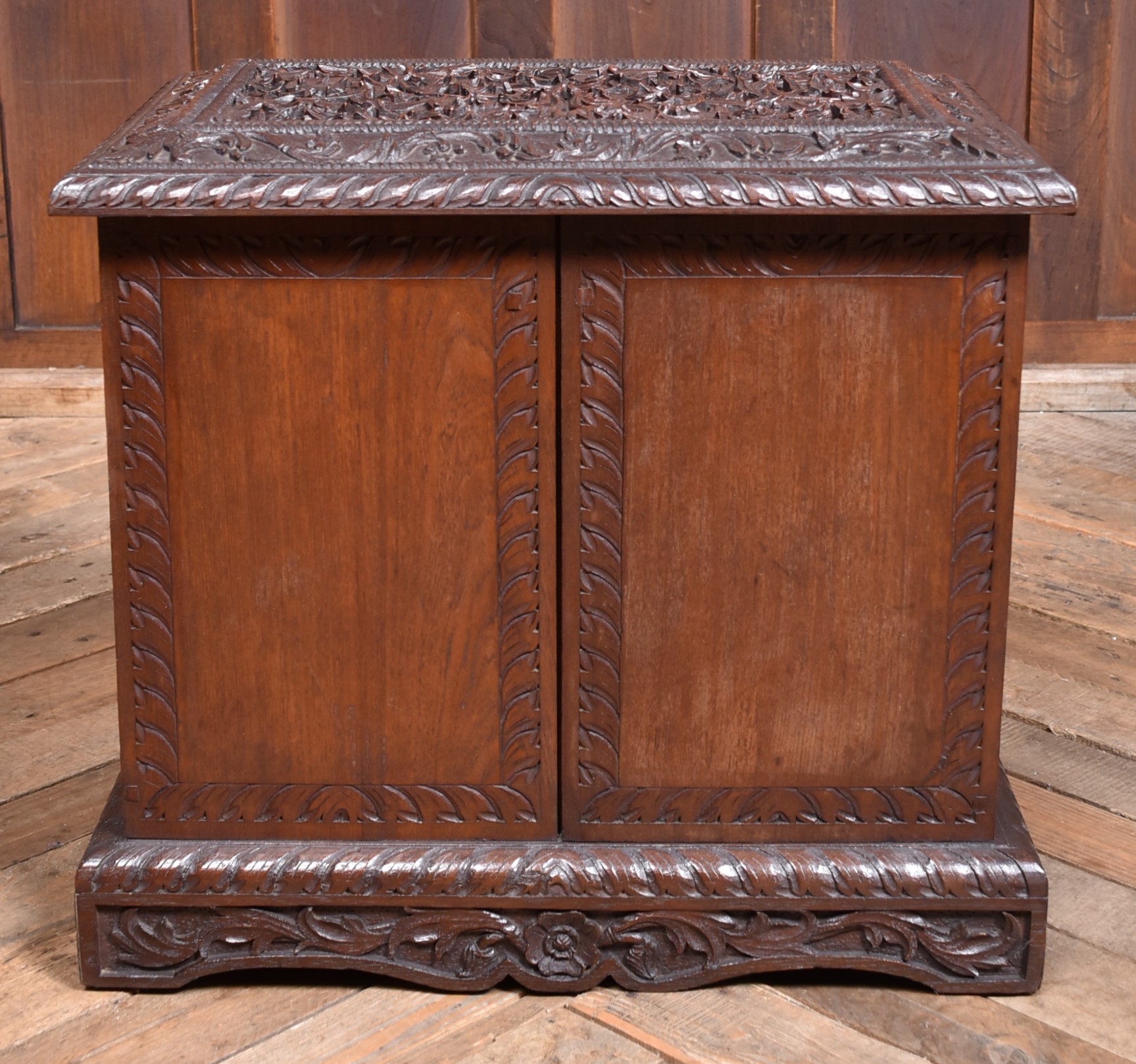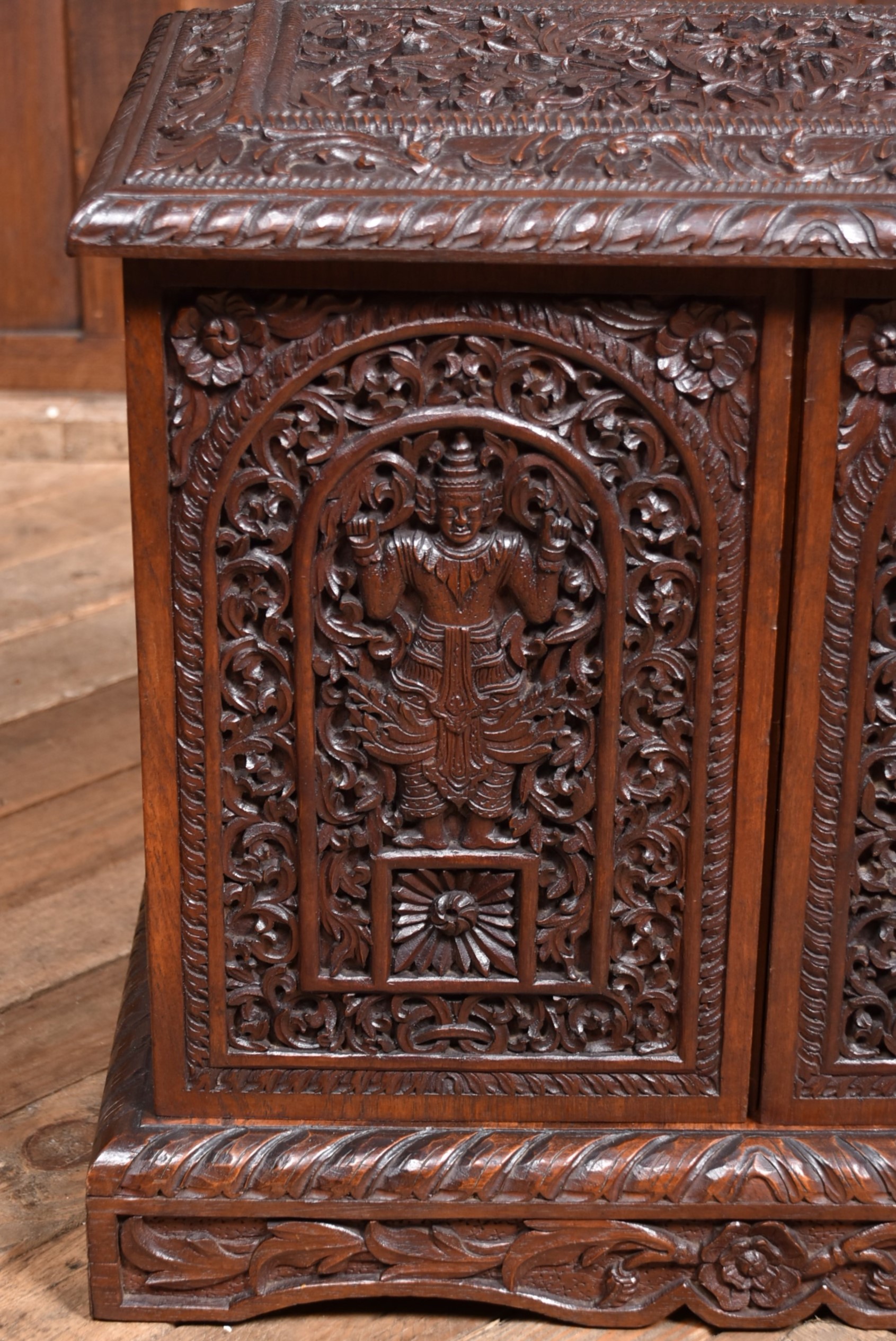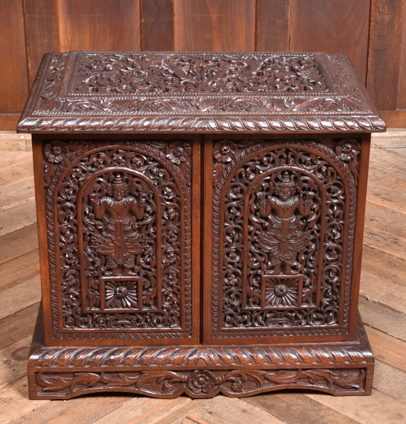 An exceptional Burmese specimen chest, crafted from teak and richly adorned with intricate carvings, presented in excellent antique condition. The top is carvings are dominated by swirling vines and leaves, meticulously arranged to create a visually striking pattern. This lifts to reveal a compartmentalized storage section. The cupboard doors, embellished with religious figures within arched frames, open to reveal six short graduating drawers and two long drawers—perfect for storing trinkets or jewellery. The sides and base continue the theme of exquisite carvings, with additional depictions of deities at the centre of the panels, adding to the overall grandeur of the piece. As with all antiques, this piece bears some imperfections, yet its rich colouring and patina enhance its overall charm and appeal.