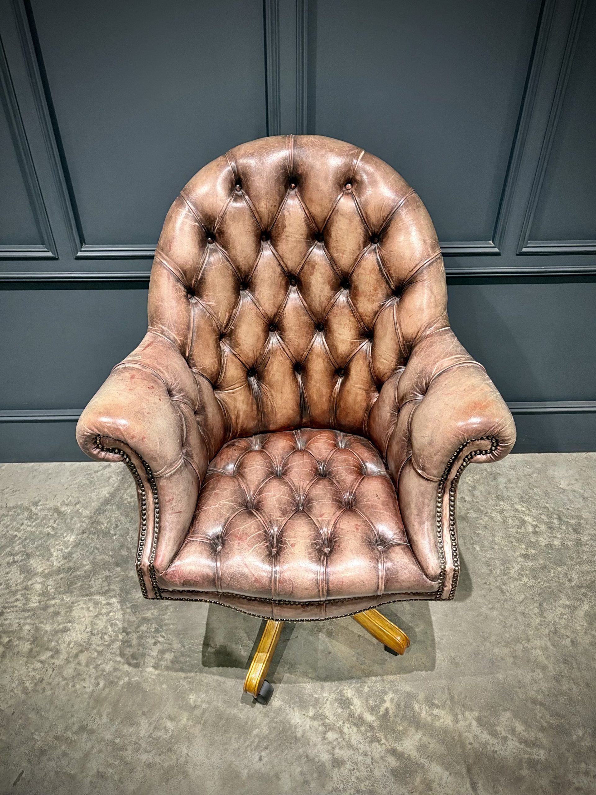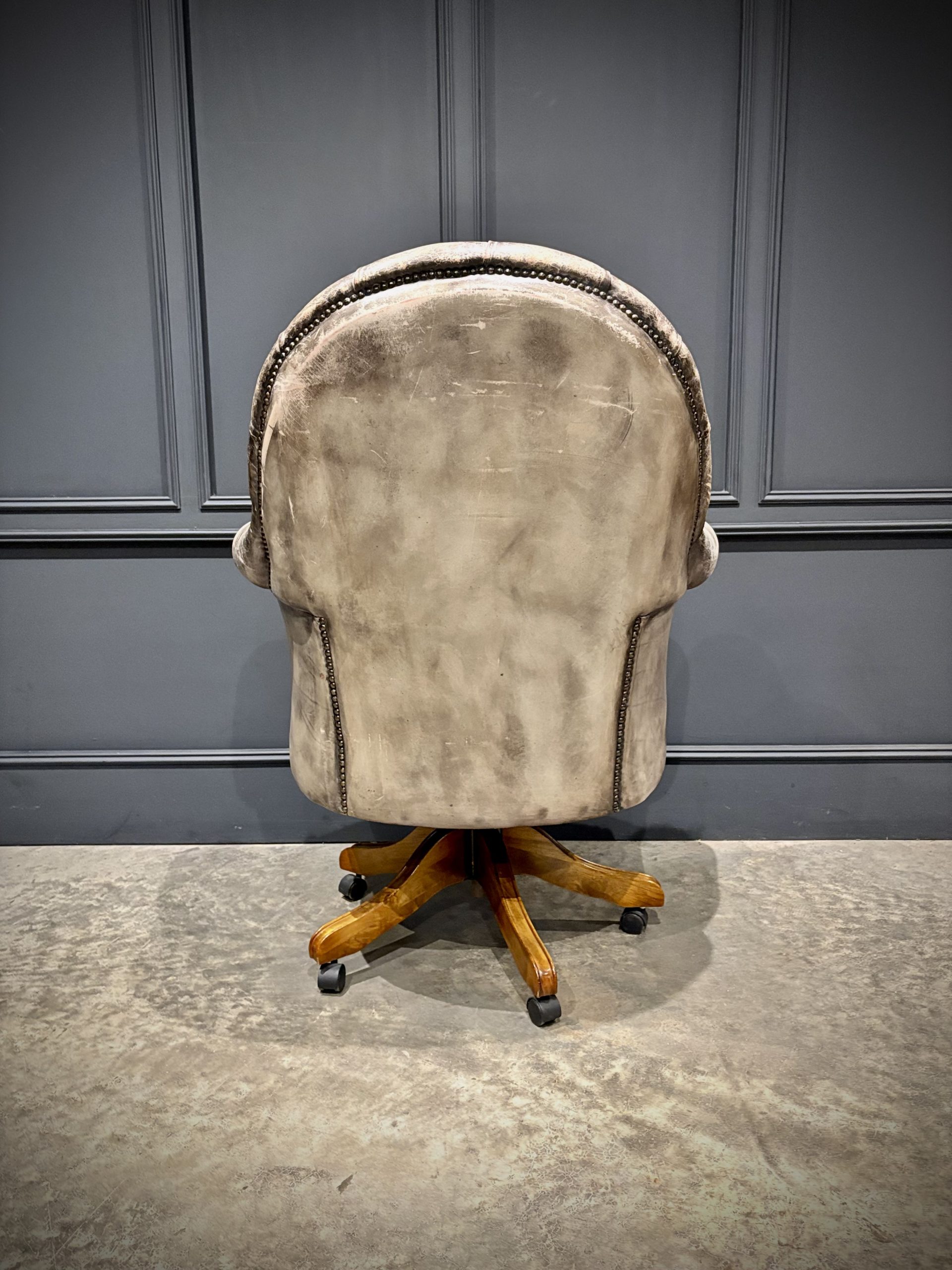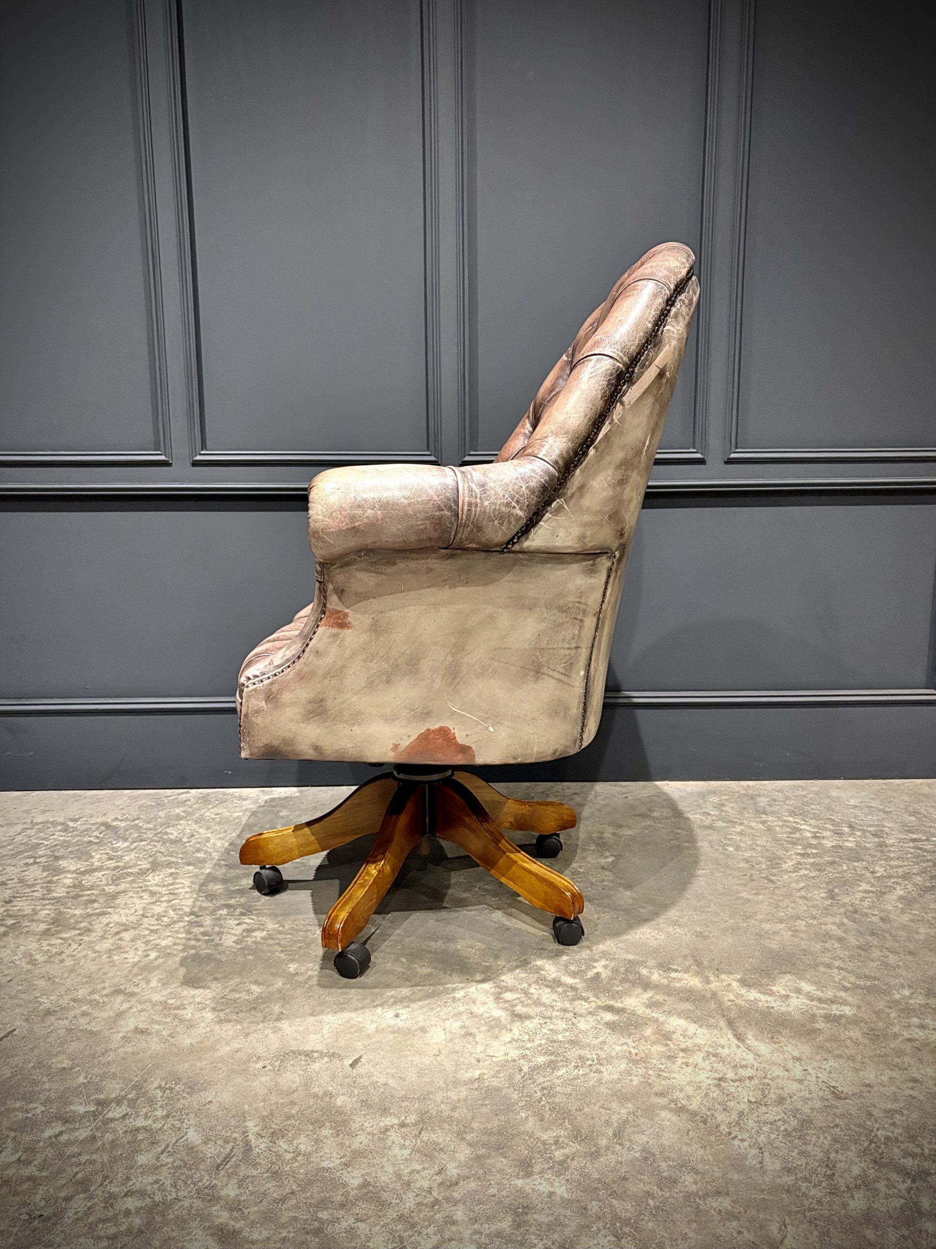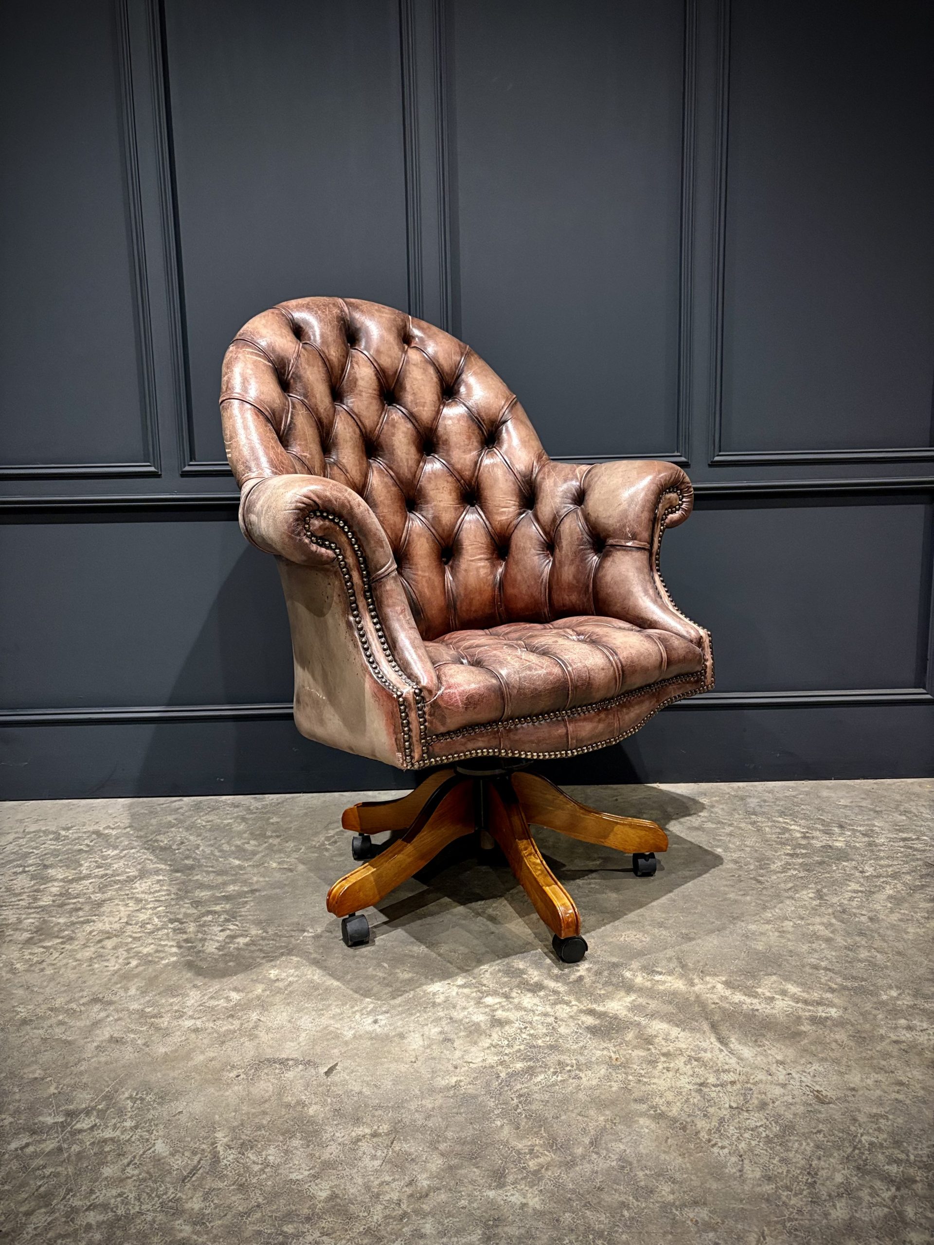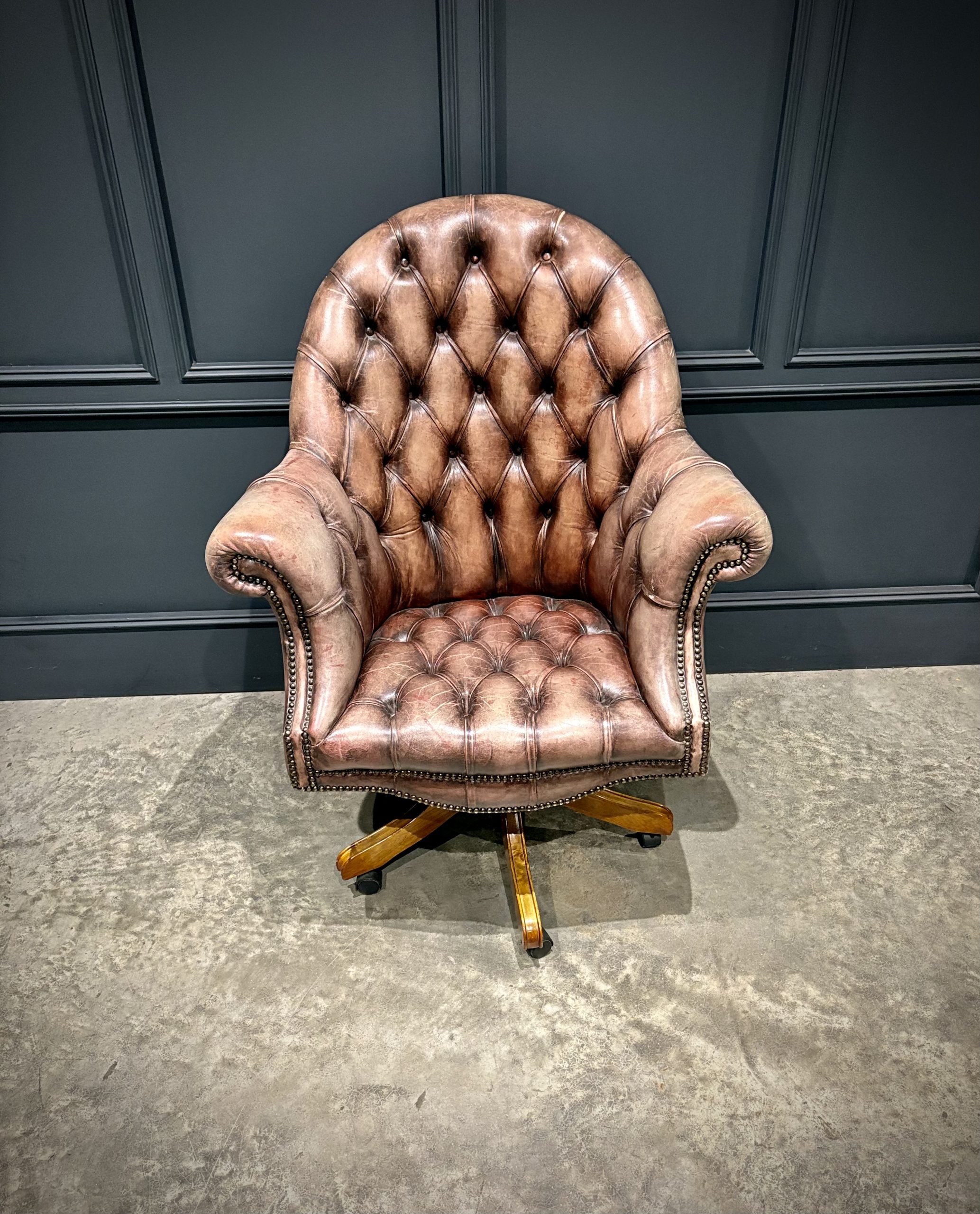 A superb leather swivel desk chair in the classic Chesterfield style, offering both comfort and timeless appeal.