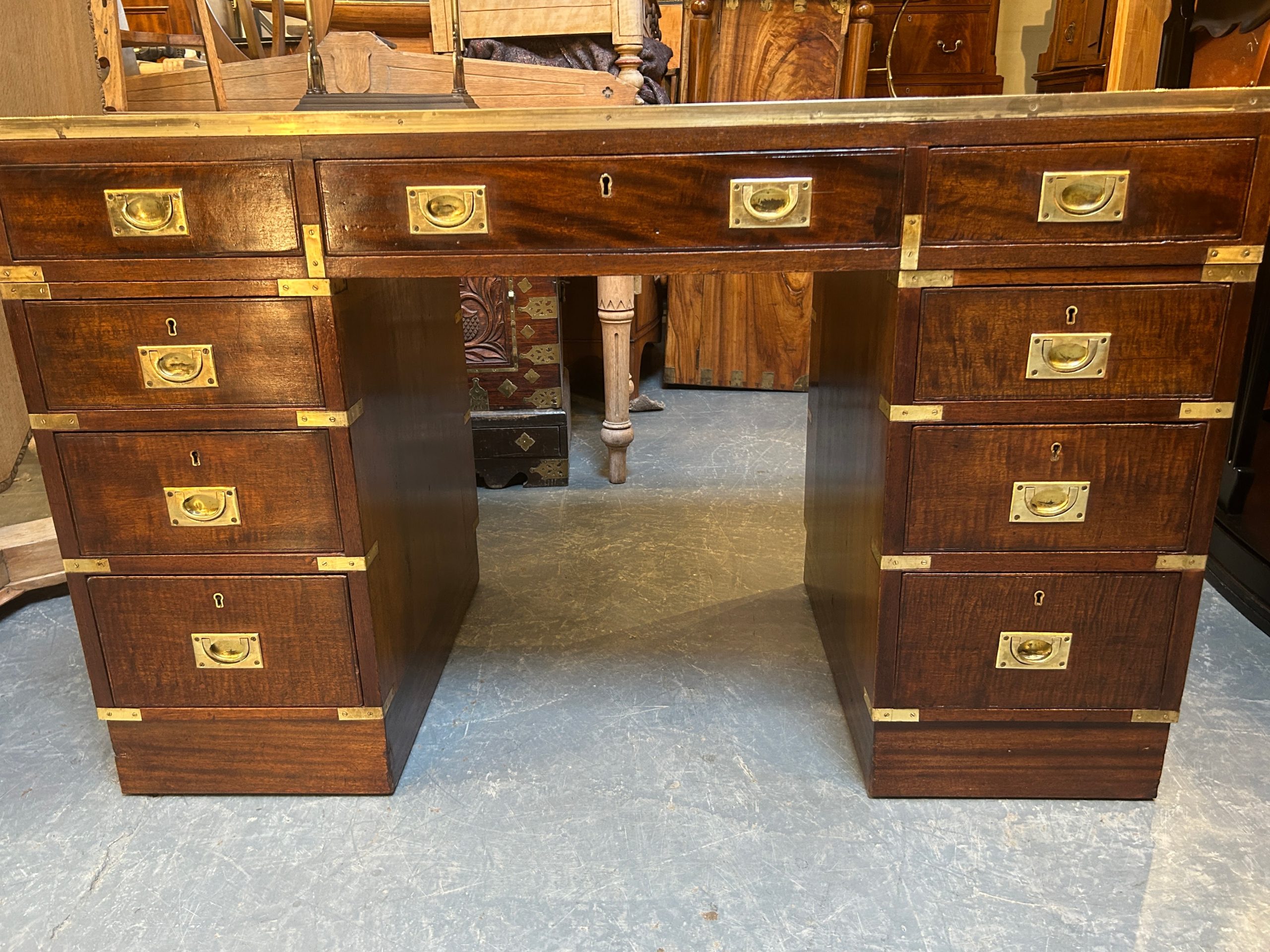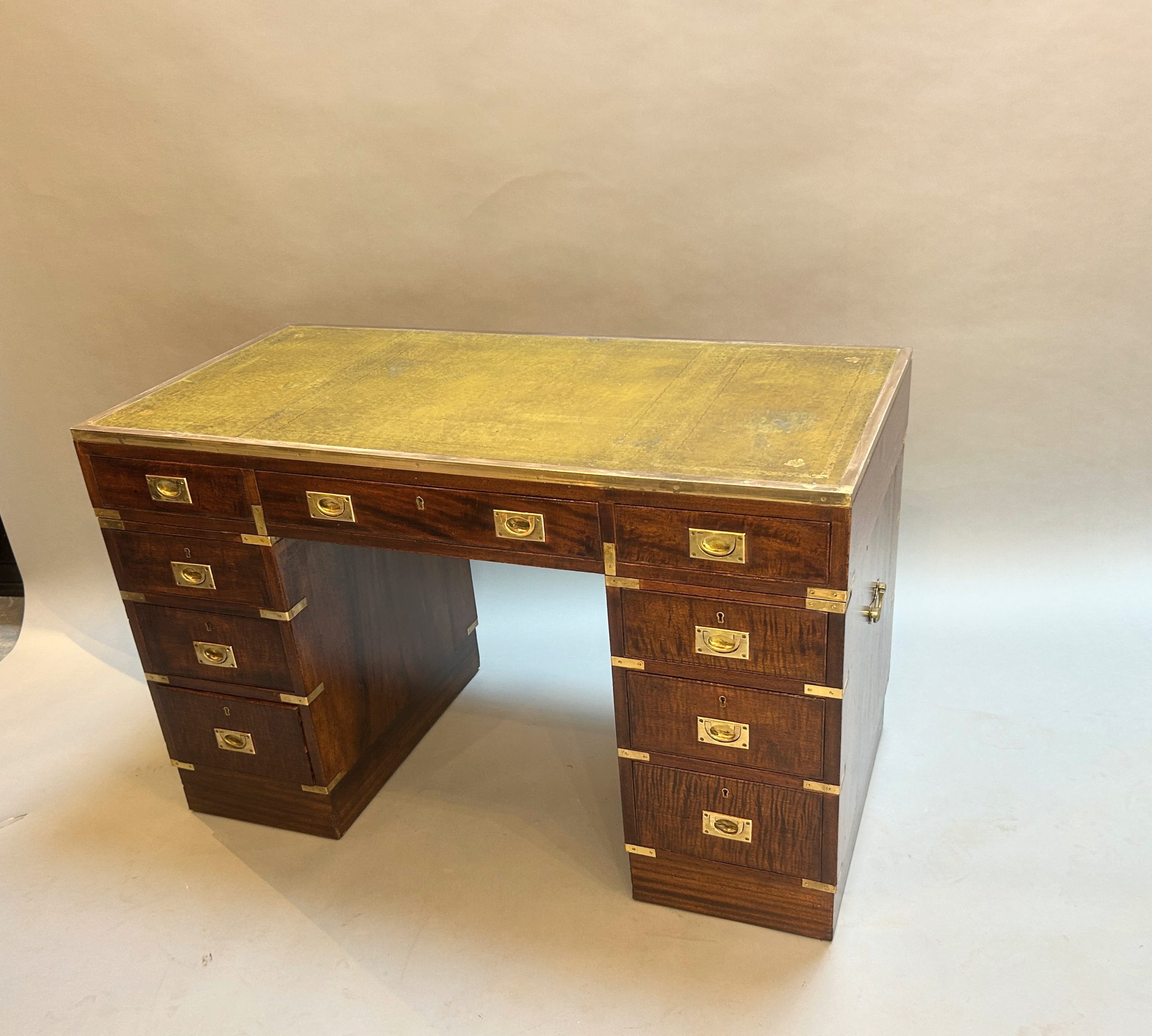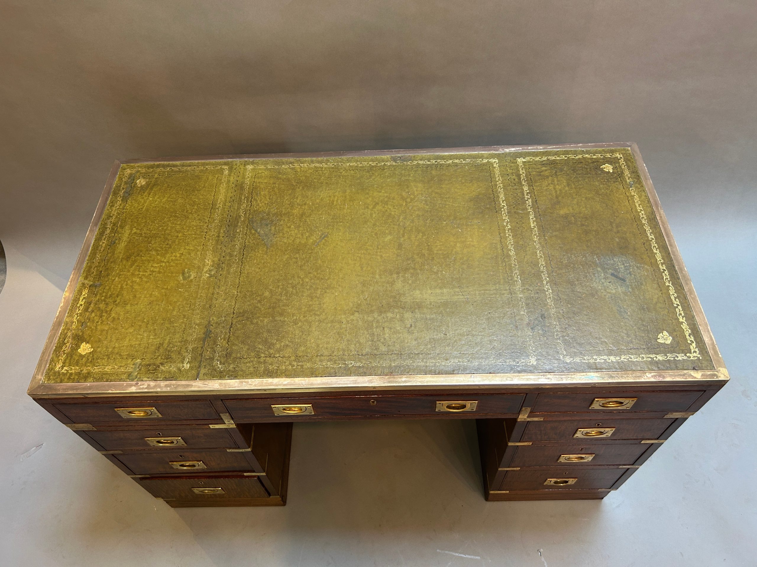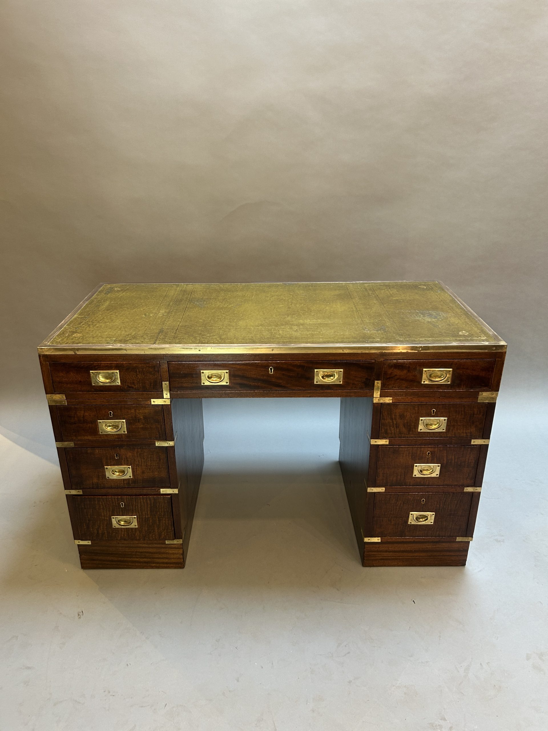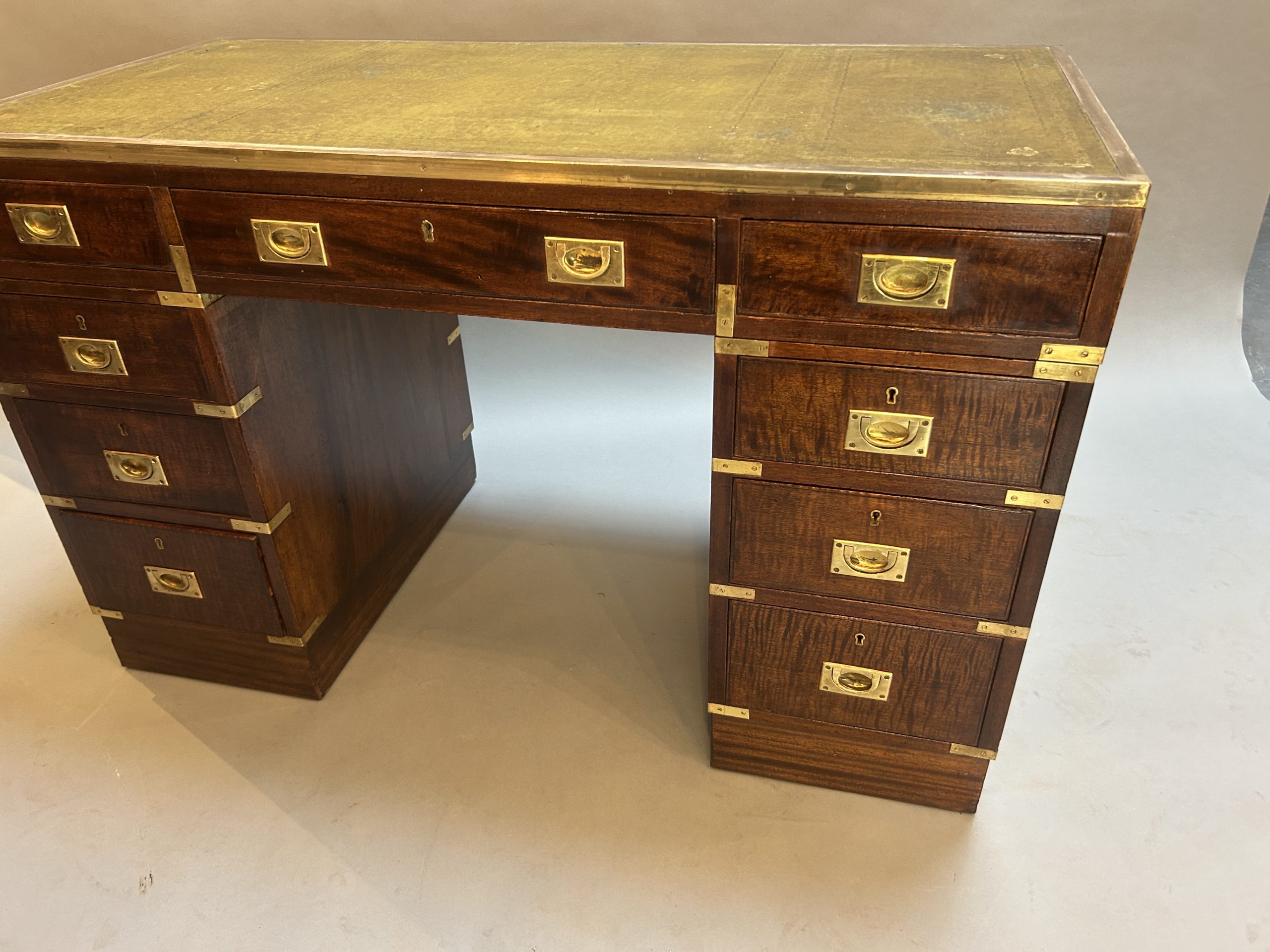 C19th campaign/military style brass bound mahogany, the gilt tooled leather top with brass border over 3 frieze drawers raised on pedestals of 3 graduated drawers raised on plinth bases, (later) sunken brass handles throughout.