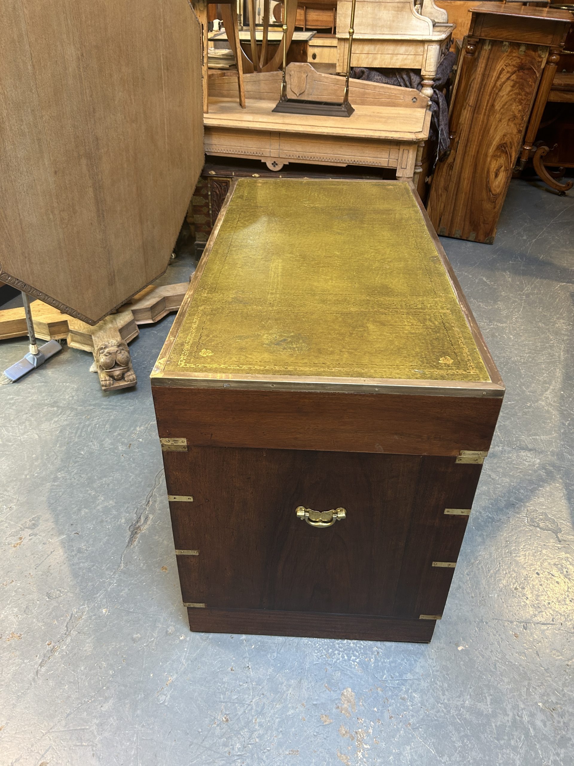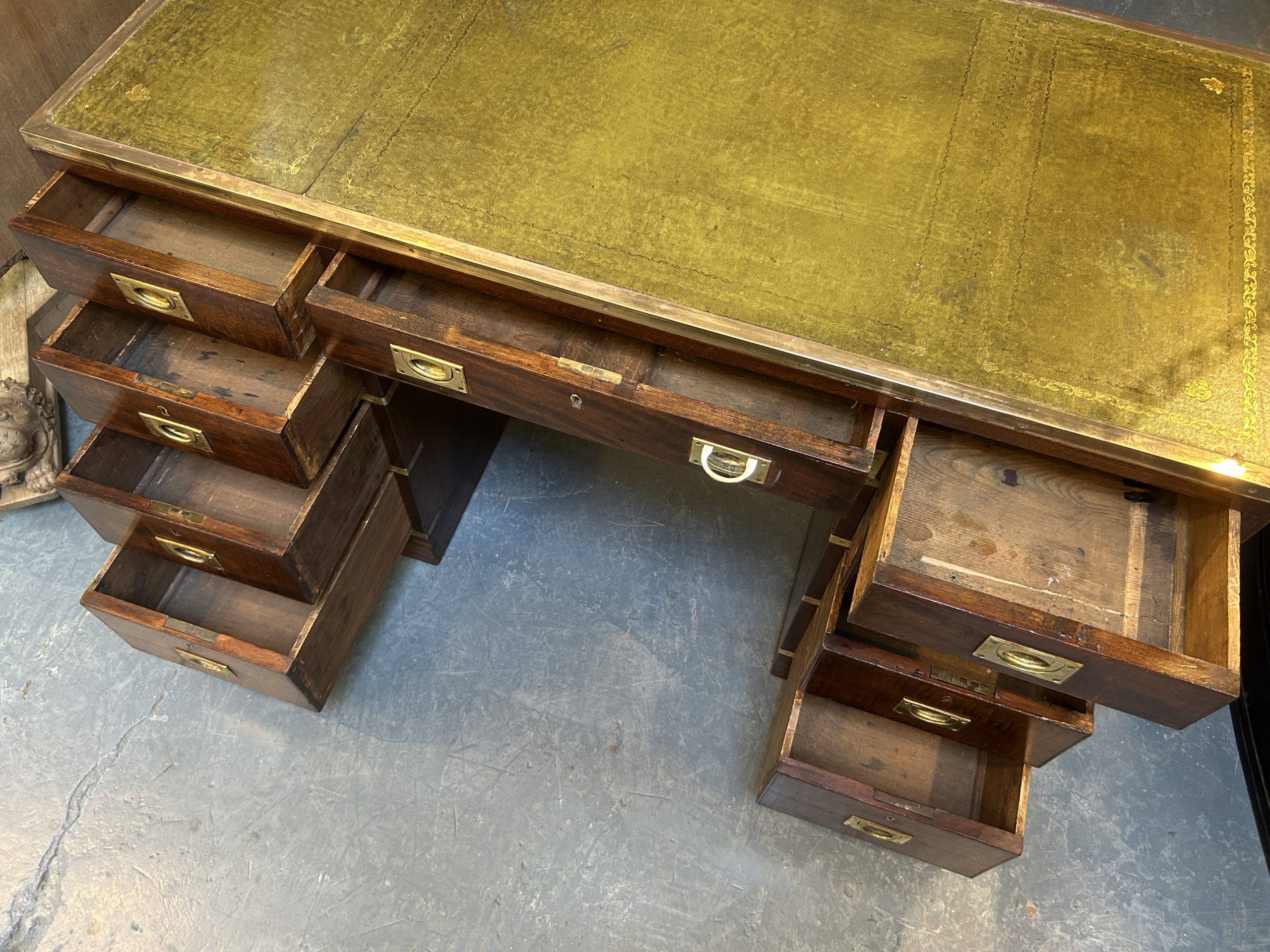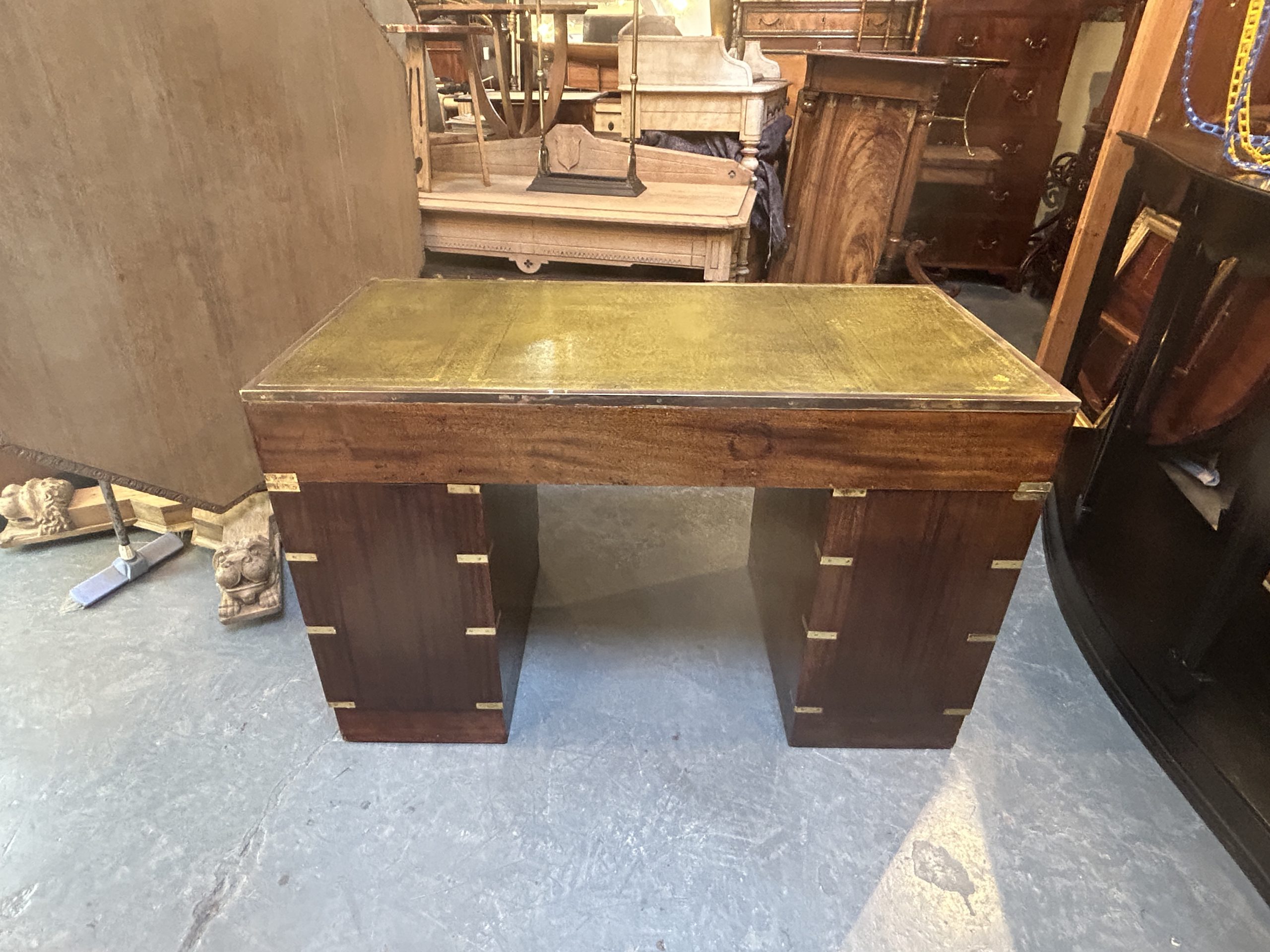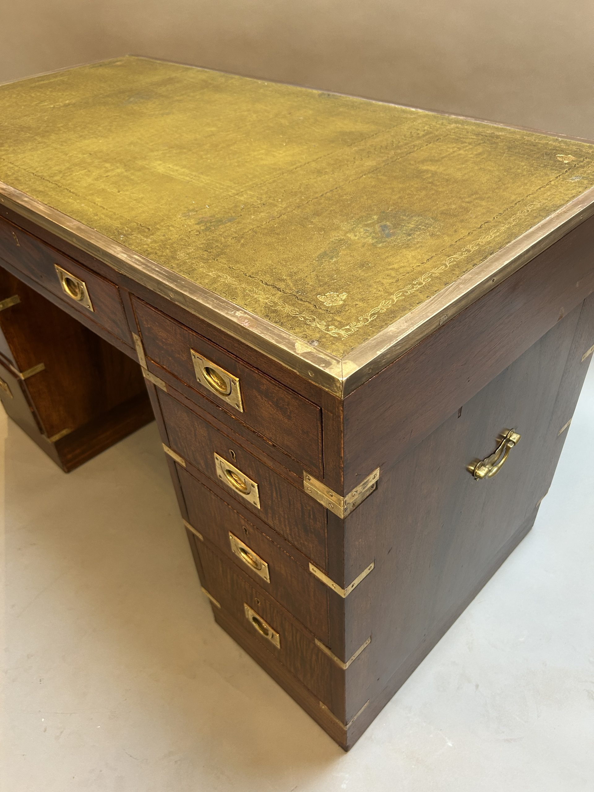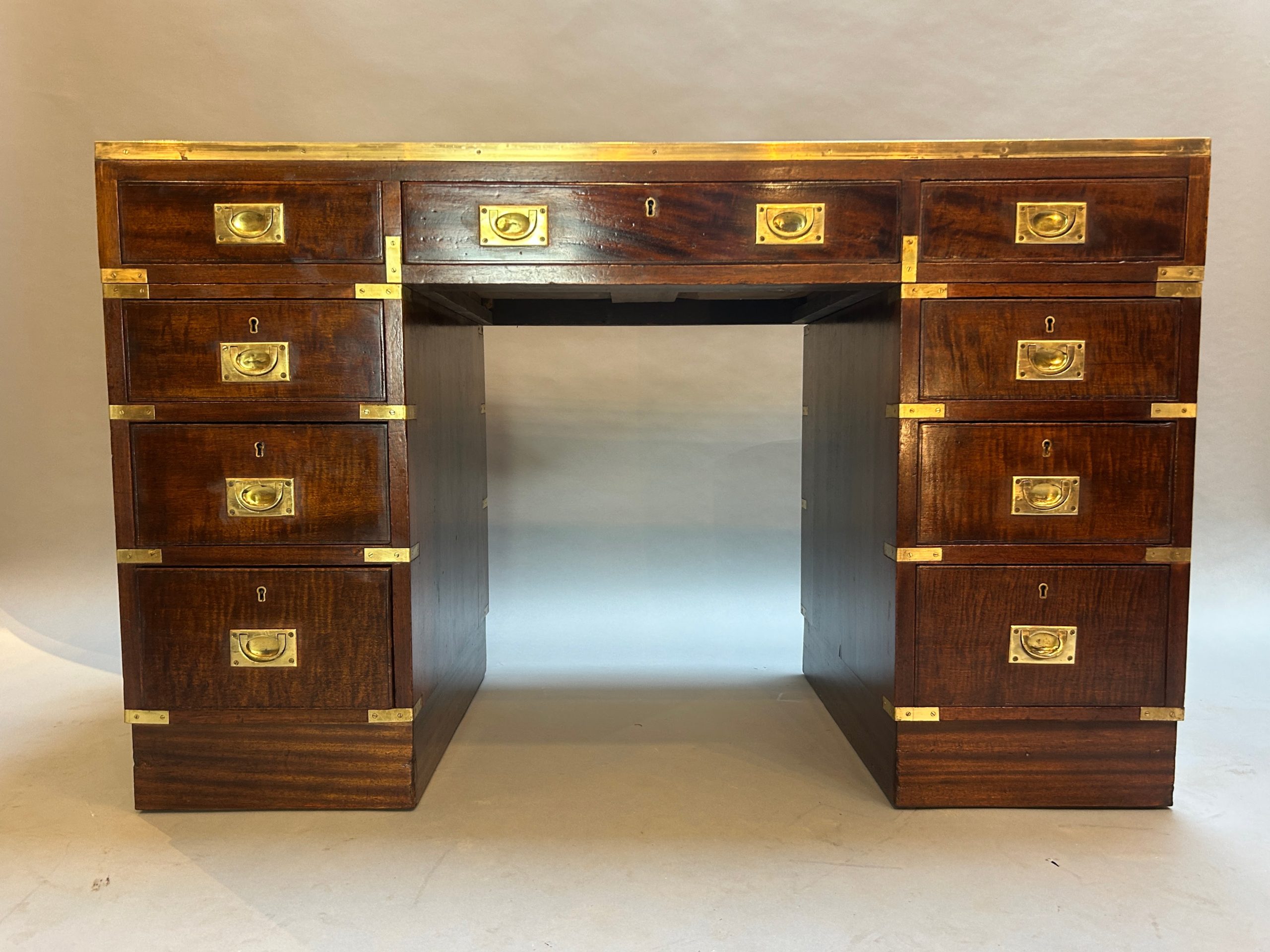 C19th campaign/military style brass bound mahogany, the gilt tooled leather top with brass border over 3 frieze drawers raised on pedestals of 3 graduated drawers raised on plinth bases, (later) sunken brass handles throughout.