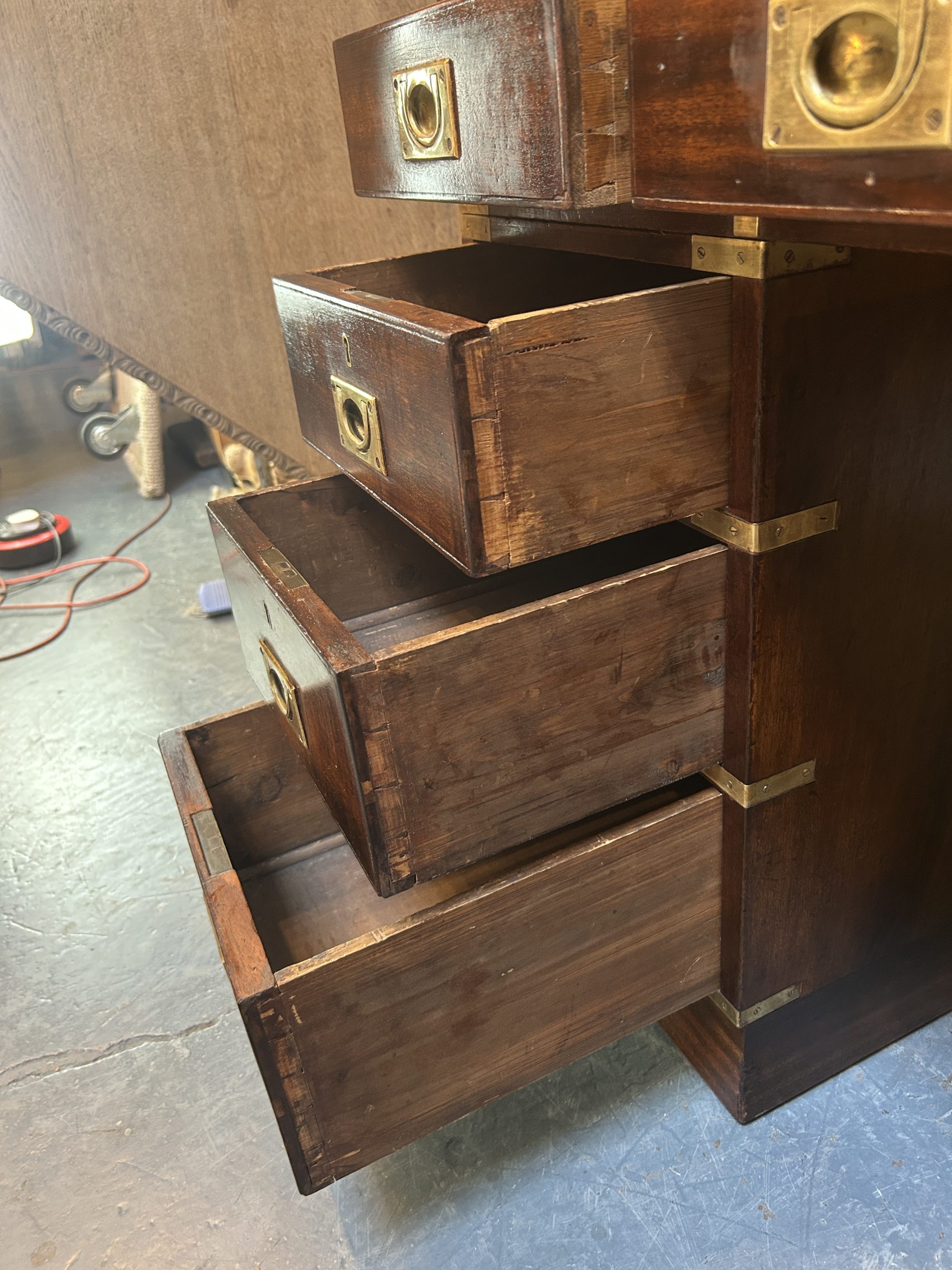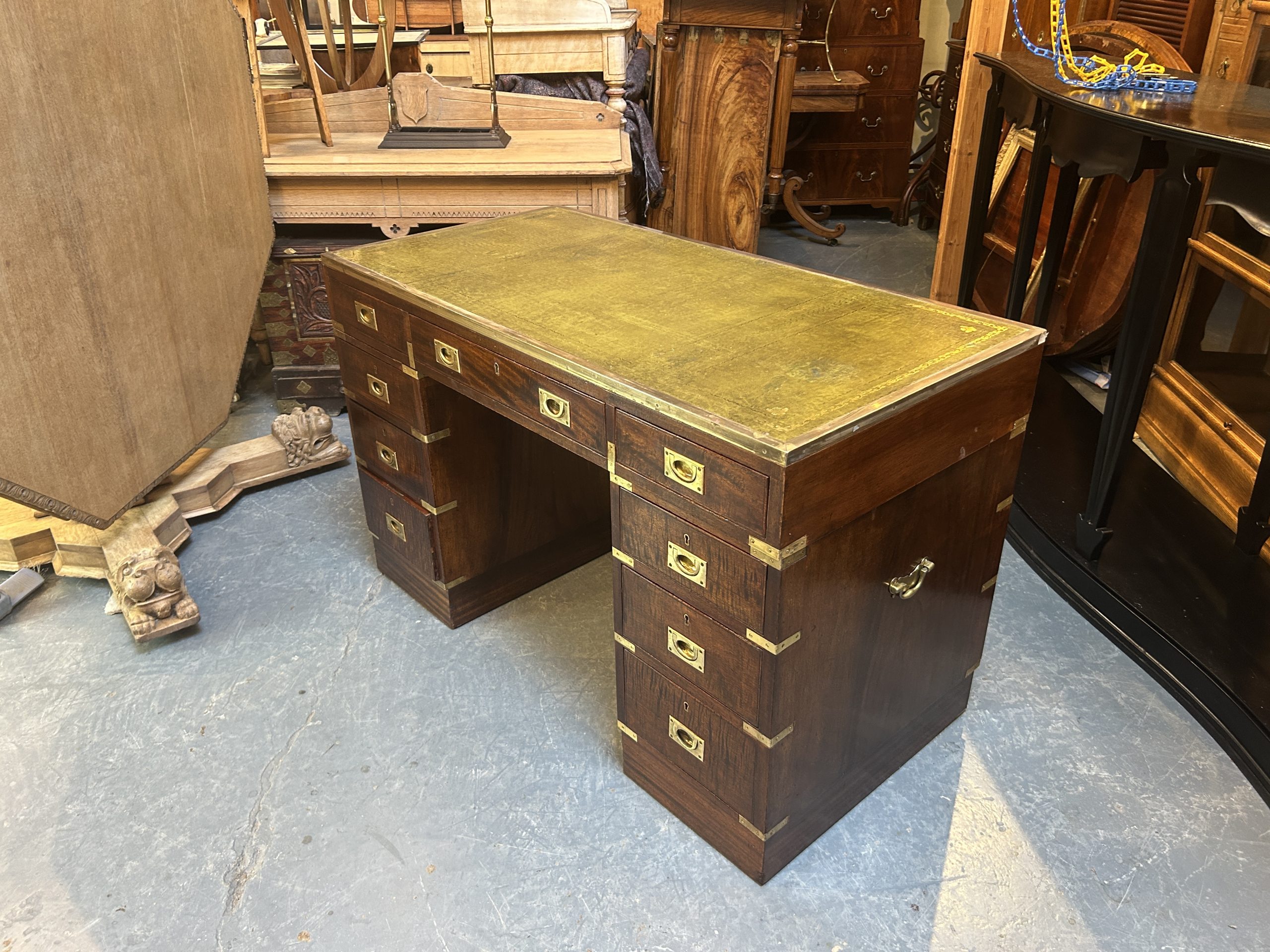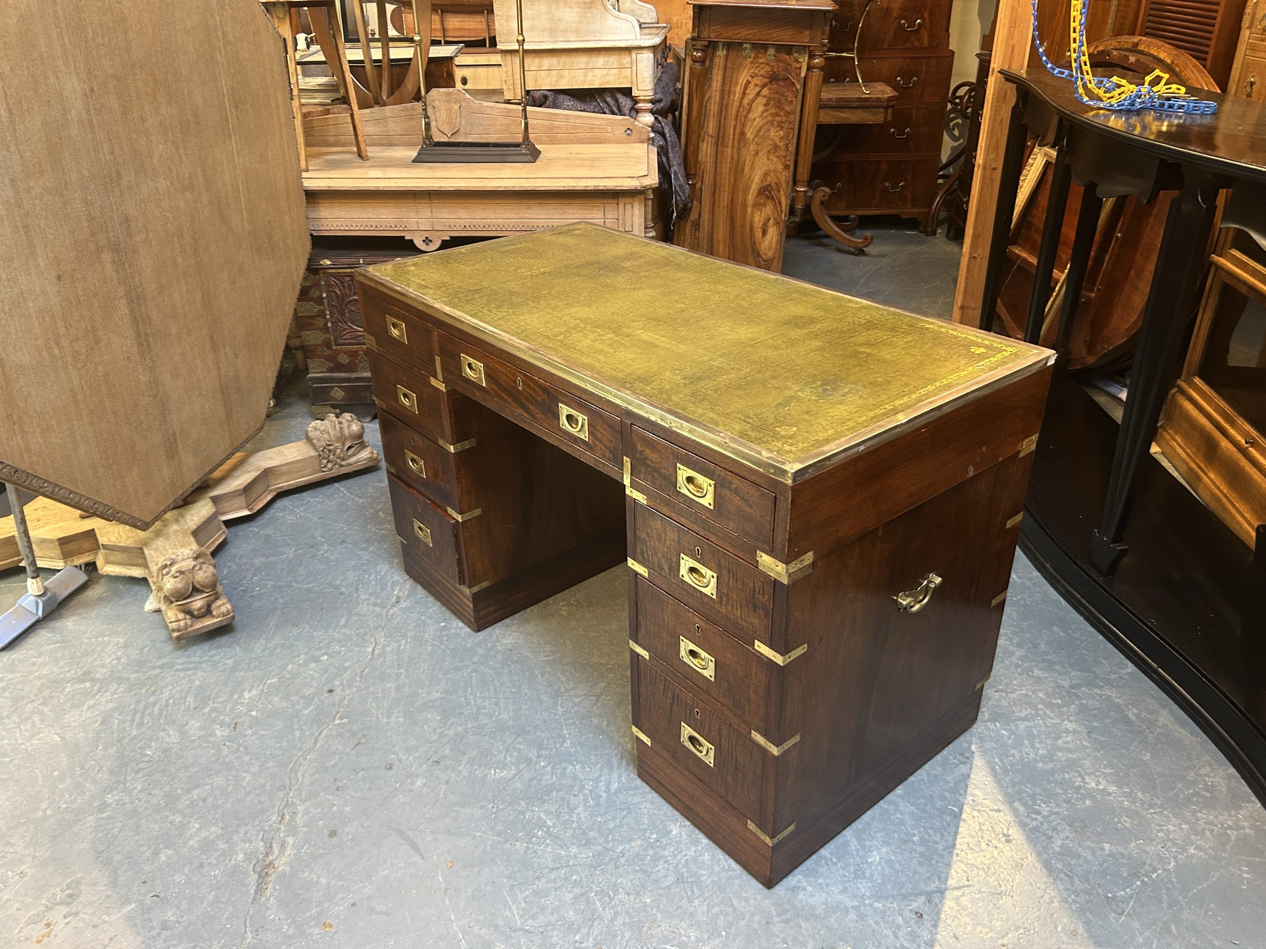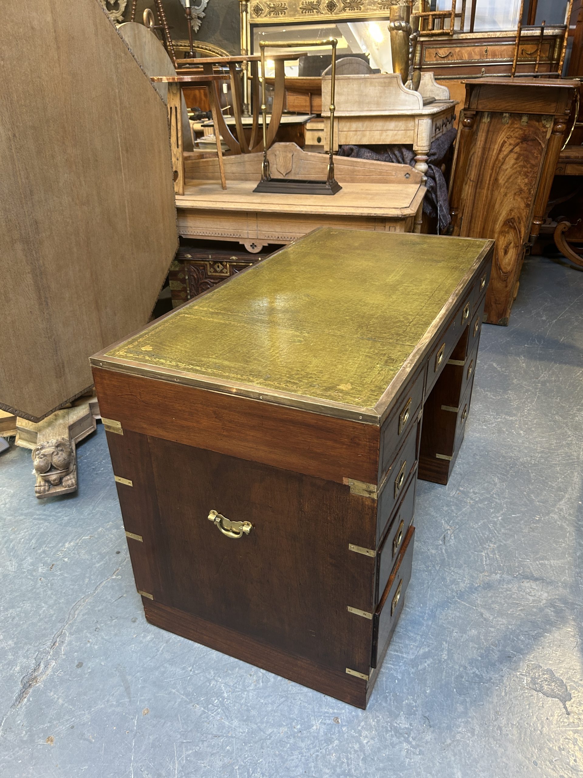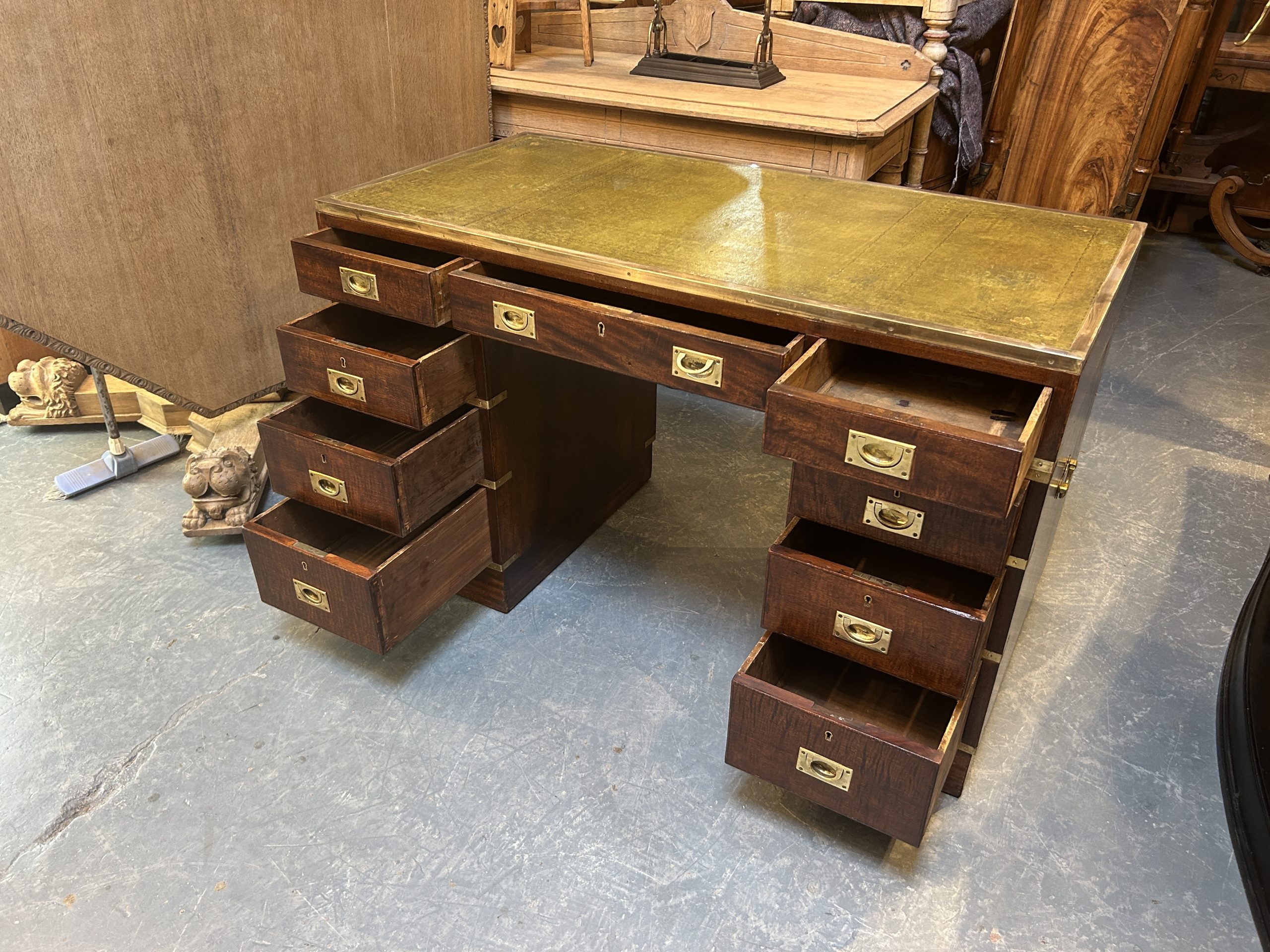 C19th campaign/military style brass bound mahogany, the gilt tooled leather top with brass border over 3 frieze drawers raised on pedestals of 3 graduated drawers raised on plinth bases, (later) sunken brass handles throughout.