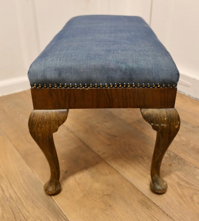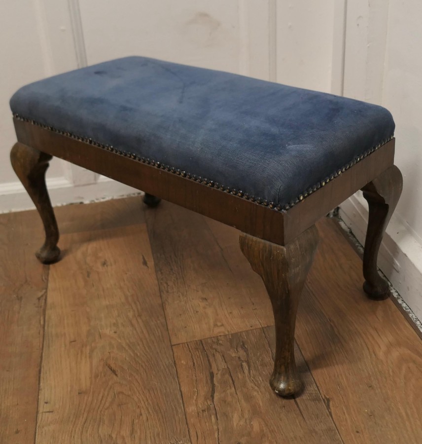 Cabriole Leg Velvet Window Stool This is a good Sturdy Stool it has strong cabriole legs The stool is newly upholstered in dusty blue needle cord, studded around the edges This sturdy Stool would work well in almost any room as either a stool or as window seat, it is in good sound condition The Stool is 15” high and 25” x 13” VY163 Manufacture Date : 1920 Materials : Walnut
