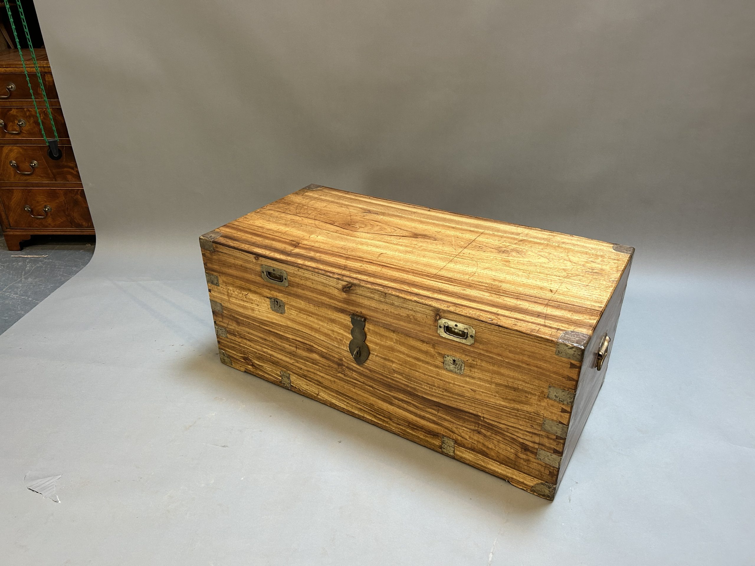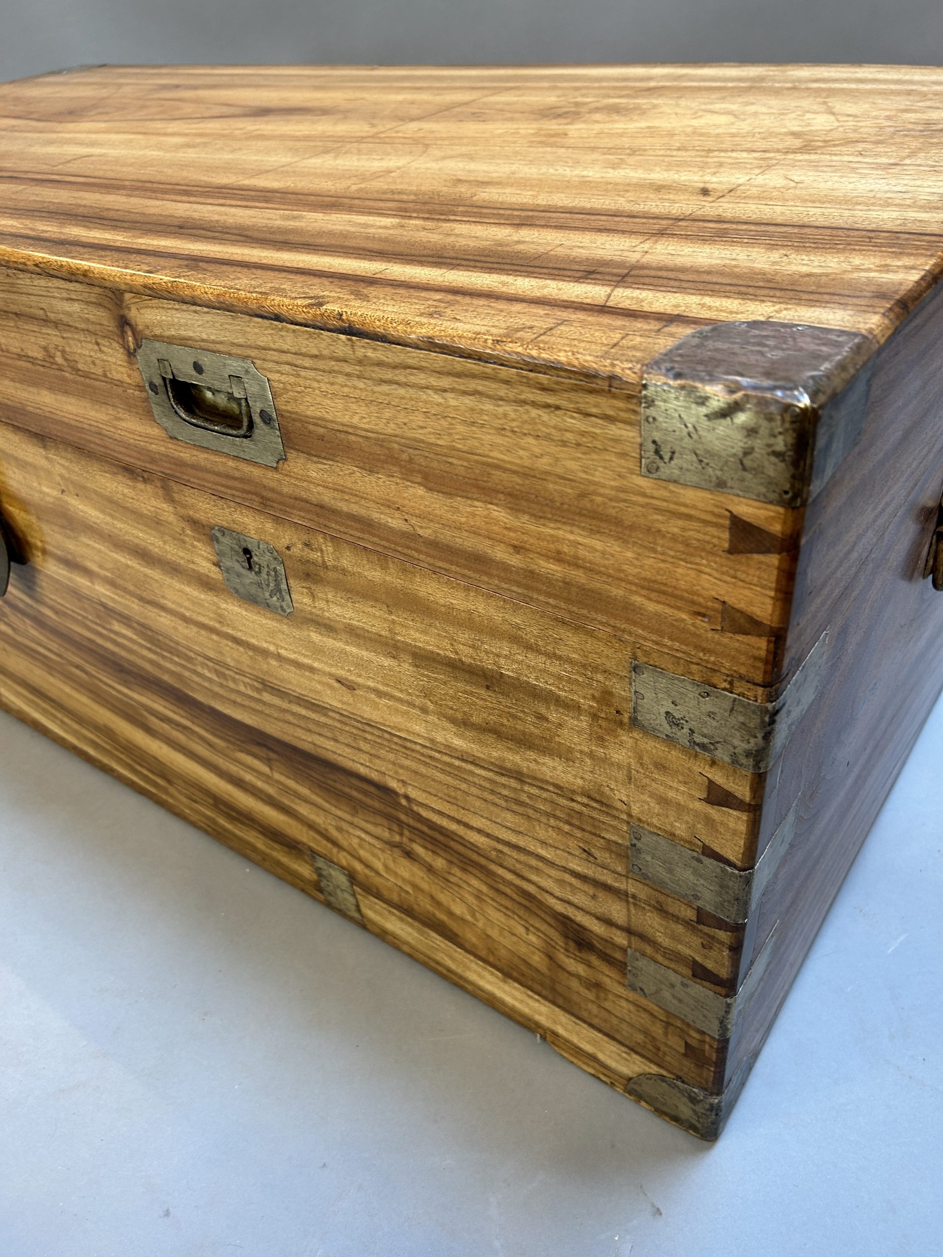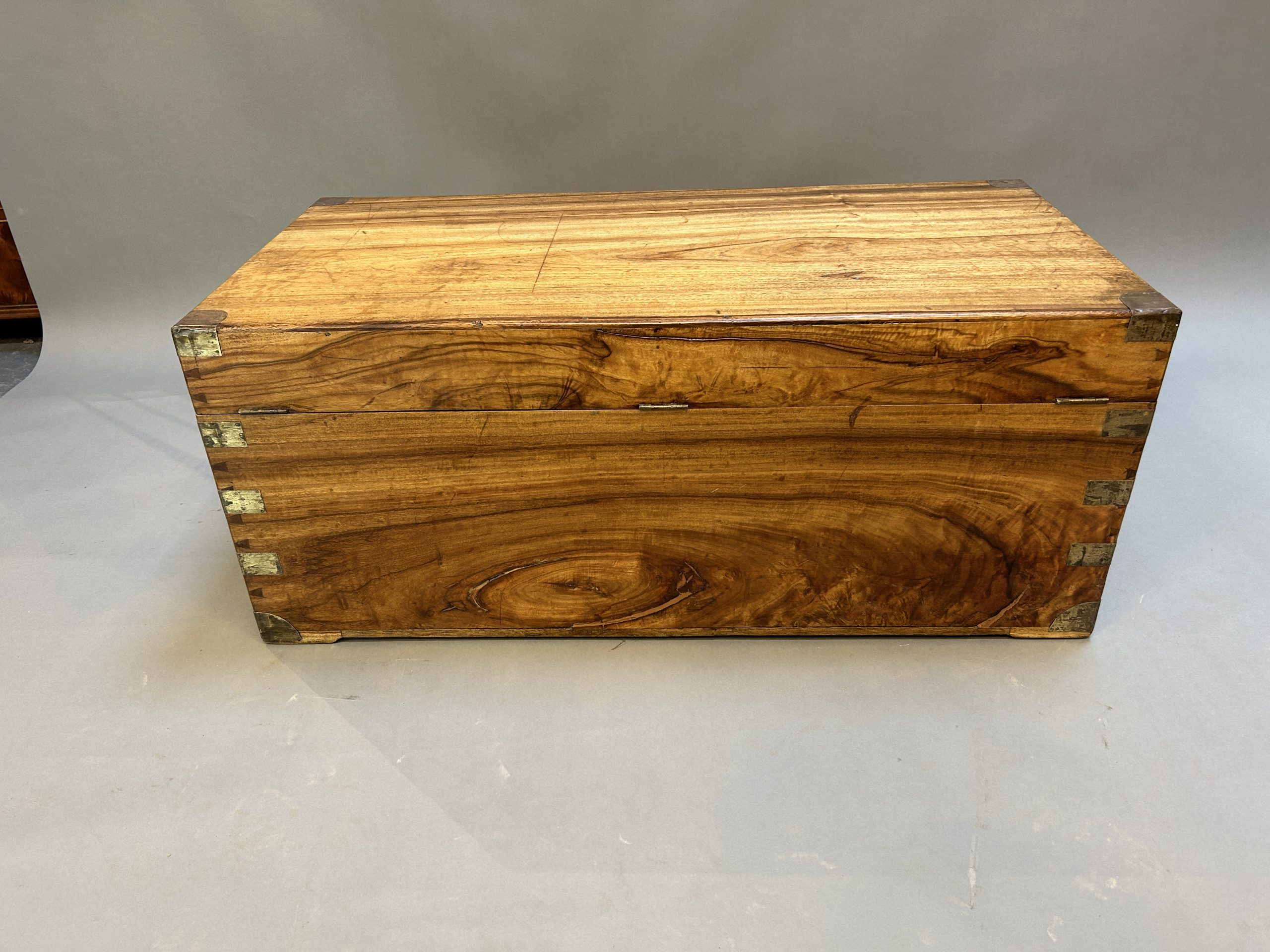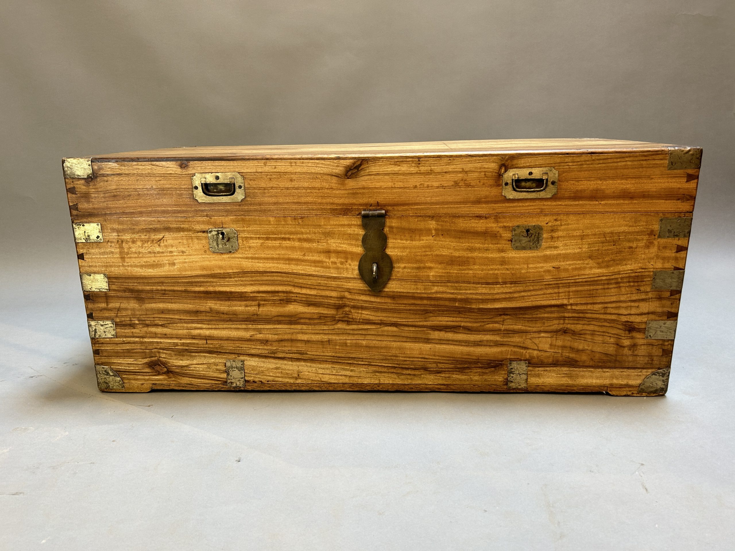 C19th pale well figured camphor of dovetailed construction, brass bindings throughout, rising lid with claps and carrying handle either side.