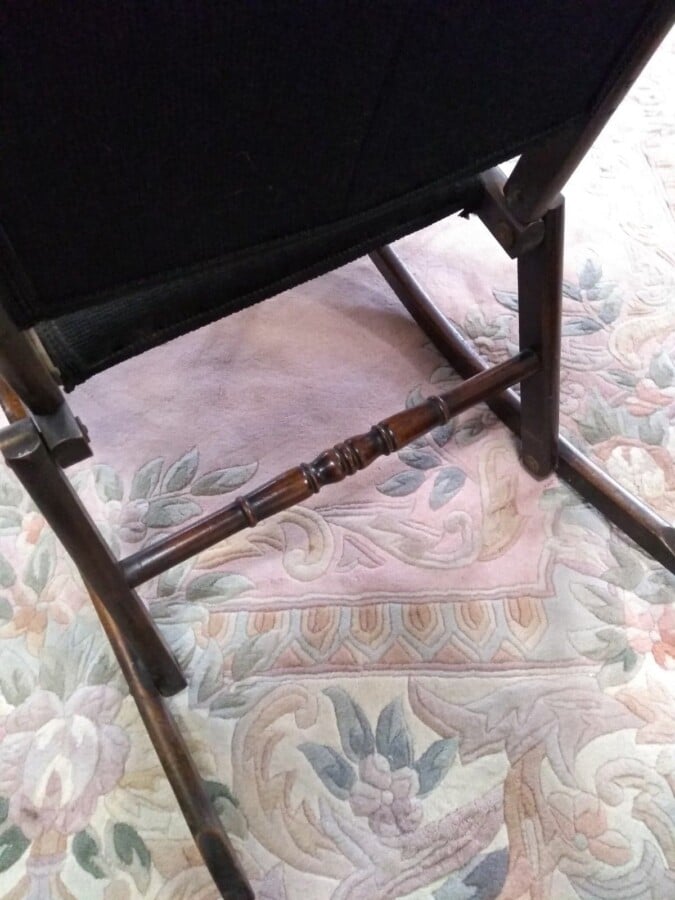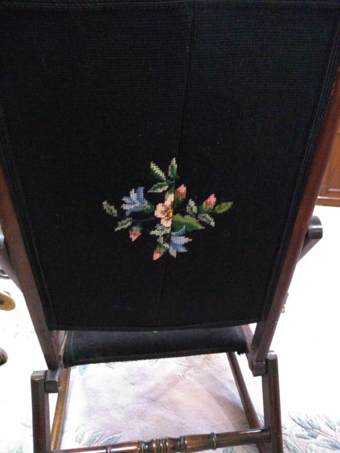 Offered for sale is this Victorian antique campaign folding rocking chair with a mainly black tapestry back and seat, depicting various colourful flowers.
