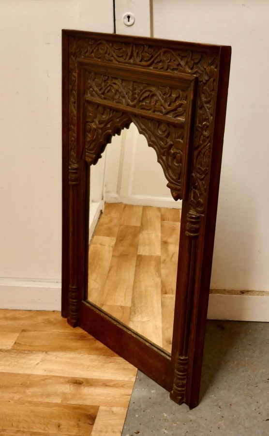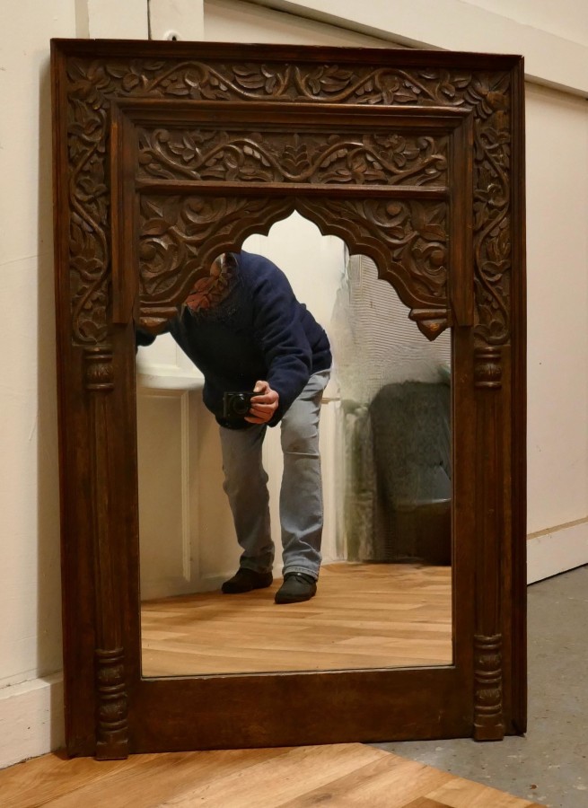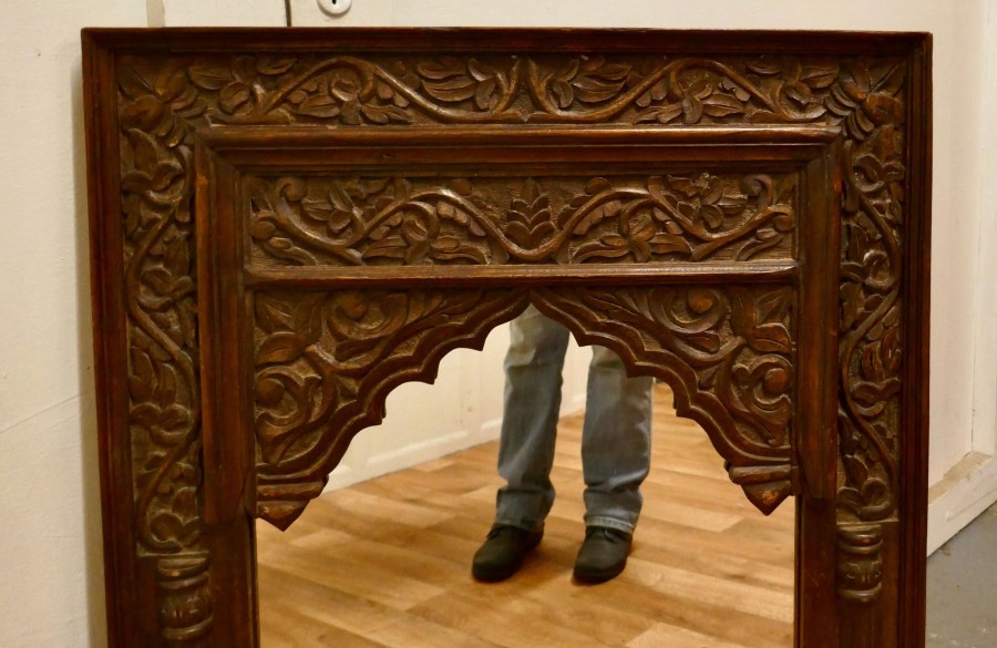 Carved Indian teak mirror A lovely piece from the east, the wide frame is carved with leaves and fruits, the looking glass is new A lovely piece with an Islamic look The Mirror is 36” high and 24” wide TAC139. Manufacture Date : 1900 Materials : Teak