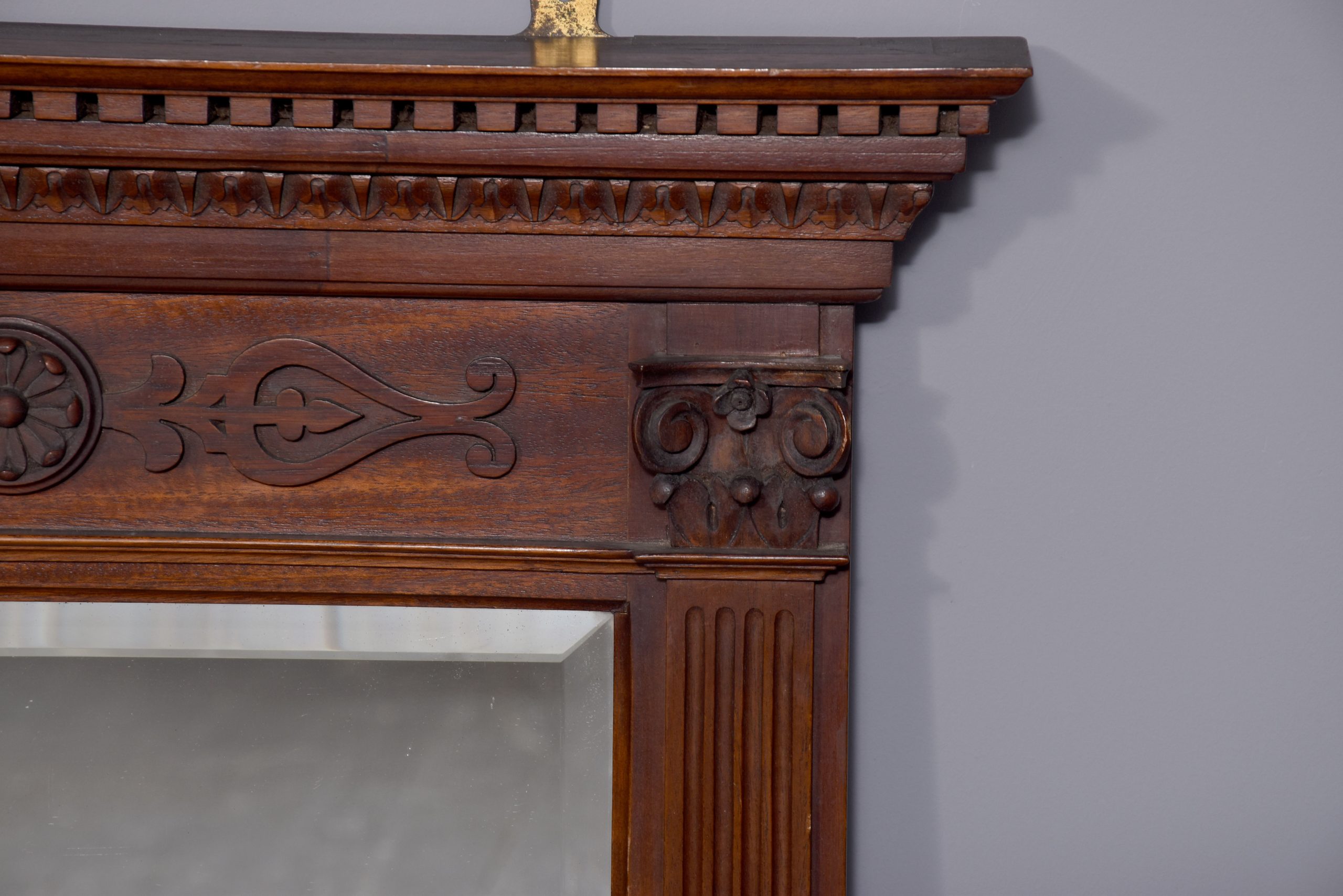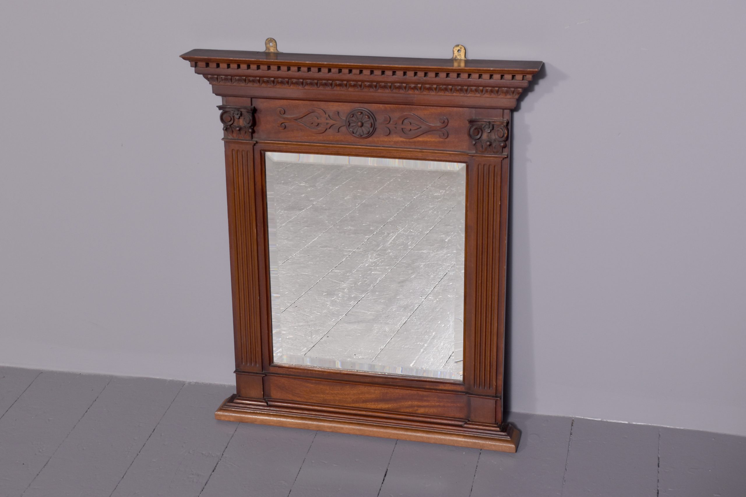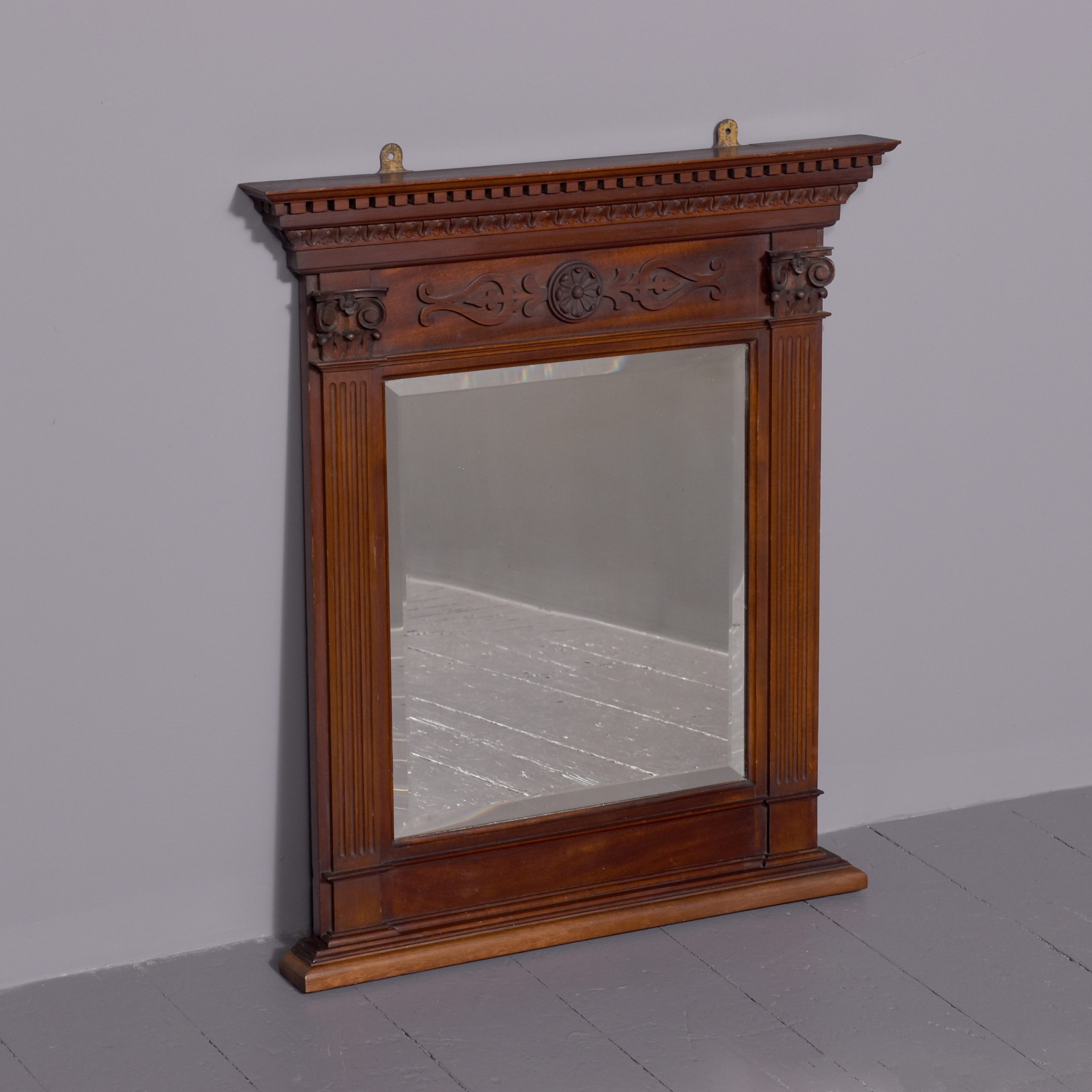 Circa 1890. A carved mahogany framed mirror, the stylish cornice with dentil carving beneath, the frieze with a carved flower head flanked by fretwork, the bevel edge mirror contained in a mahogany frame, with a pair of ribbed pilasters each side headed by stylish capitals, the base with a plain panel with mouldings.
