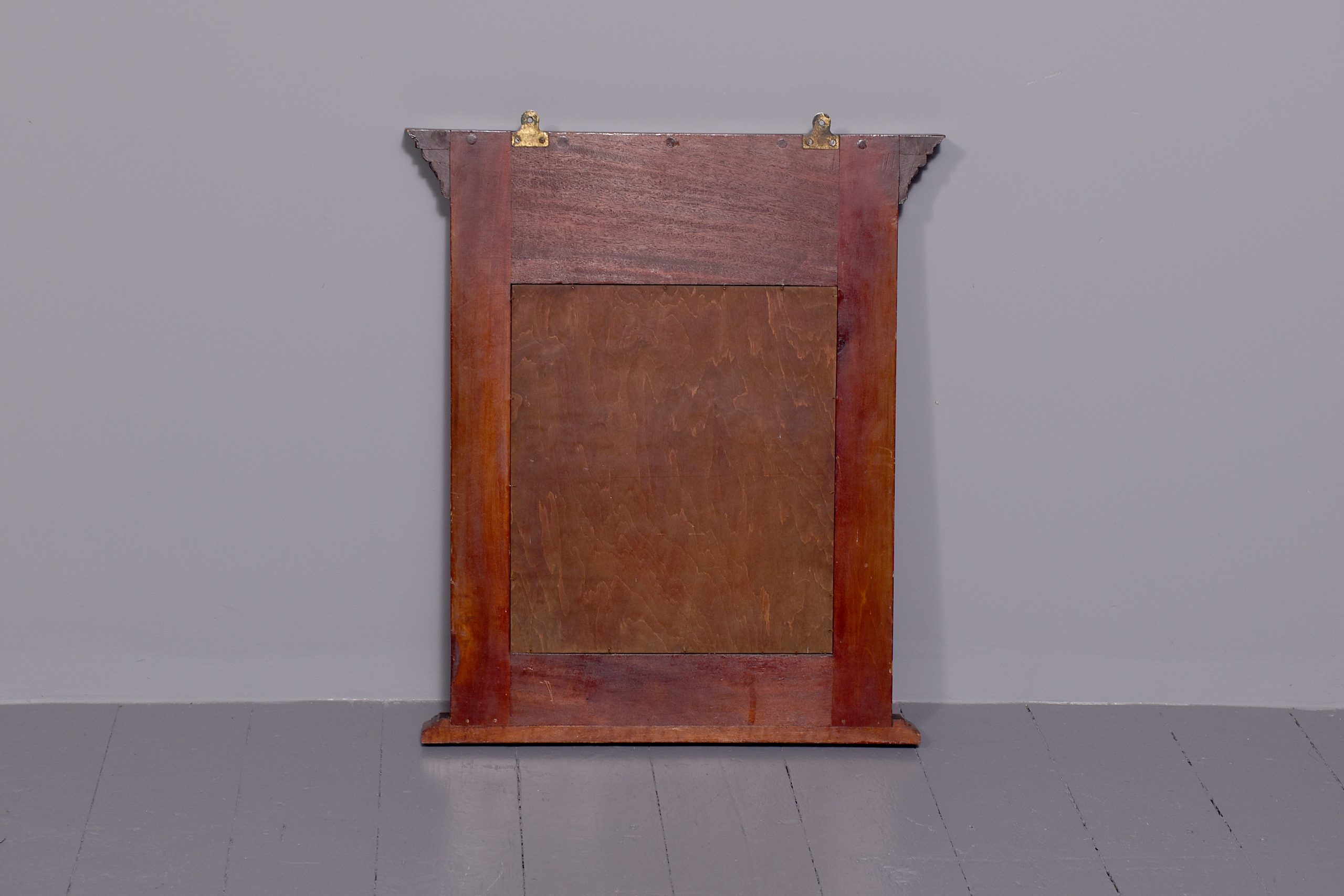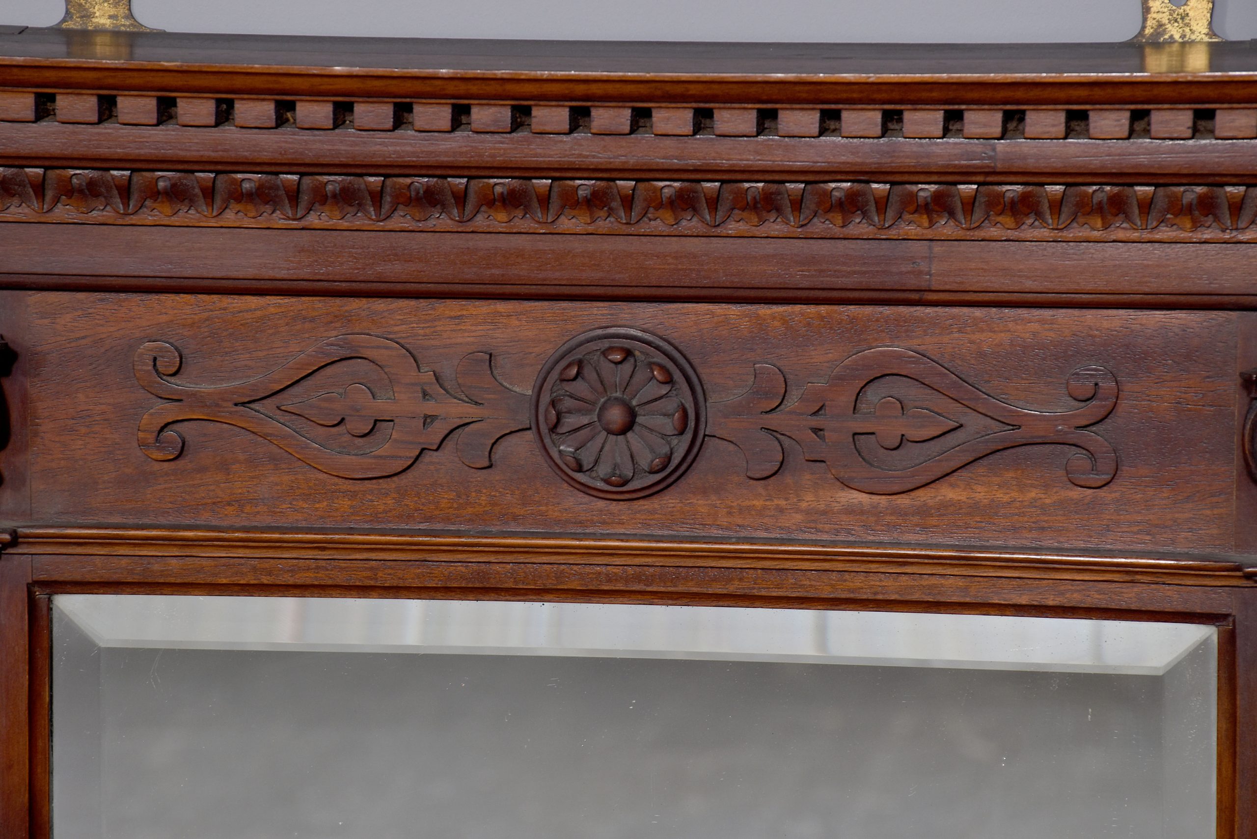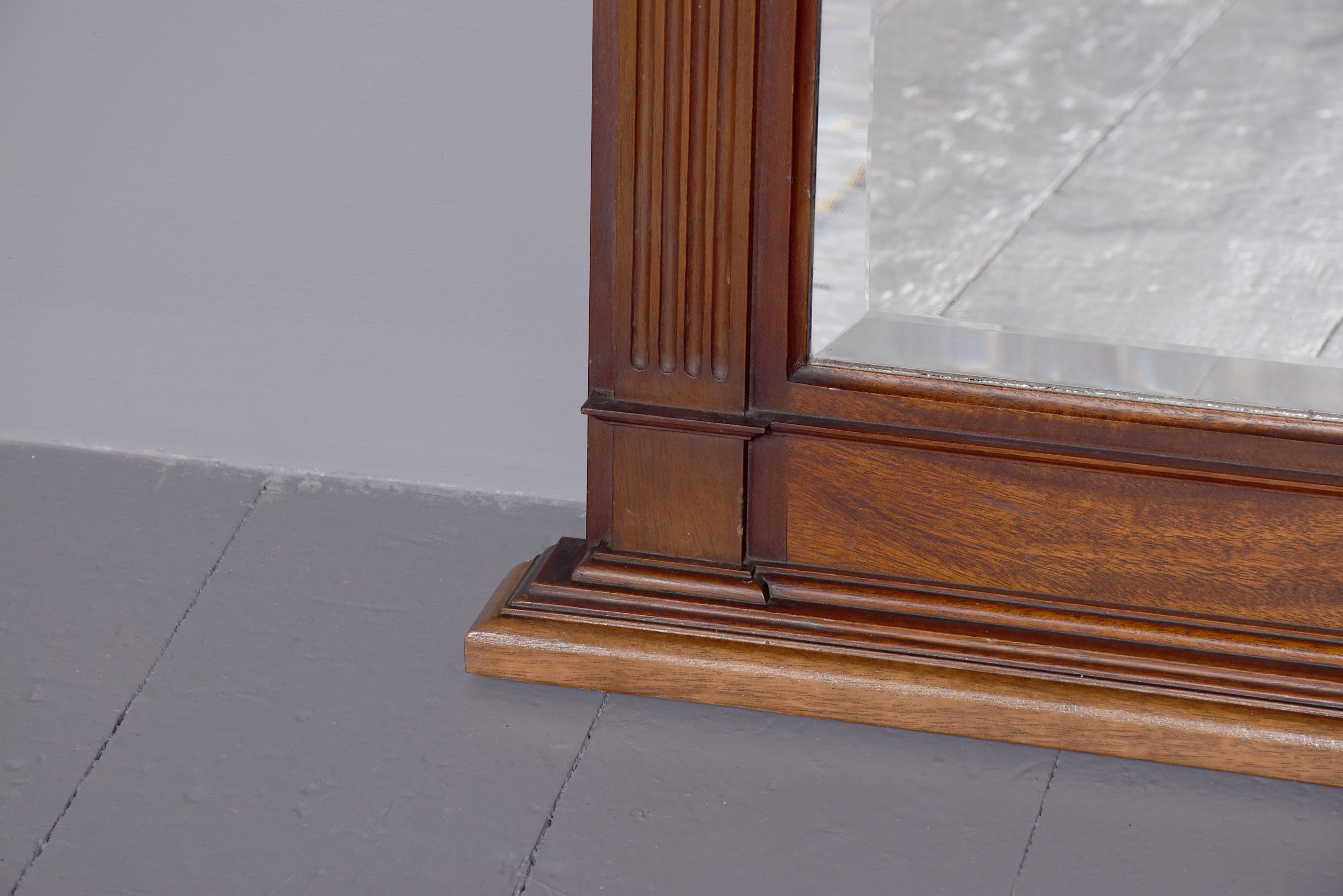 Circa 1890. A carved mahogany framed mirror, the stylish cornice with dentil carving beneath, the frieze with a carved flower head flanked by fretwork, the bevel edge mirror contained in a mahogany frame, with a pair of ribbed pilasters each side headed by stylish capitals, the base with a plain panel with mouldings.