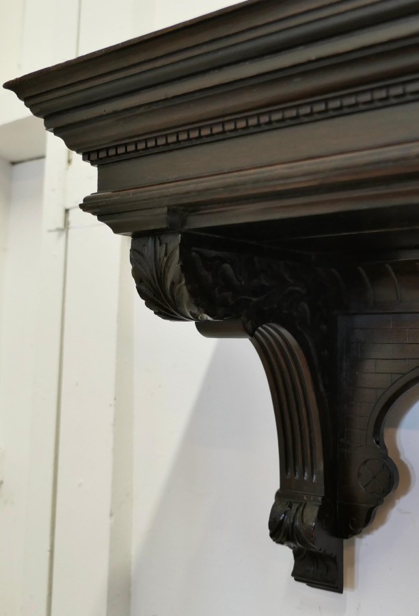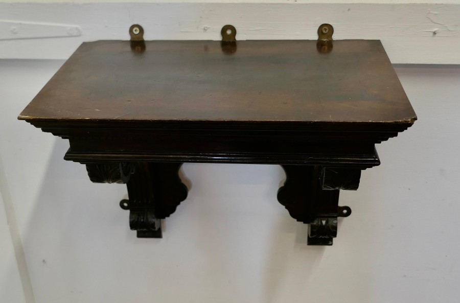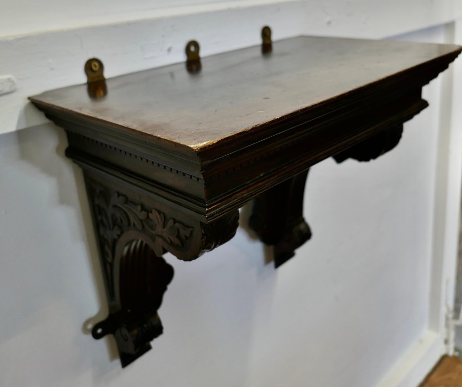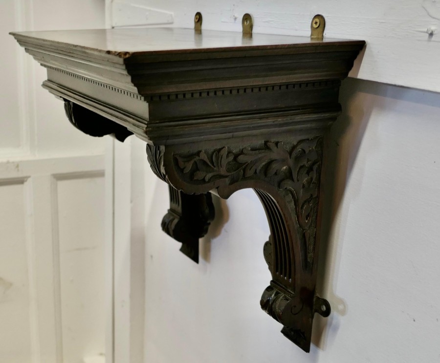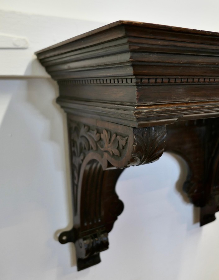 Carved Oak Gothic Wall Bracket Shelf This is a Magnificent and quite Large piece of 19th Century carved oak, it is a wall bracket or shelf The bracket is a heavy piece and comes with 5 wall bracket fixings, it is beautifully carved The top platform of the shelf has a moulded and carved edge The bracket is 18” wide, 16” tall and 11” deep VY154 Manufacture Date : 19th Century Materials : Oak