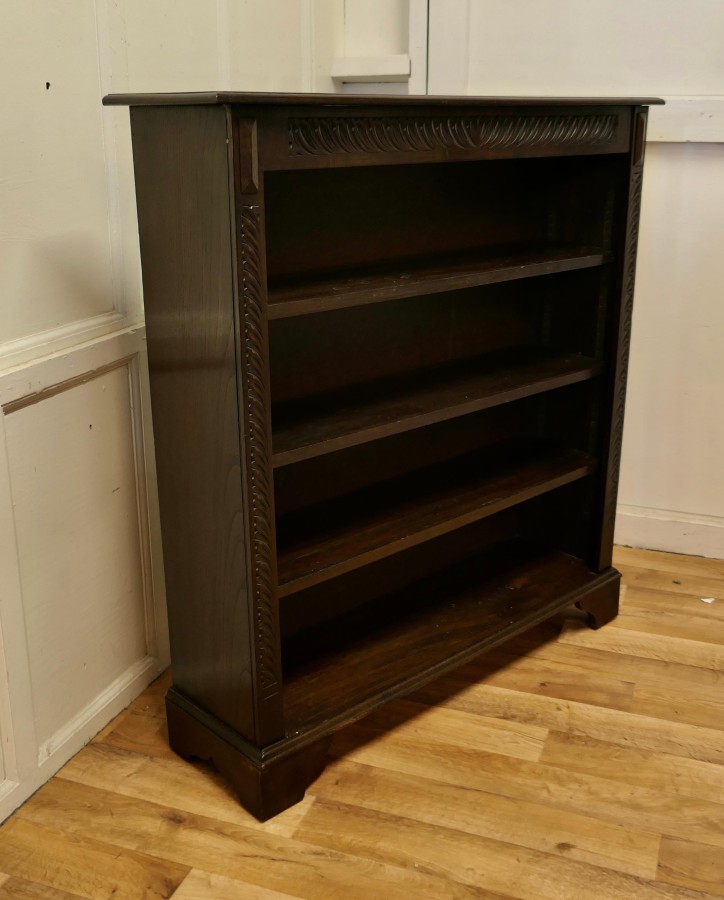 Carved Oak Open bookcase. The bookcase is good quality, with attractive carving on the front, it has 3 adjustable shelves The bookcase is in excellent original condition and the shelves are adjustable This excellent piece of Oak Furniture would work very well in your Living room, Office or study The Bookcase is 45” wide, 42” high and it is 12” deep CC34. Manufacture Date : 1940 Materials : Oak