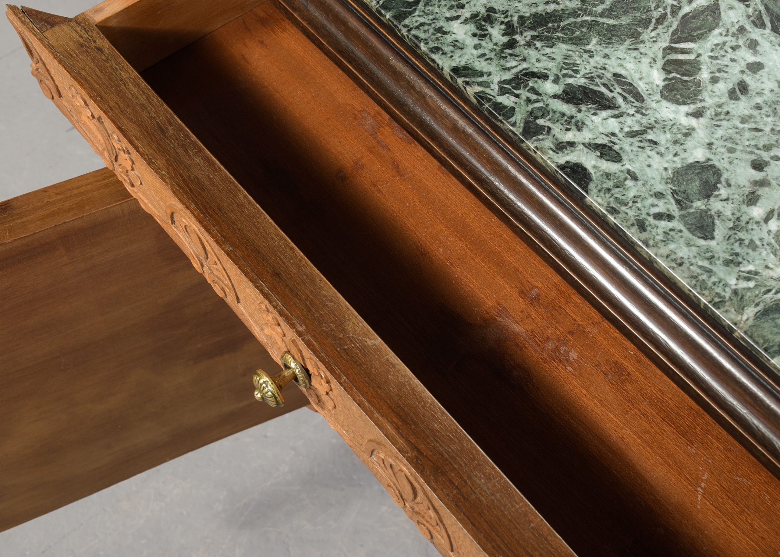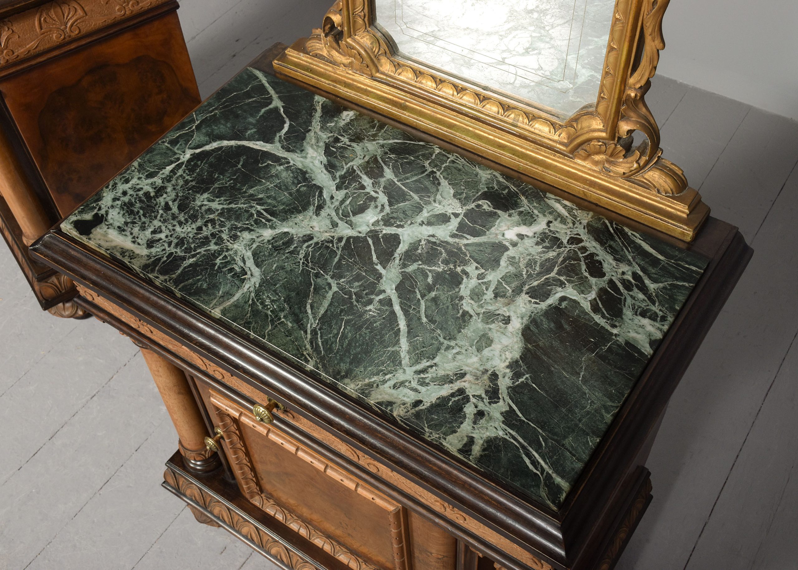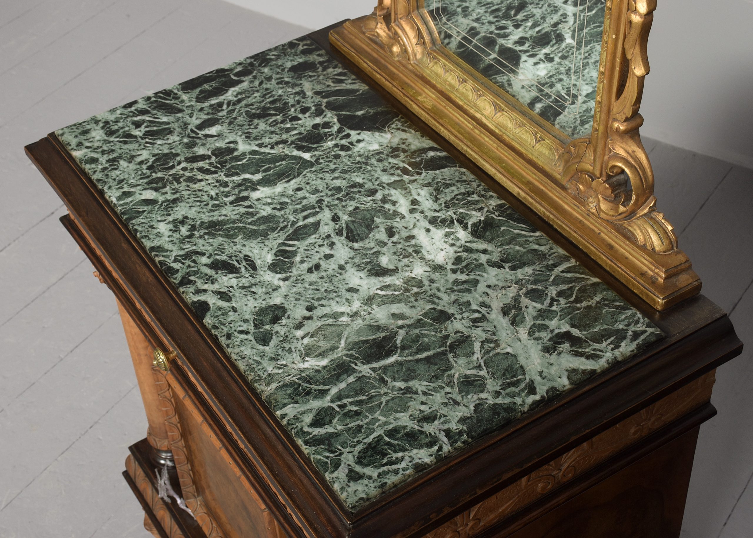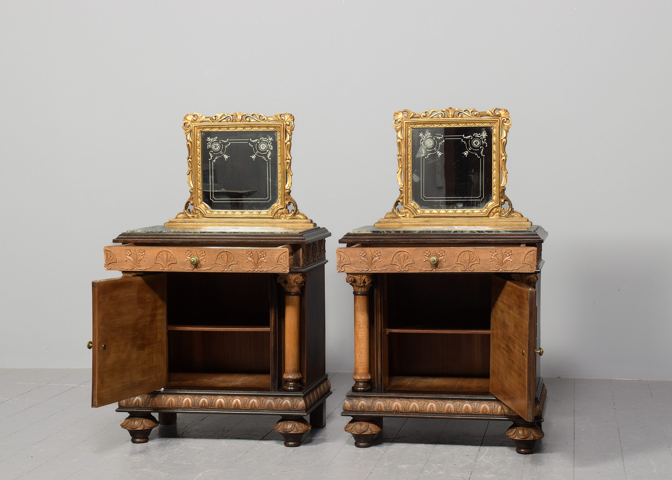 Circa 1930s. Very unusual stylish pair of carved walnut marble and gilded bedside pedestals, the tops with green mottled marble insert with a gilded frame mirror to the back, with etching on the mirror and gilded pierced frame with foliate carving, the front with a full-length drawer which is profusely carved with foliate carving which continues around the sides, beneath this a panel door flanked by a pair of Corinthian columns with carved capitals and bases, beneath with foliate carving on the front and sides, framed with a simple beading, resting on square legs at the back with a pair of carved turned and fluted legs to the front.