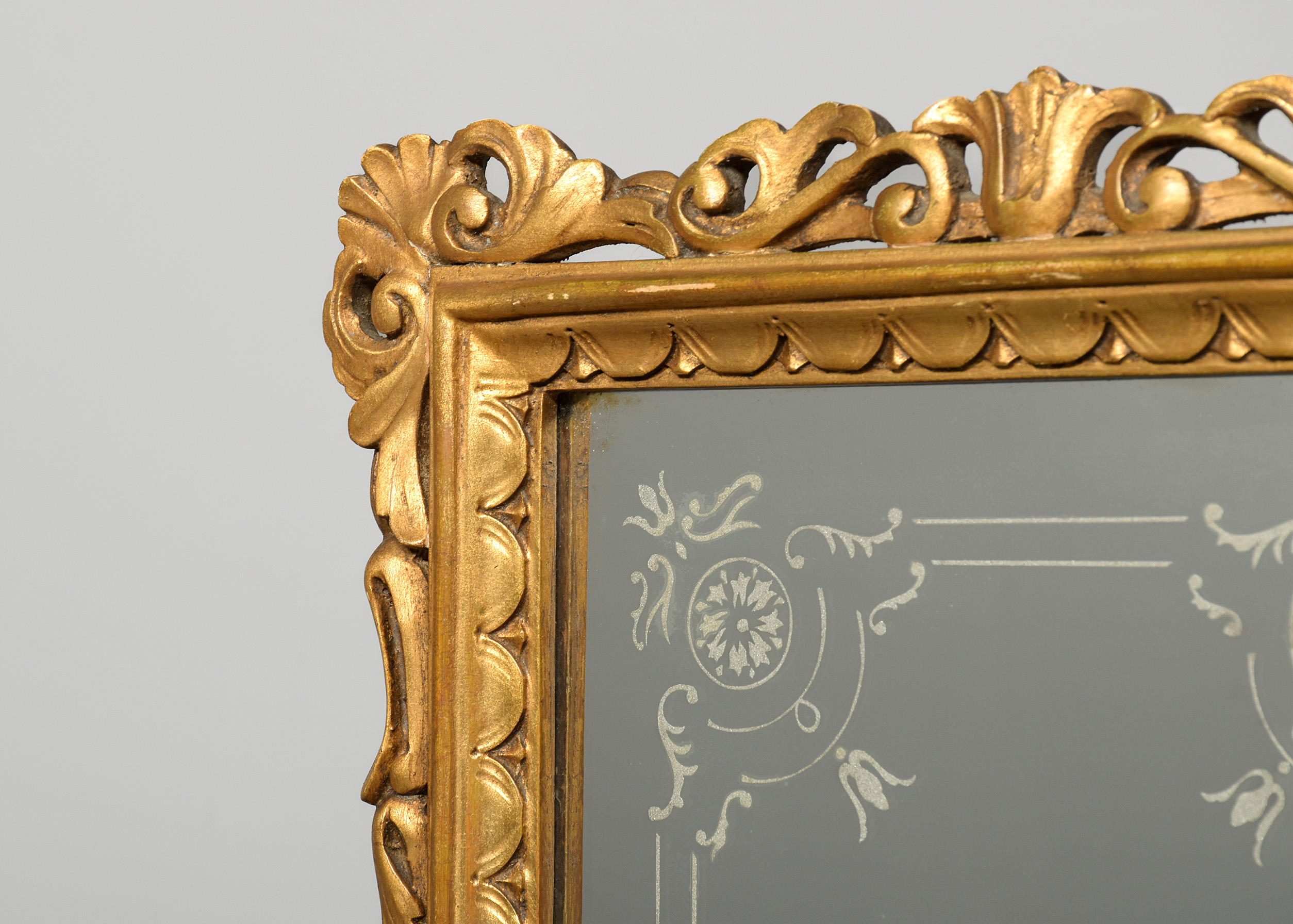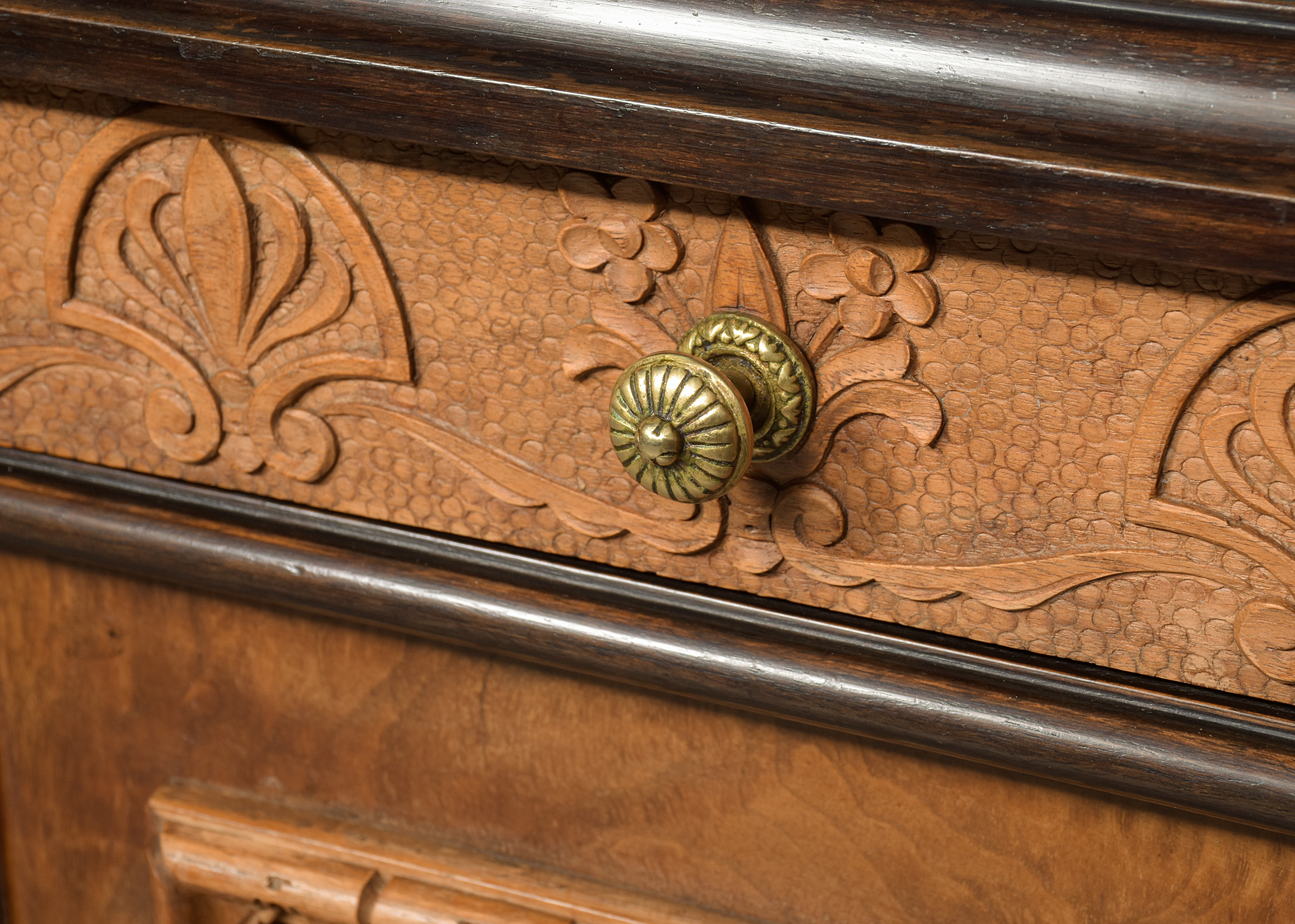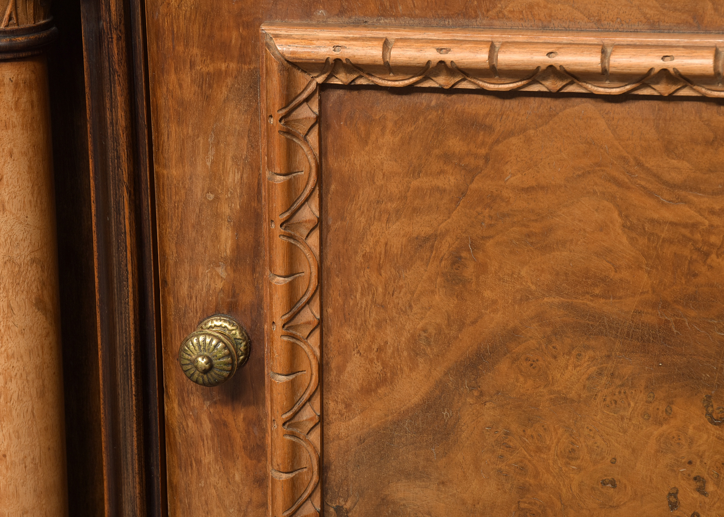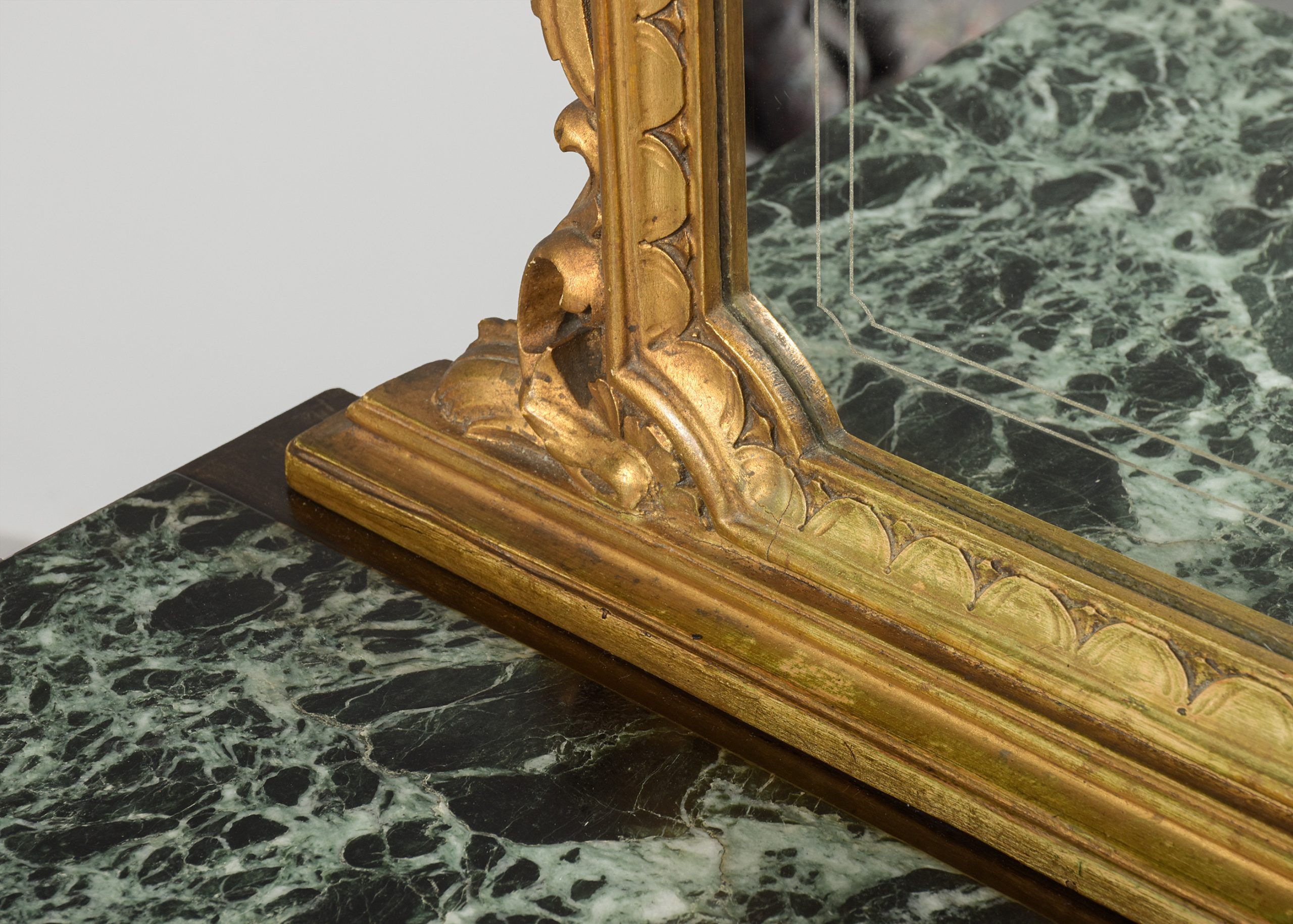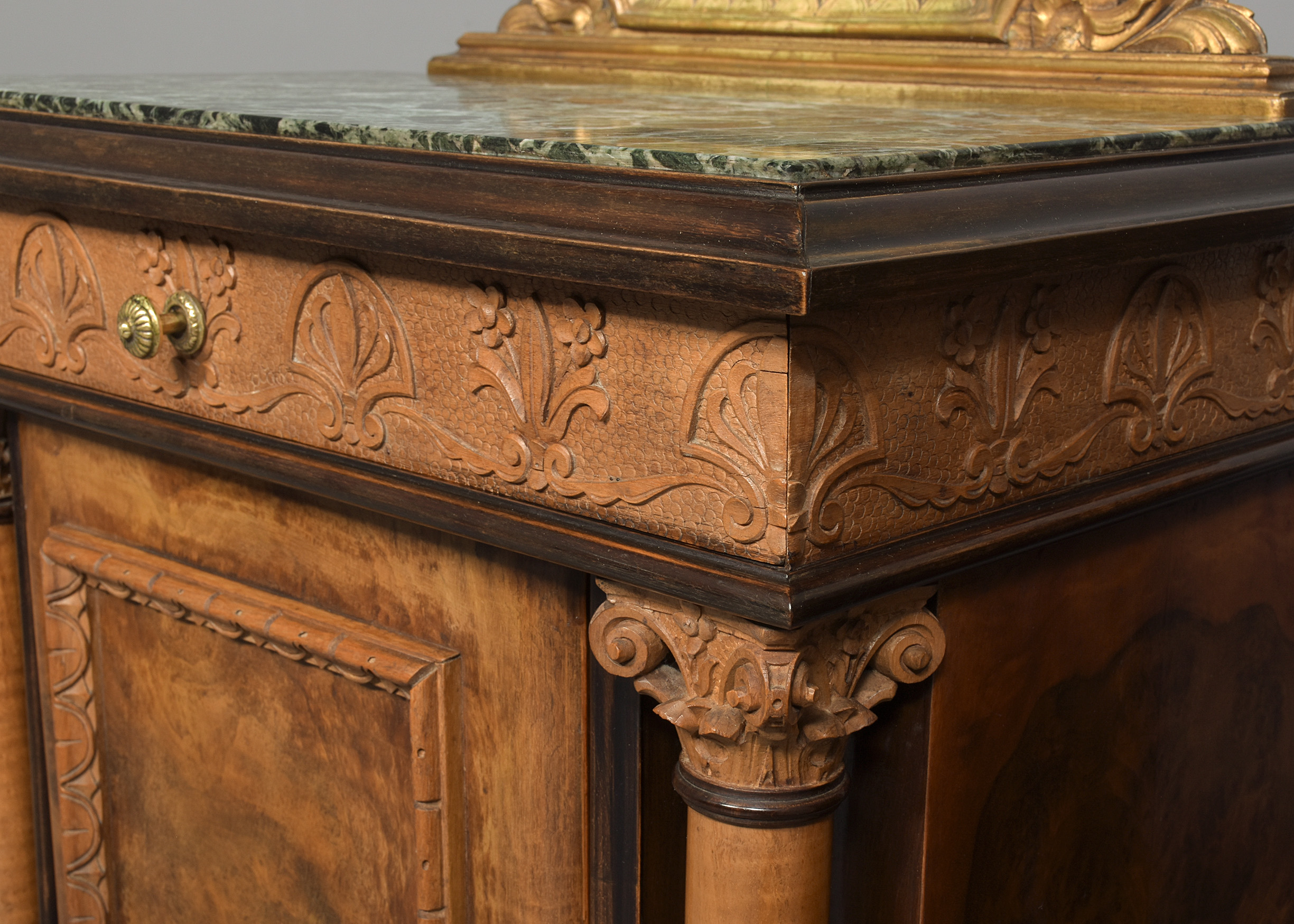 Circa 1930s. Very unusual stylish pair of carved walnut marble and gilded bedside pedestals, the tops with green mottled marble insert with a gilded frame mirror to the back, with etching on the mirror and gilded pierced frame with foliate carving, the front with a full-length drawer which is profusely carved with foliate carving which continues around the sides, beneath this a panel door flanked by a pair of Corinthian columns with carved capitals and bases, beneath with foliate carving on the front and sides, framed with a simple beading, resting on square legs at the back with a pair of carved turned and fluted legs to the front.