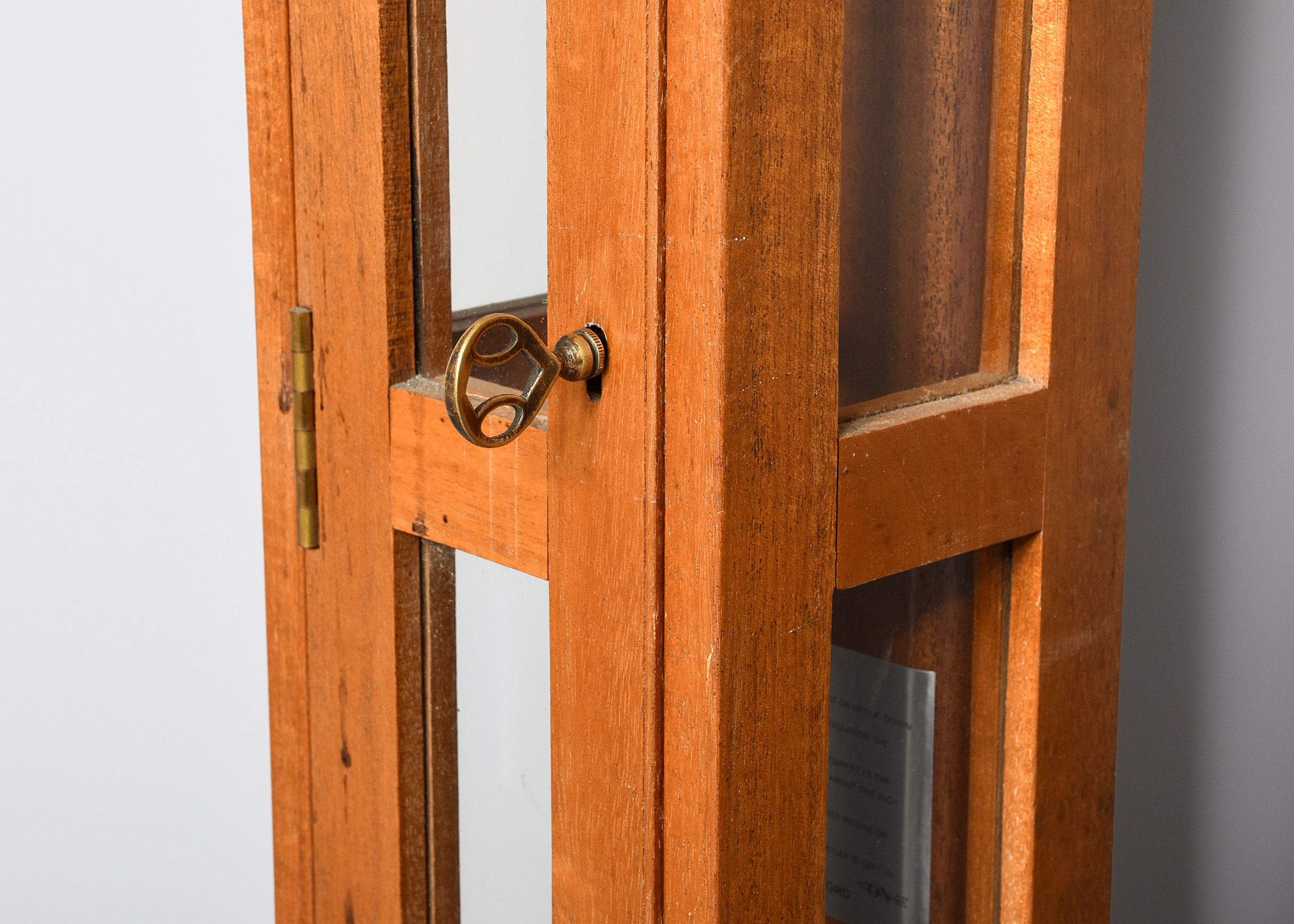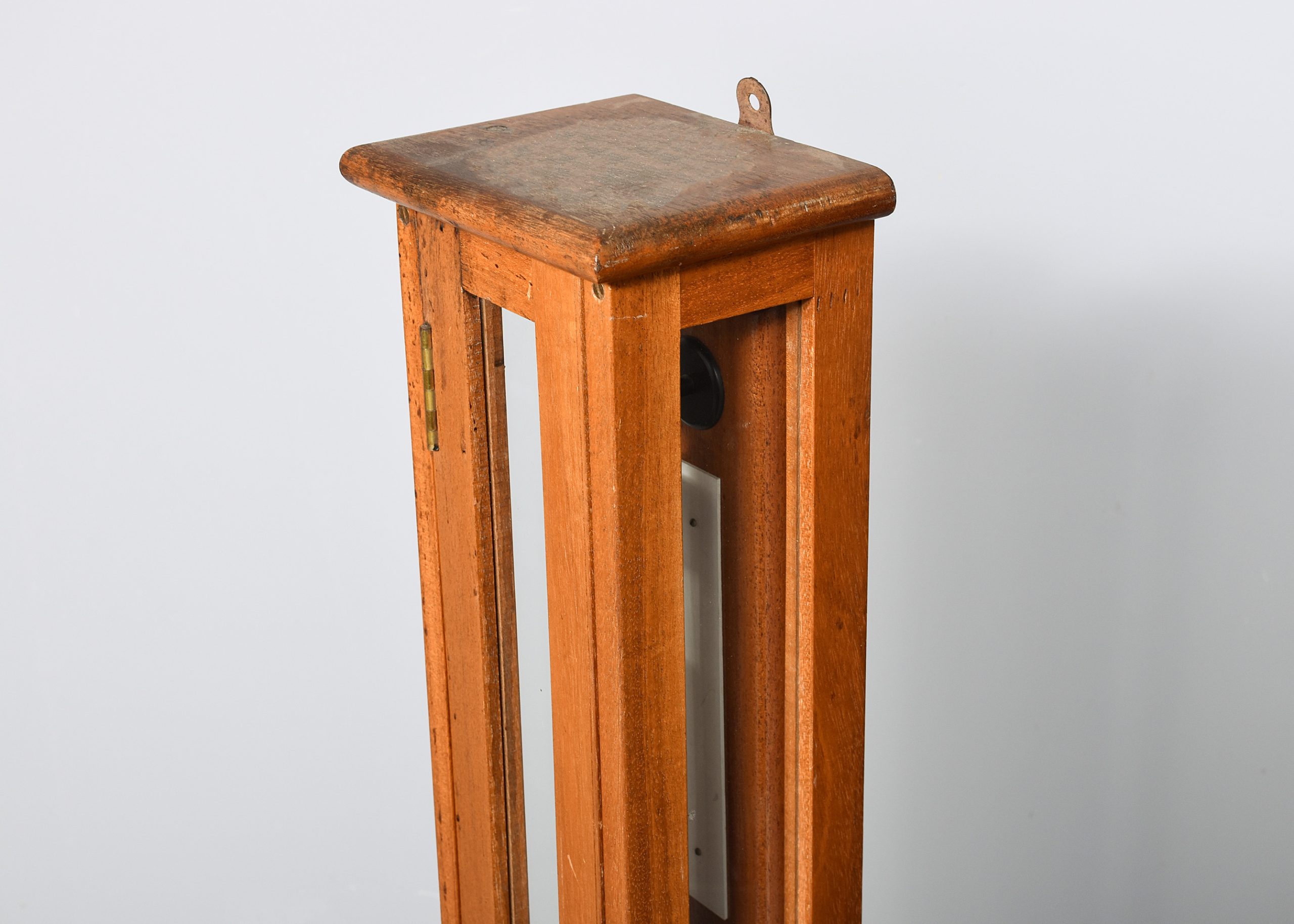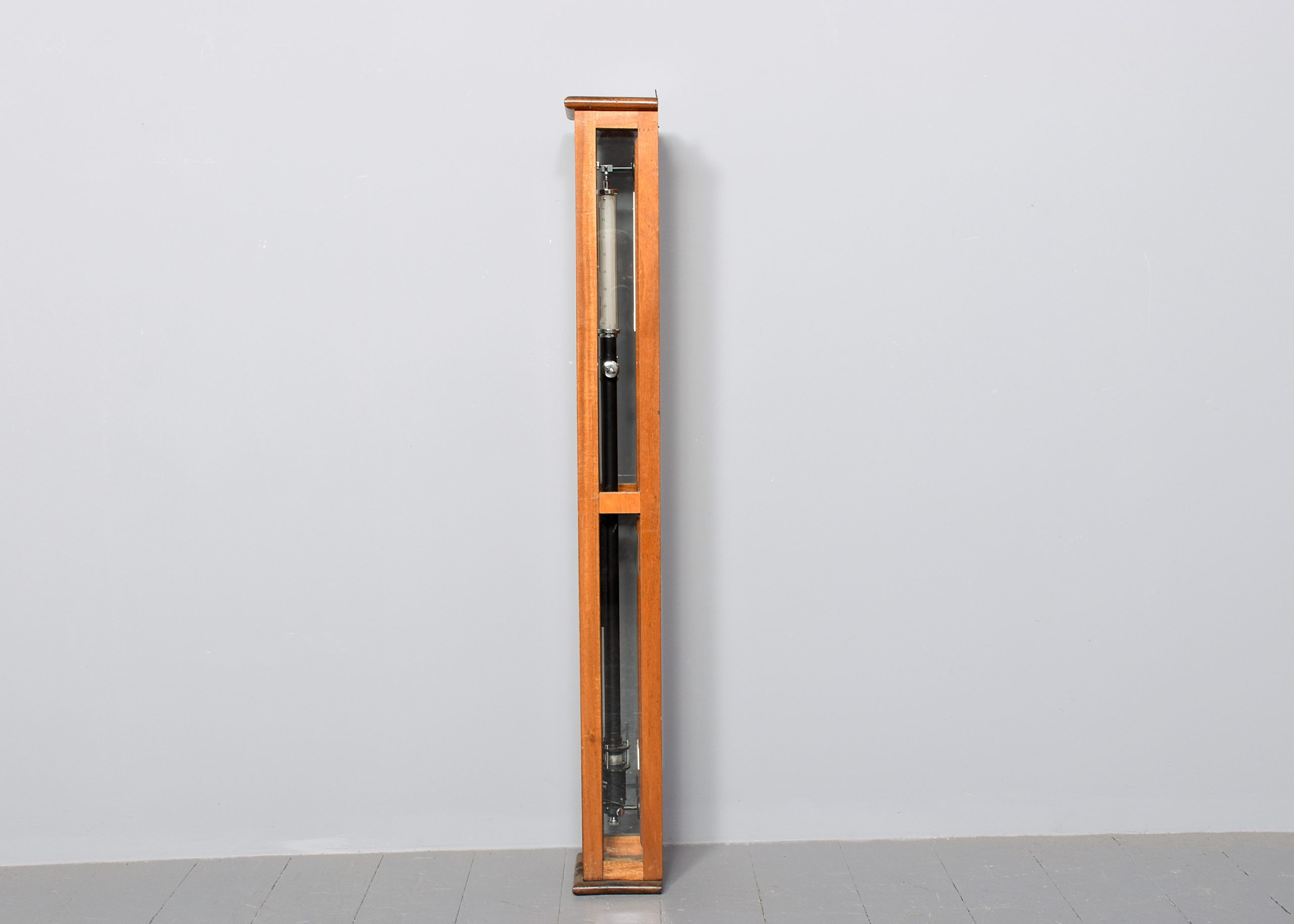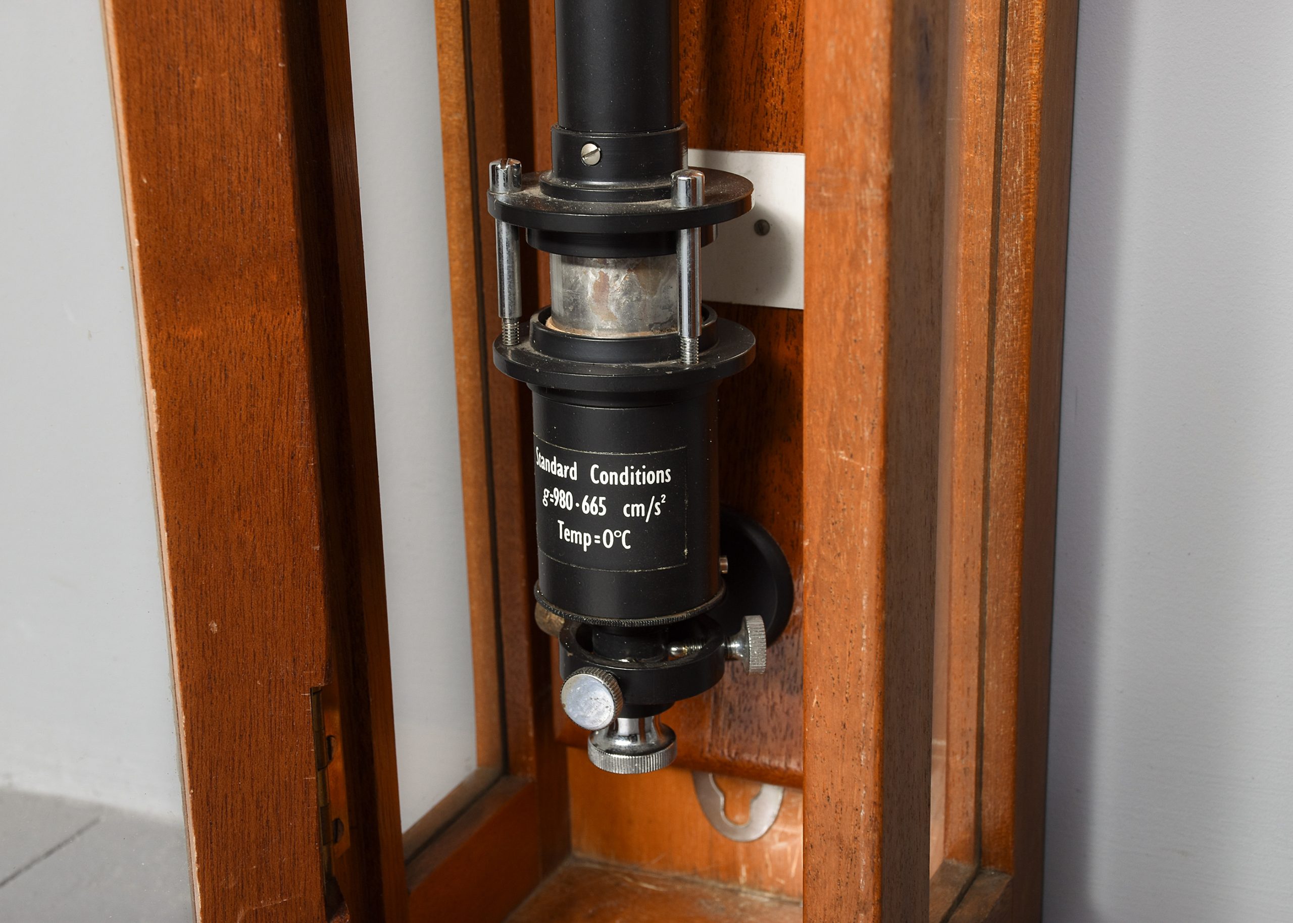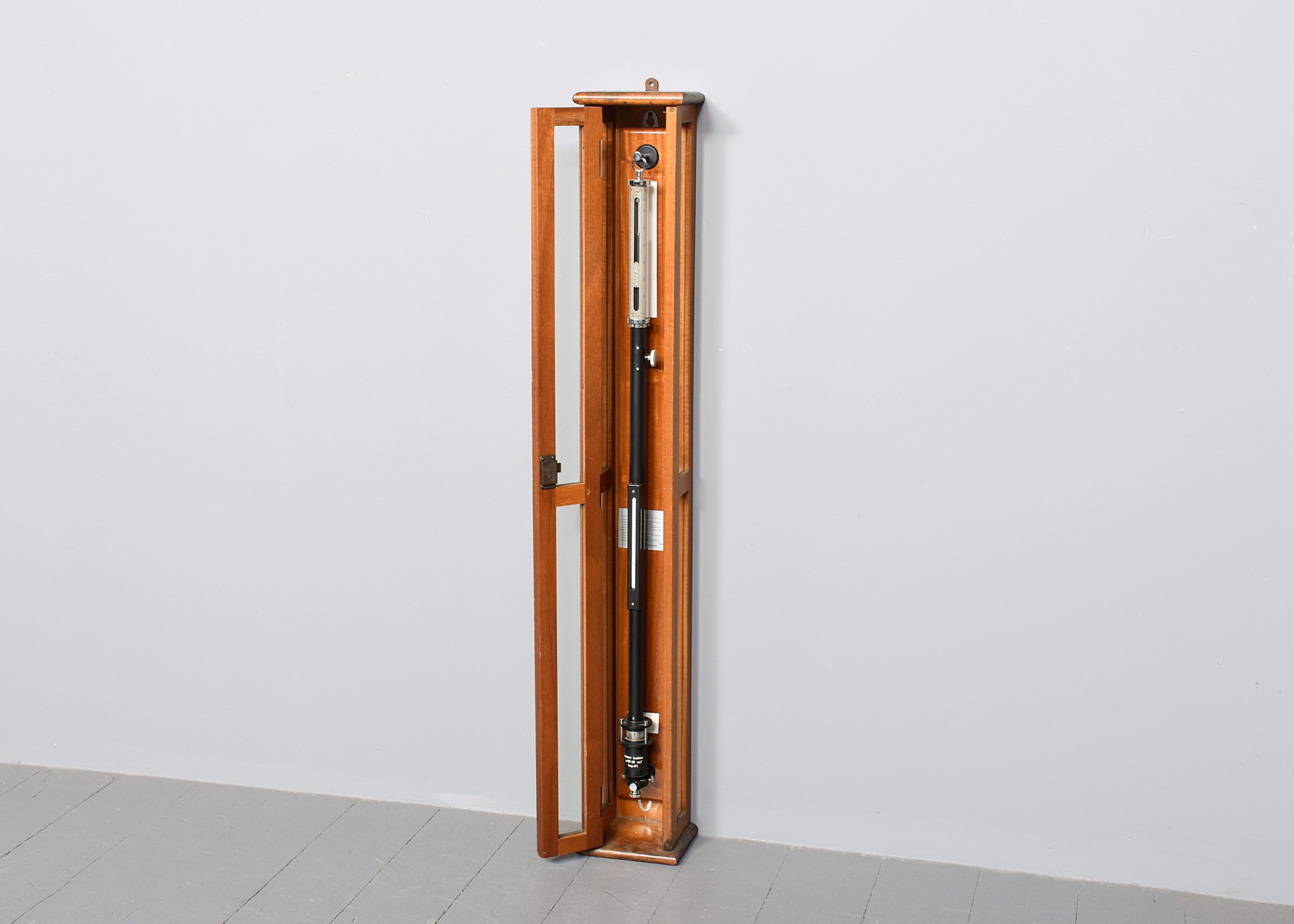 Circa 1930s. A cased industrial barometer/thermometer by ‘F. Darton & Sons. Watford’, the barometer with a circular glass and chrome top with the dials and mercury filled barometer showing, the ebonized metal body with thermometer on the front and reservoir in the bottom, mounted on a mahogany back plate contained within a three-sided glass hinged wall mounted case, the barometer has been calibrated recently.