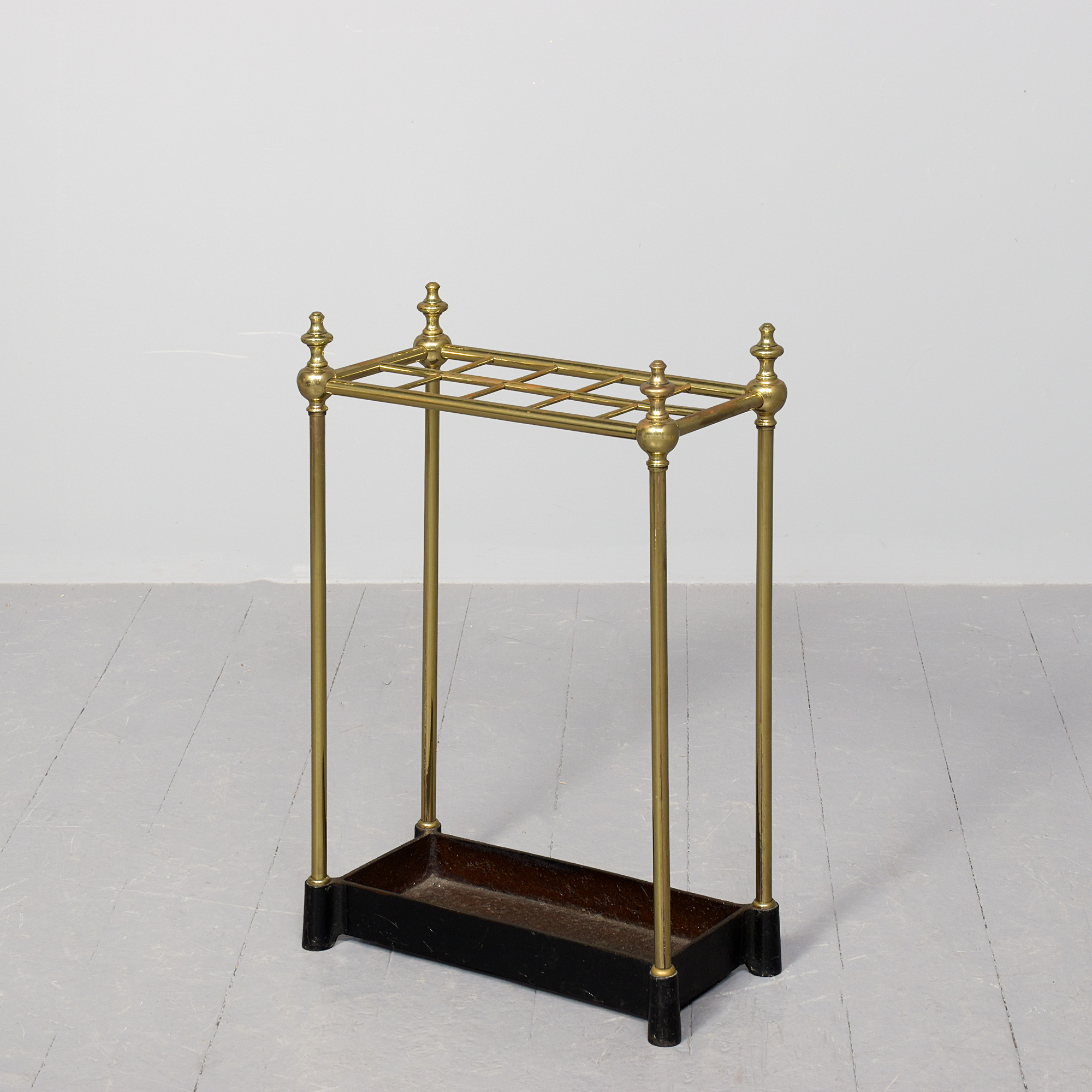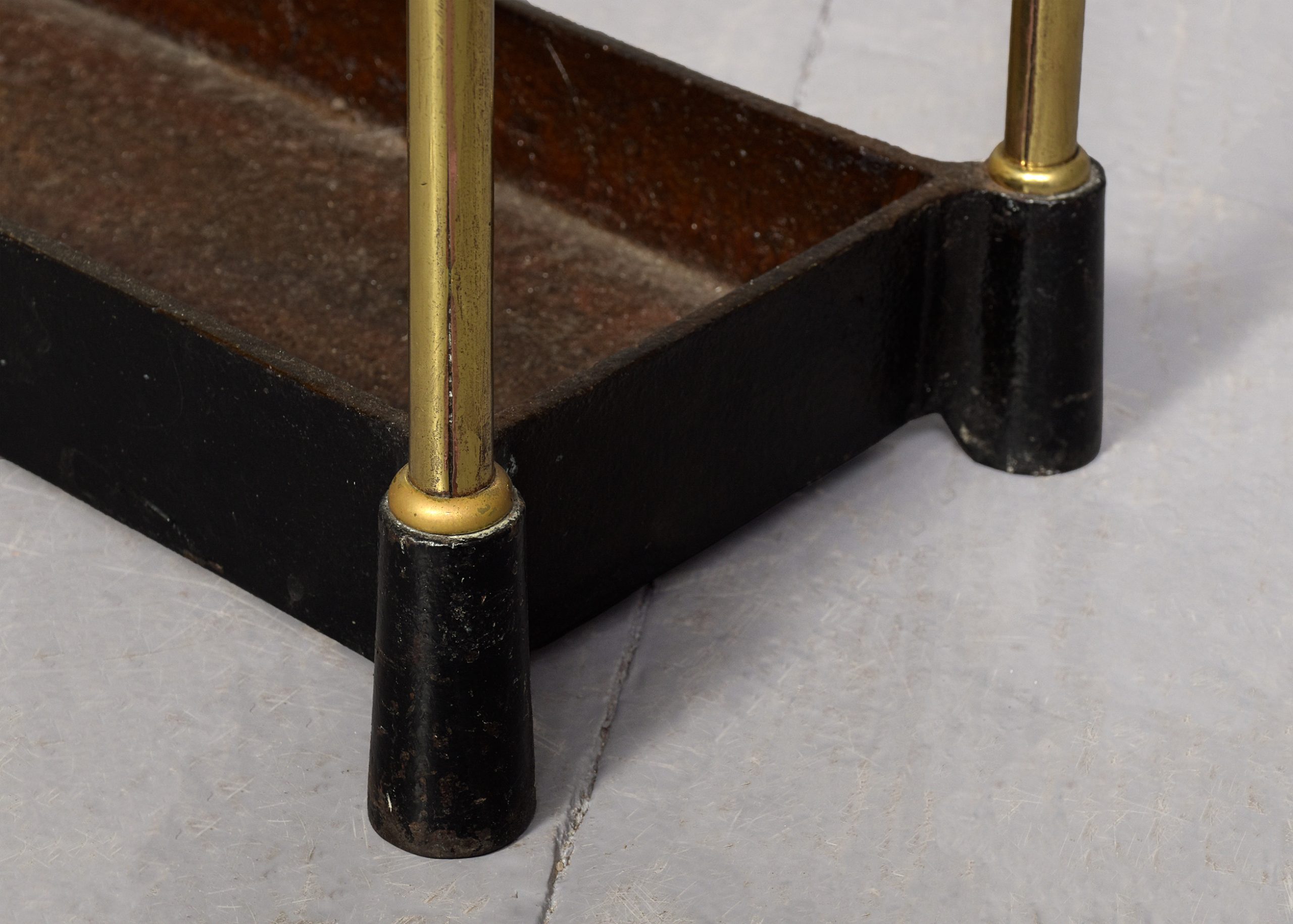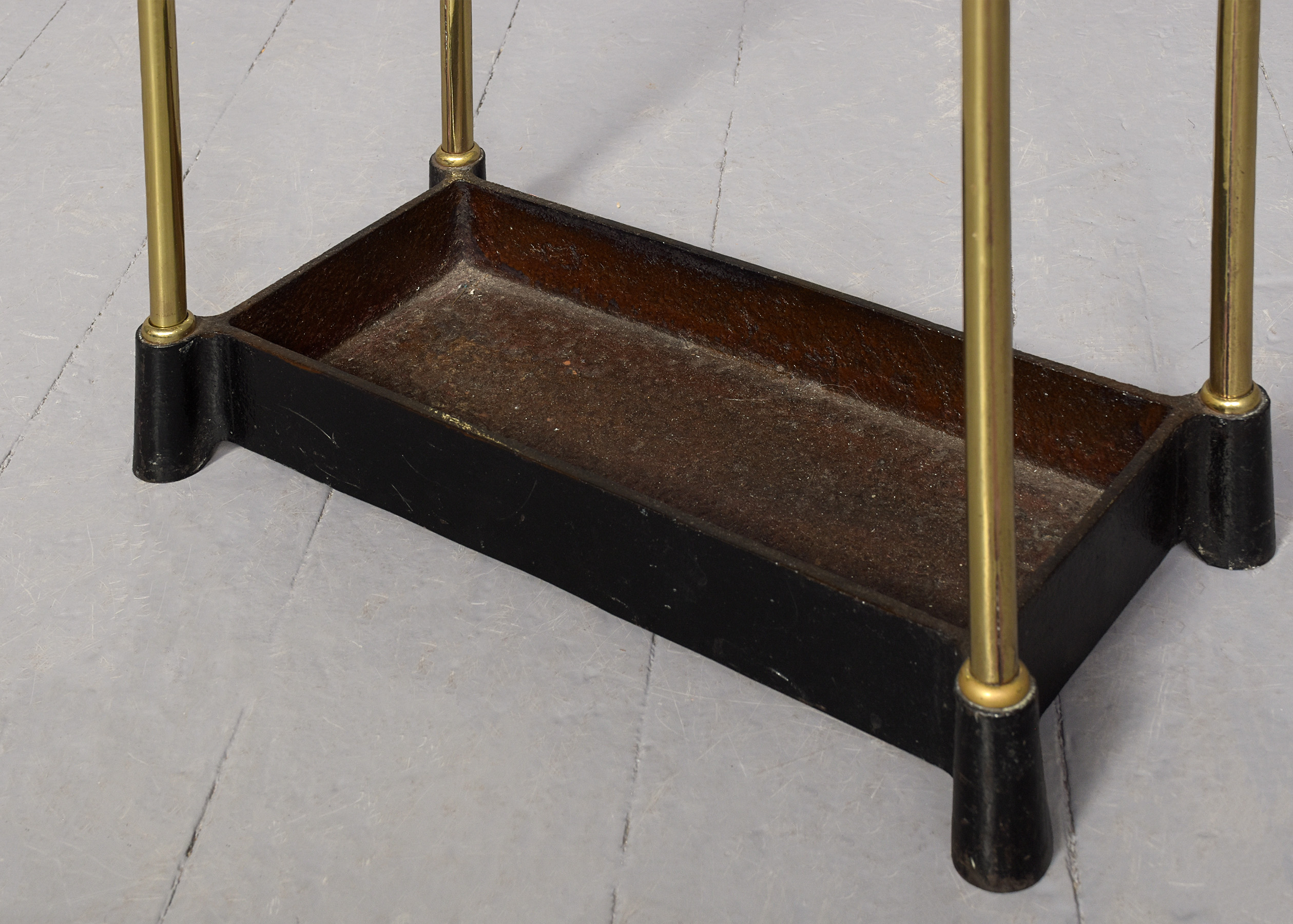 Circa 1860, a Victorian 10 division cast brass & Iron stick stand with 4 turned uprights surmounted with turned finials, resting on a cast iron drip pan.