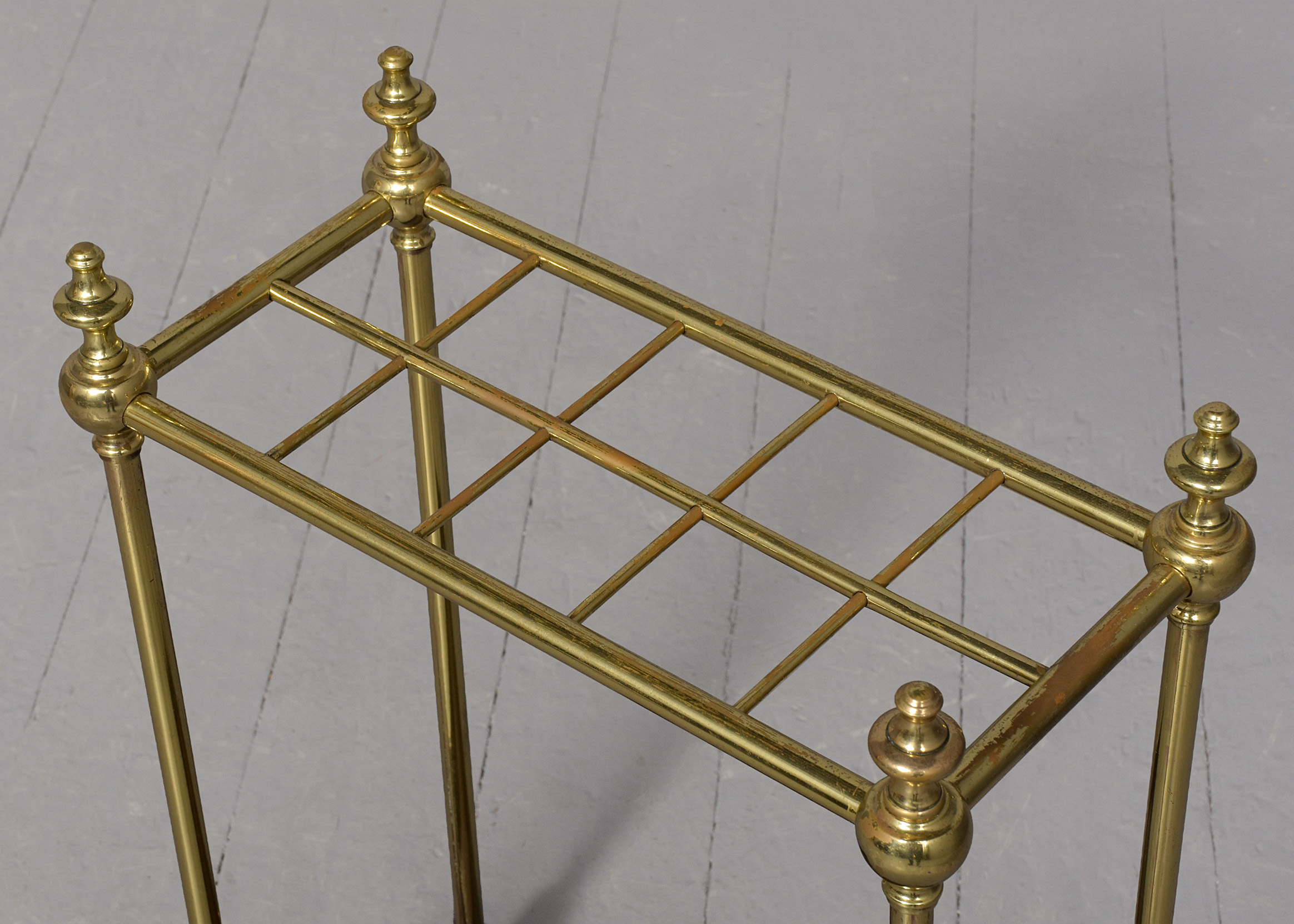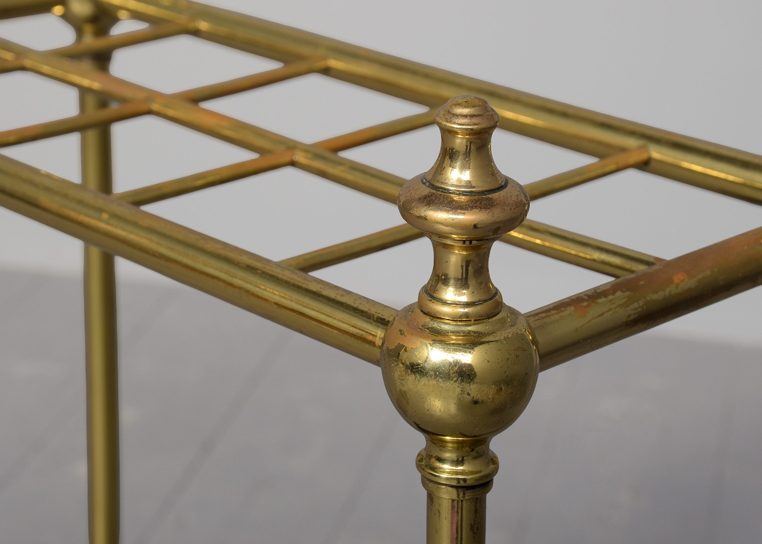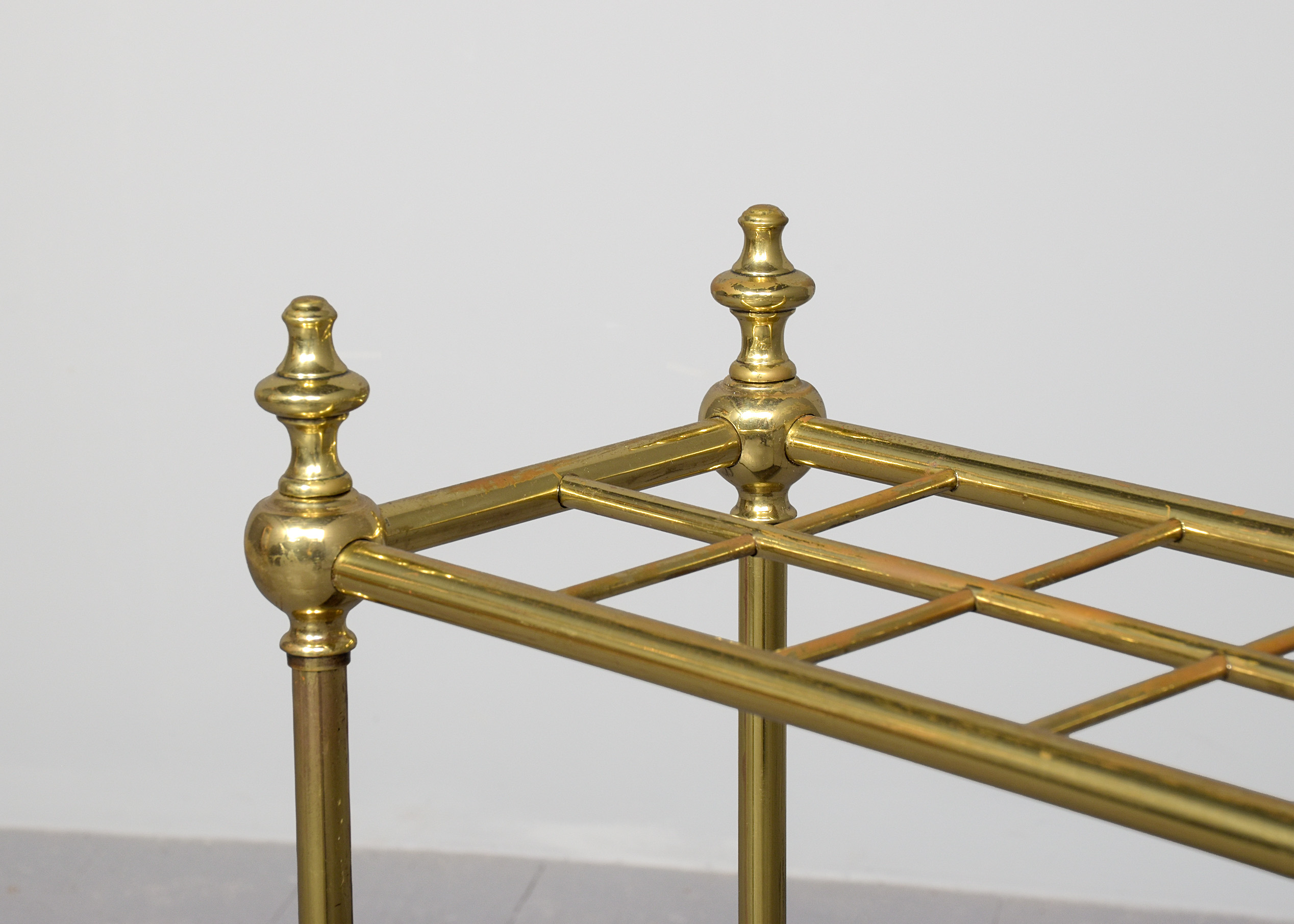 Circa 1860, a Victorian 10 division cast brass & Iron stick stand with 4 turned uprights surmounted with turned finials, resting on a cast iron drip pan.