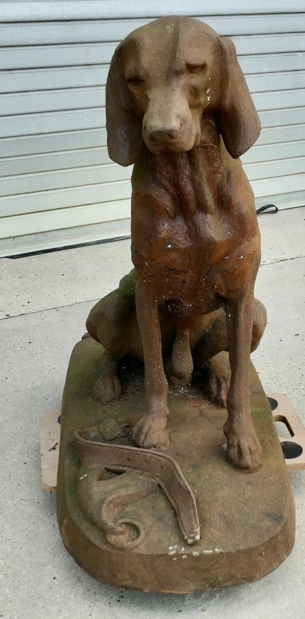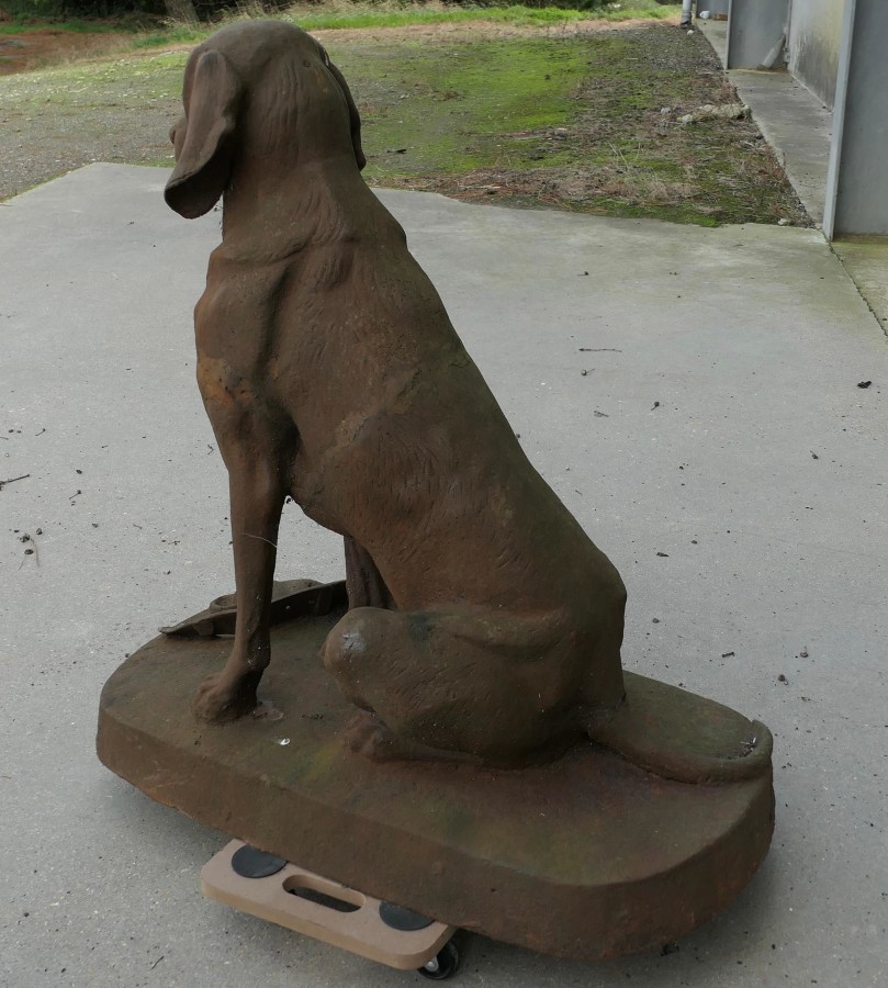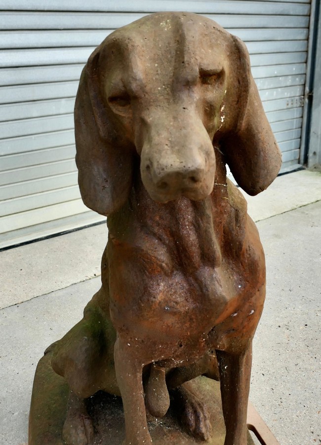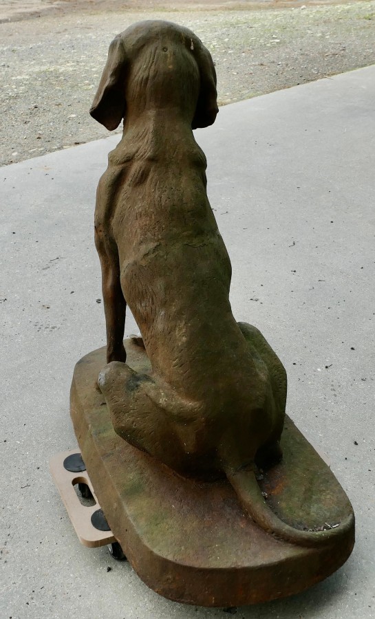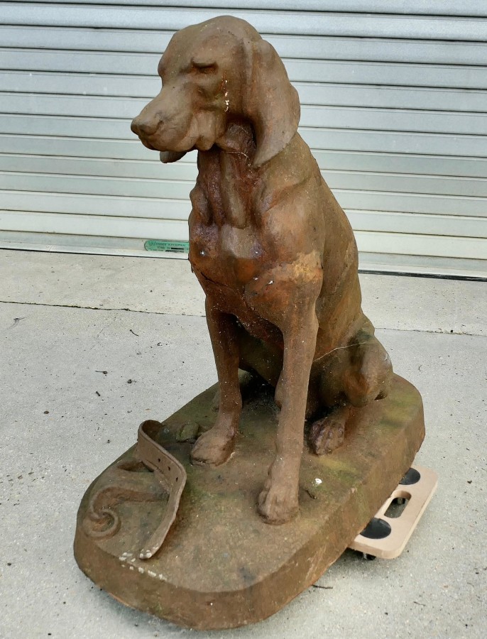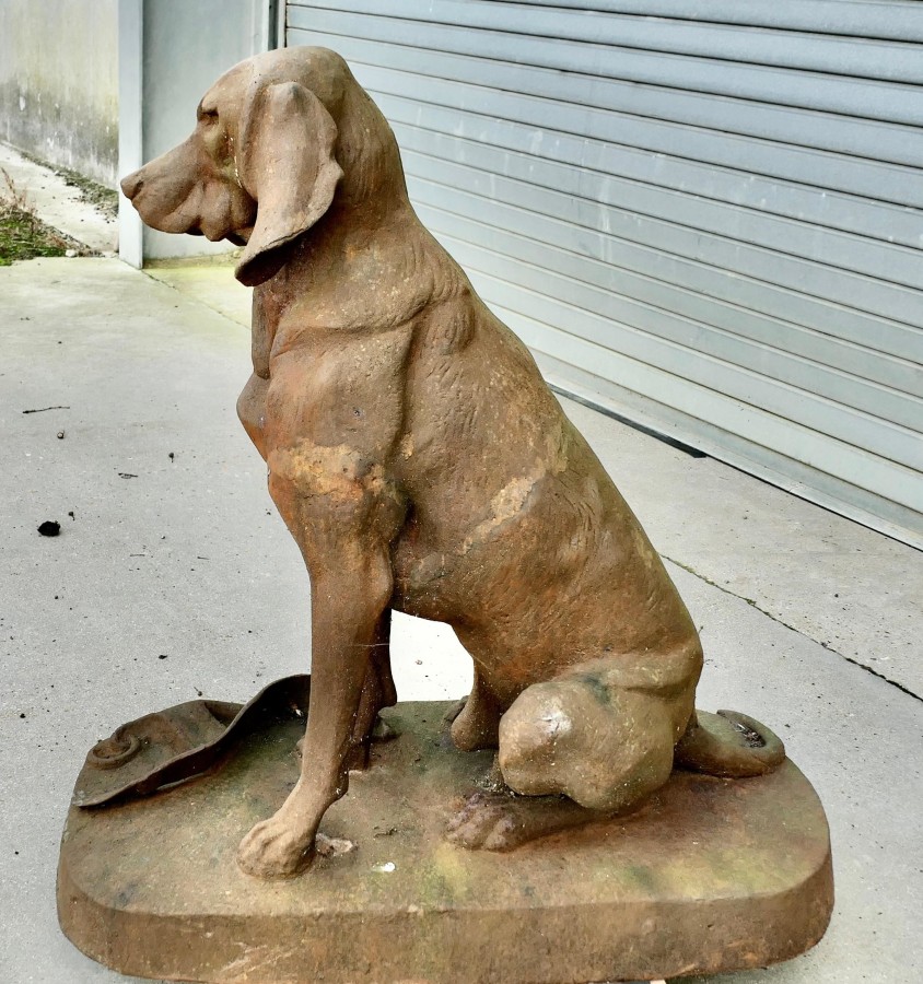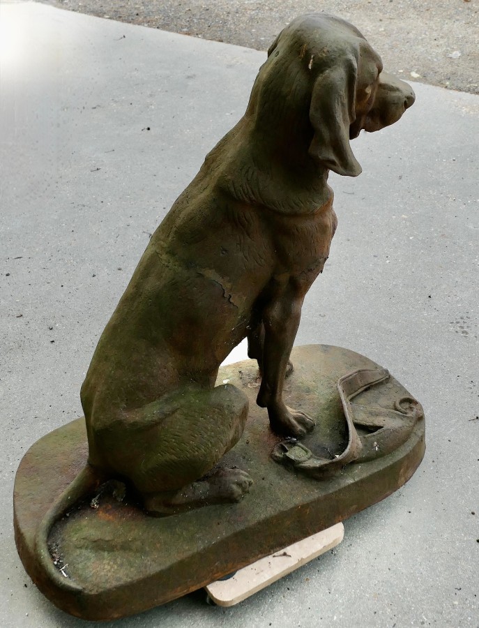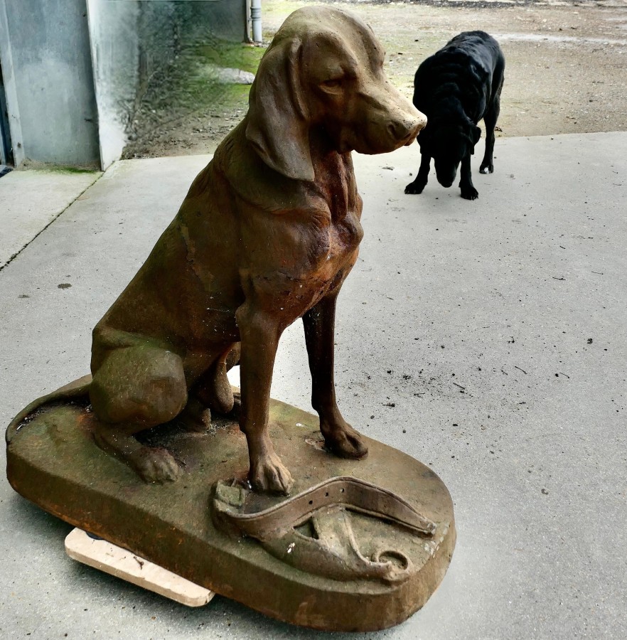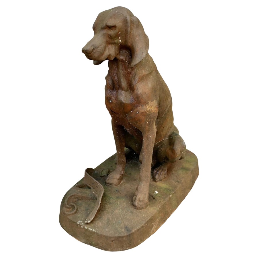 Cast Iron Statue of a Seated Hunting Dog A very serious Chap, he is sitting on a deep plinth he is fully 3 dimensional and looks good from all sides Our faithful hound is sitting waiting for the attention of his master with some harness at his feet The statue is in good condition with a weathered patina The Retriever is 36” high, the oval base is 36” long and 19” wide and needless to say very heavy, he weighs about 100kgs ZX41 Manufacture Date : 1960 Materials : Iron