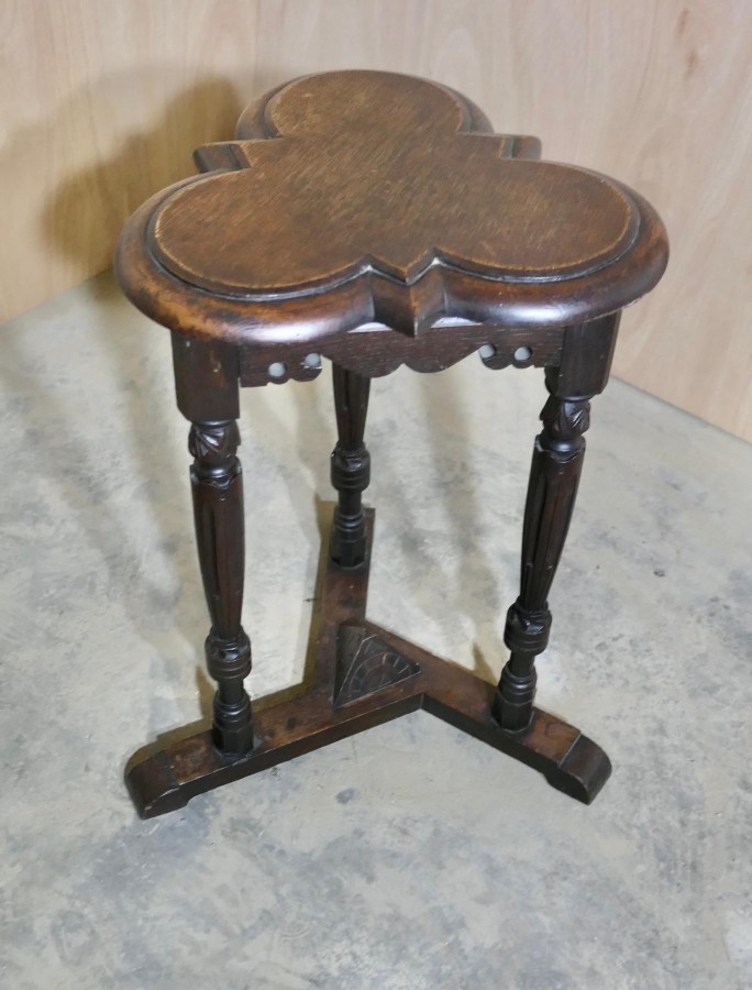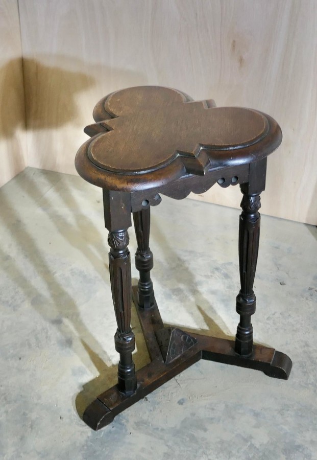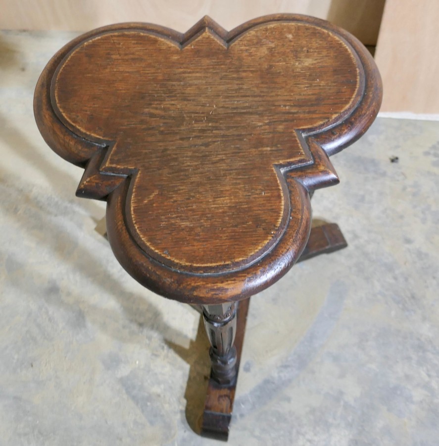 Celtic Gothic Oak Clover Leaf Table Elizabethan-Style Celtic Gothic Oak Clover Top Table, an enchanting piece Made in solid Oak in sound attractive condition The table is 23” high and 17” in diameter CS240 Manufacture Date : 19th century Materials : Oak