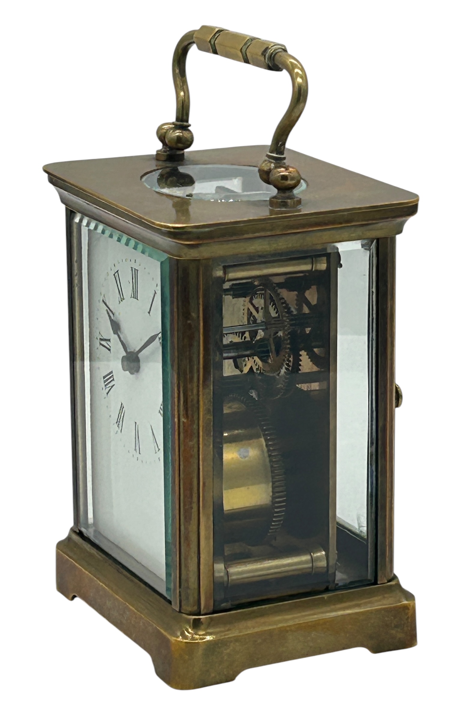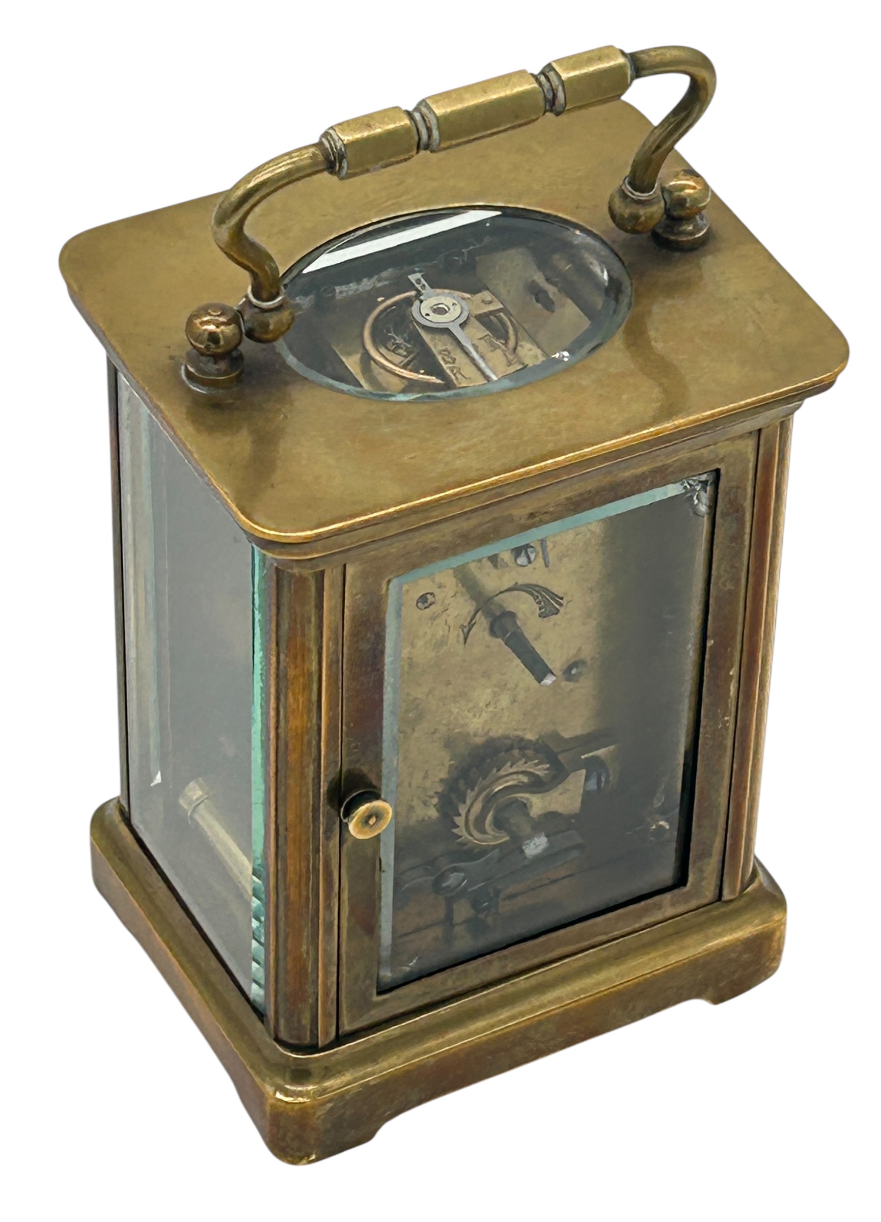 The clock is an 8-day French carriage clock. It keeps relatively good time and has a oval beveled viewing window to see the original platform balance in action.