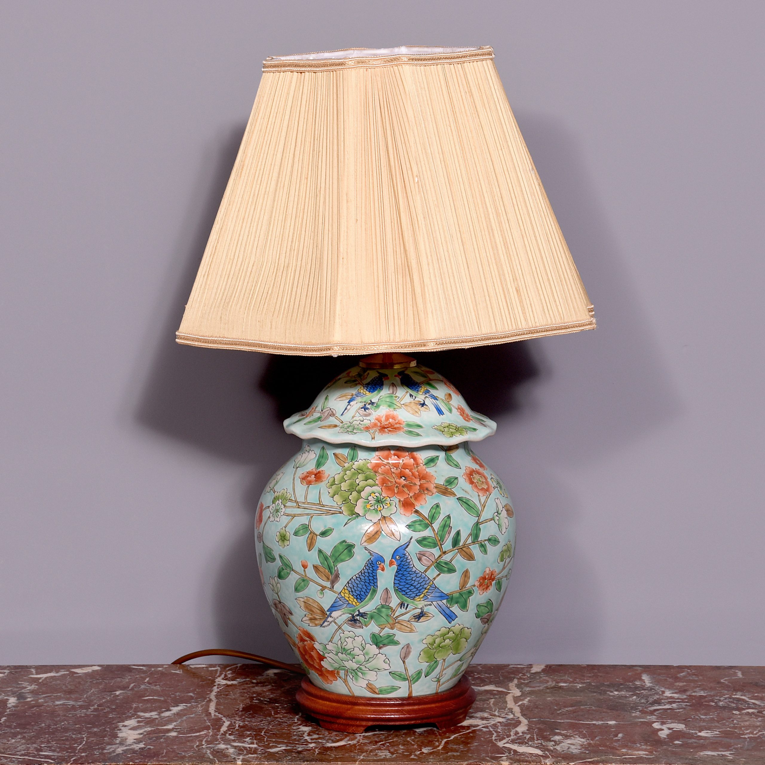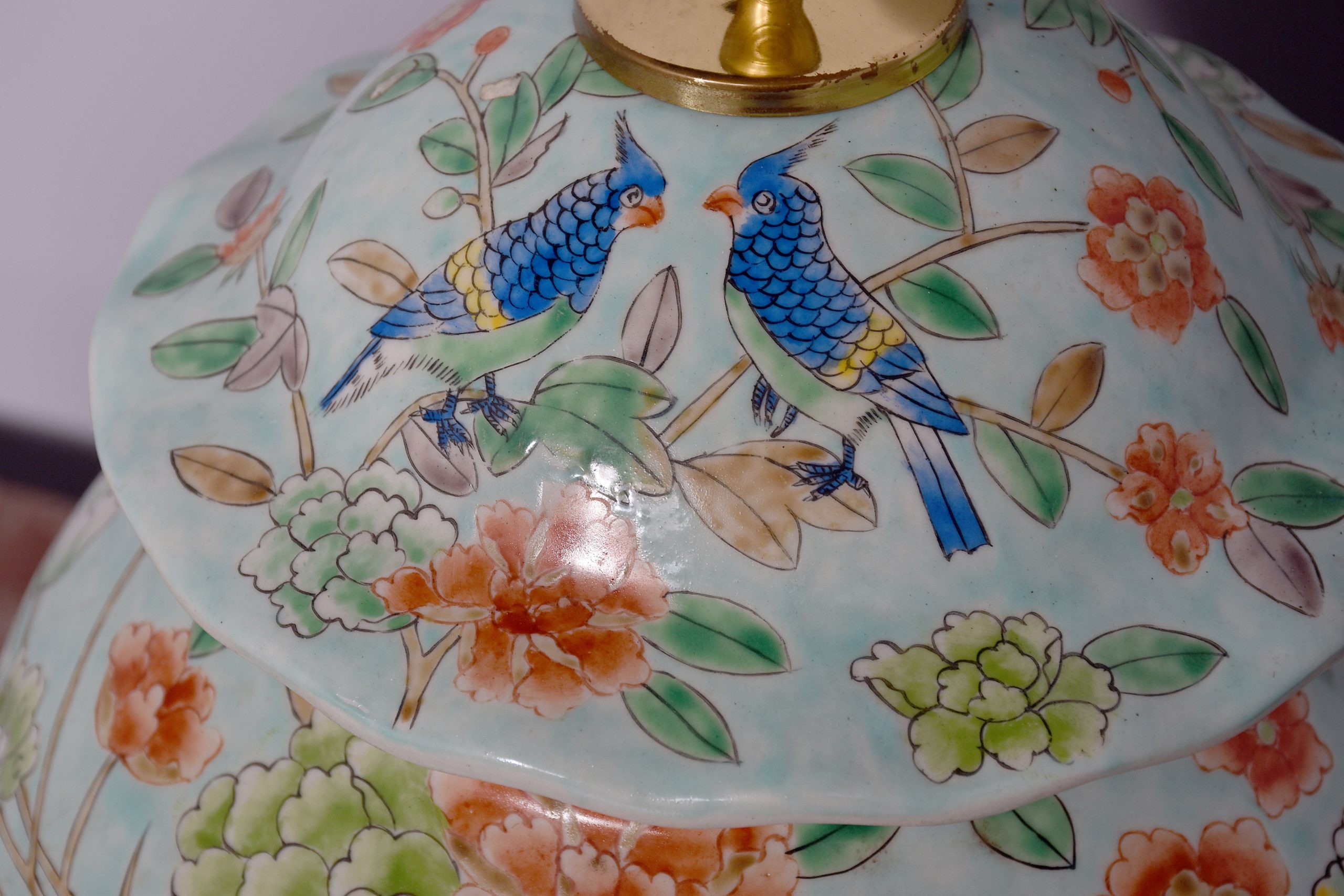 Circa Late1900’s Chinese Canton style lamp with a pale green background decorated with coloured foliage and parrots with brass electrical fittings.